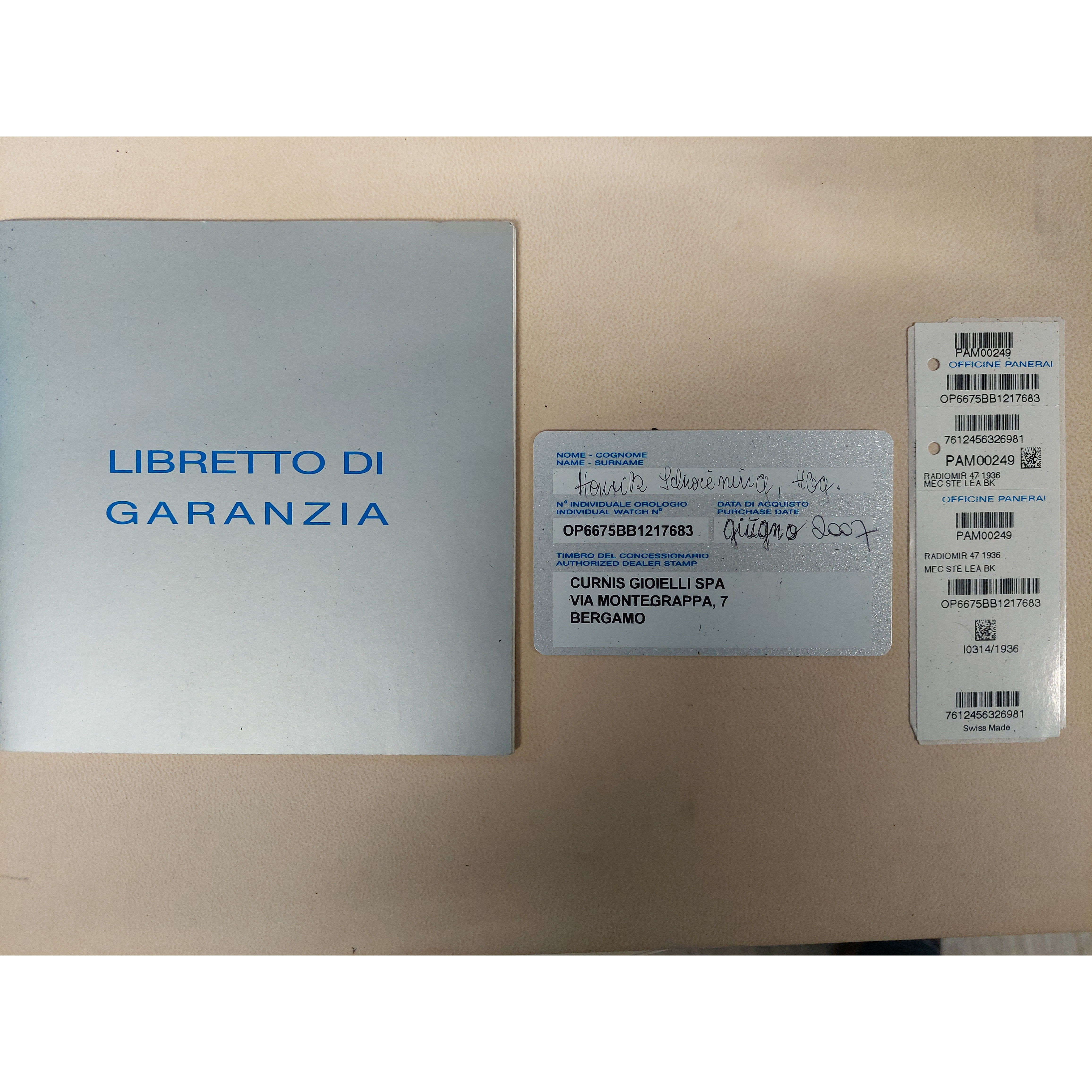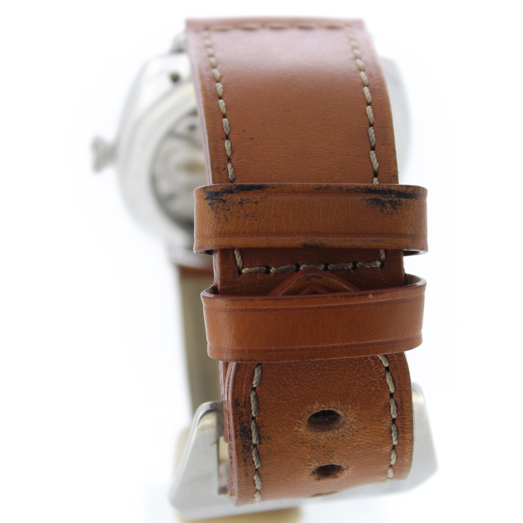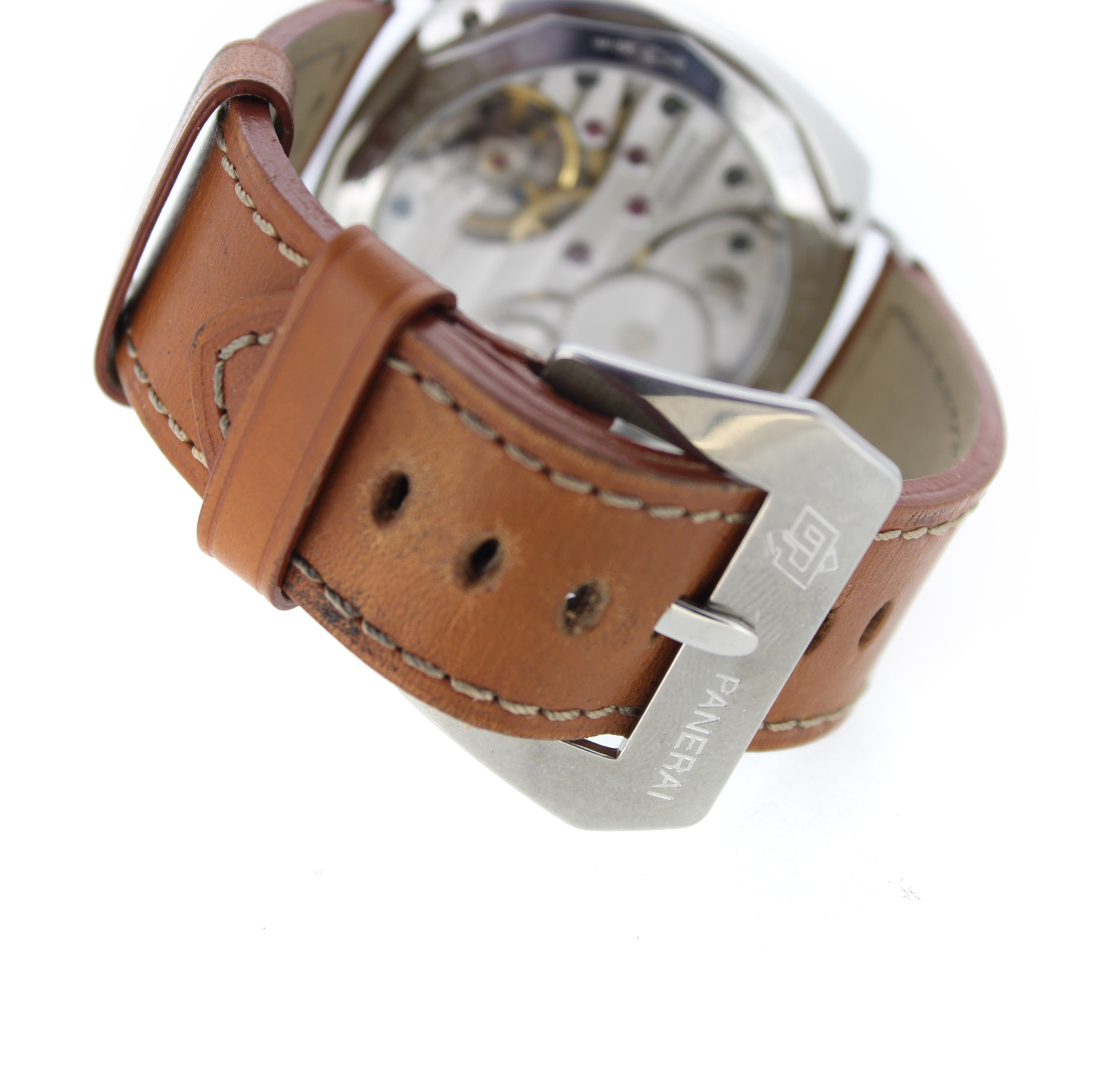 De pre-owned Panerai Radiomir 1936 Limited PAM 00249 horloge heeft een 47mm staal kast en bruin leren band en een zwarte wijzerplaat.
