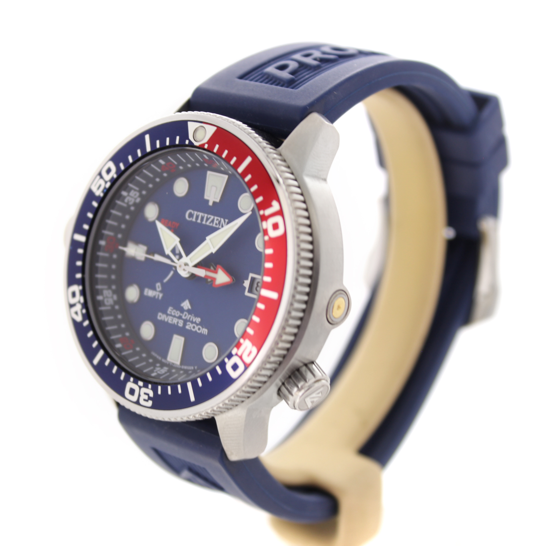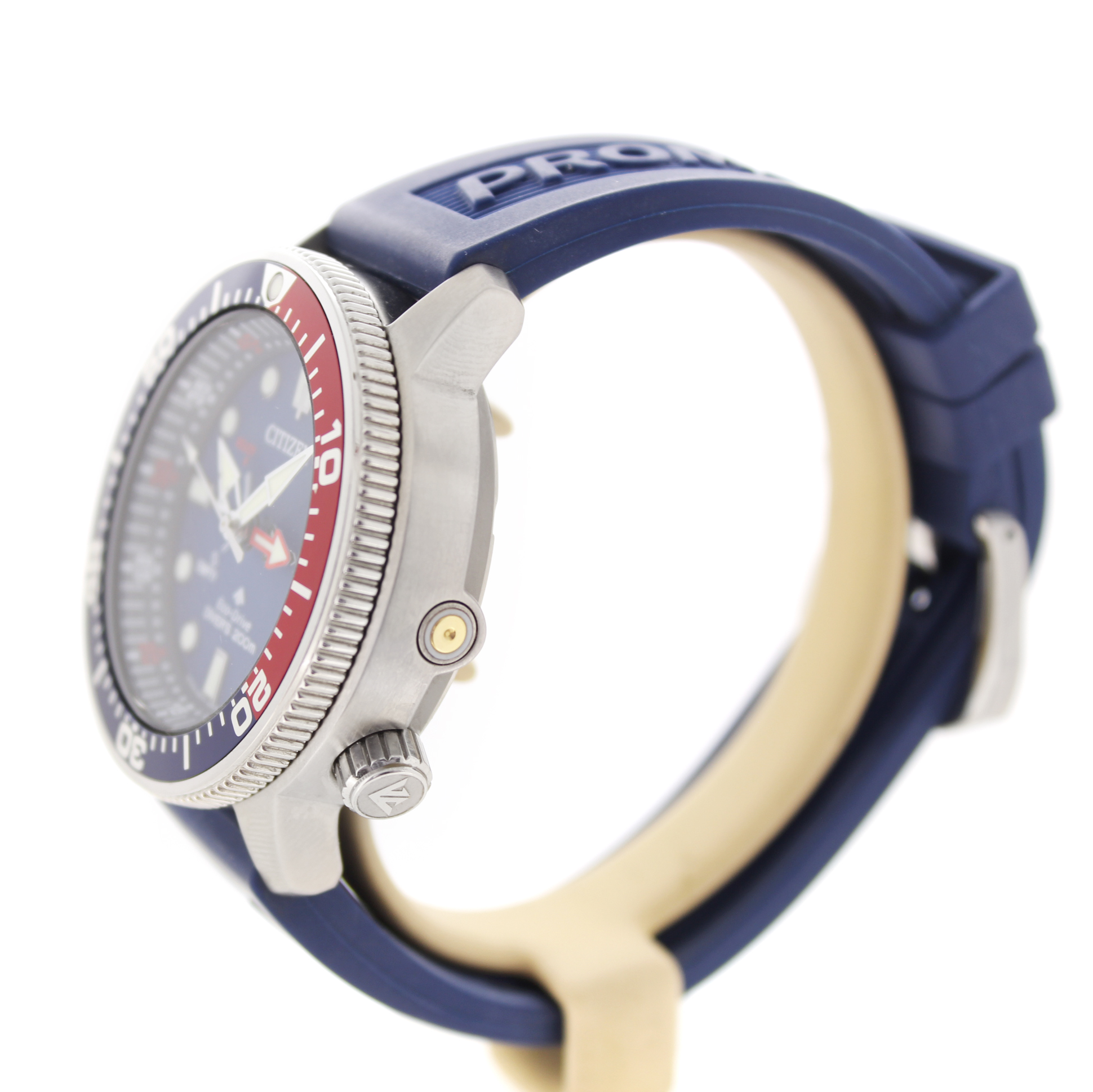Dit pre-owned Citizen Promaster BN2038-01L Marine Sea horloge wordt geleverd met een blauwe wijzerplaat. Heeft een zilverleurige staal kast, met een diameter van 46mm. De blauwe armband is vervaardigd uit rubber.