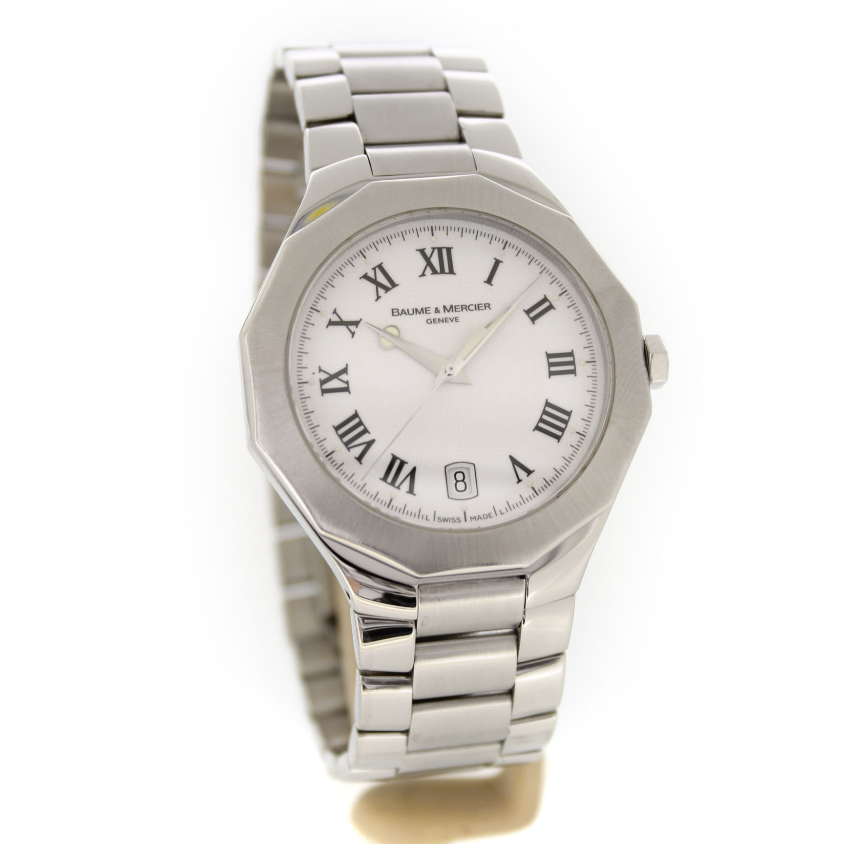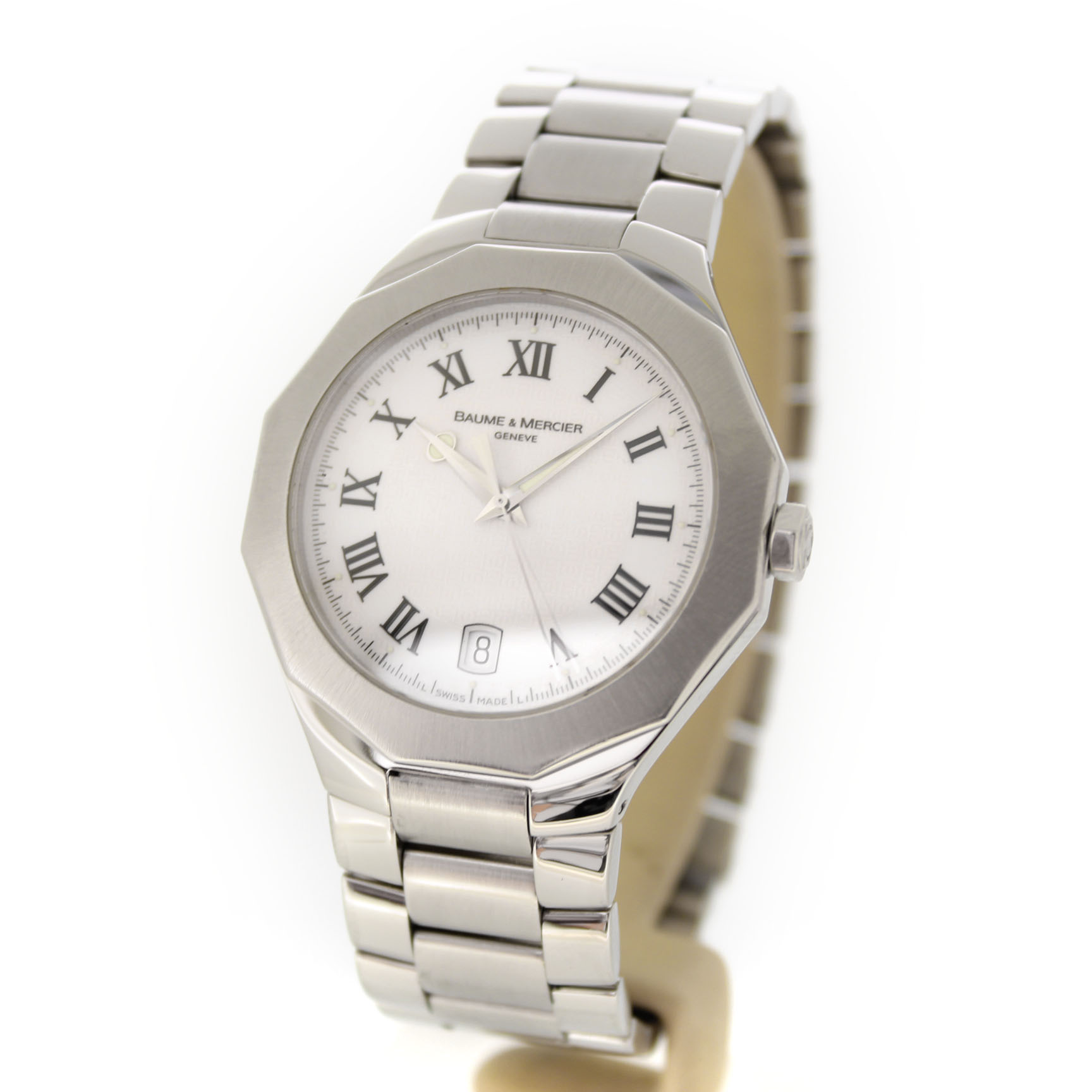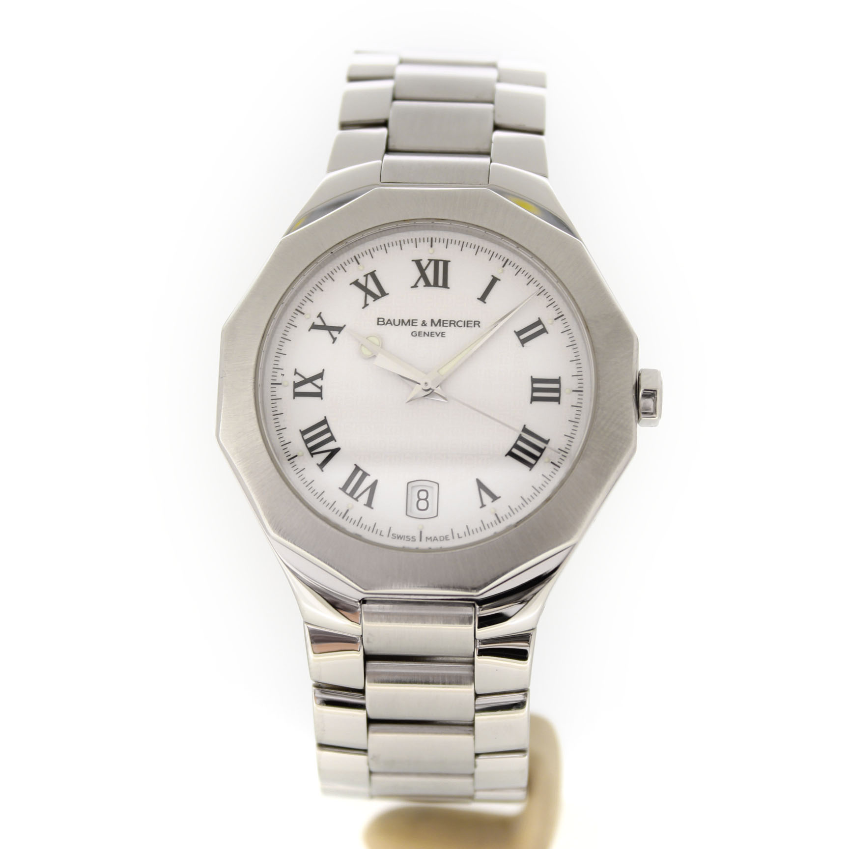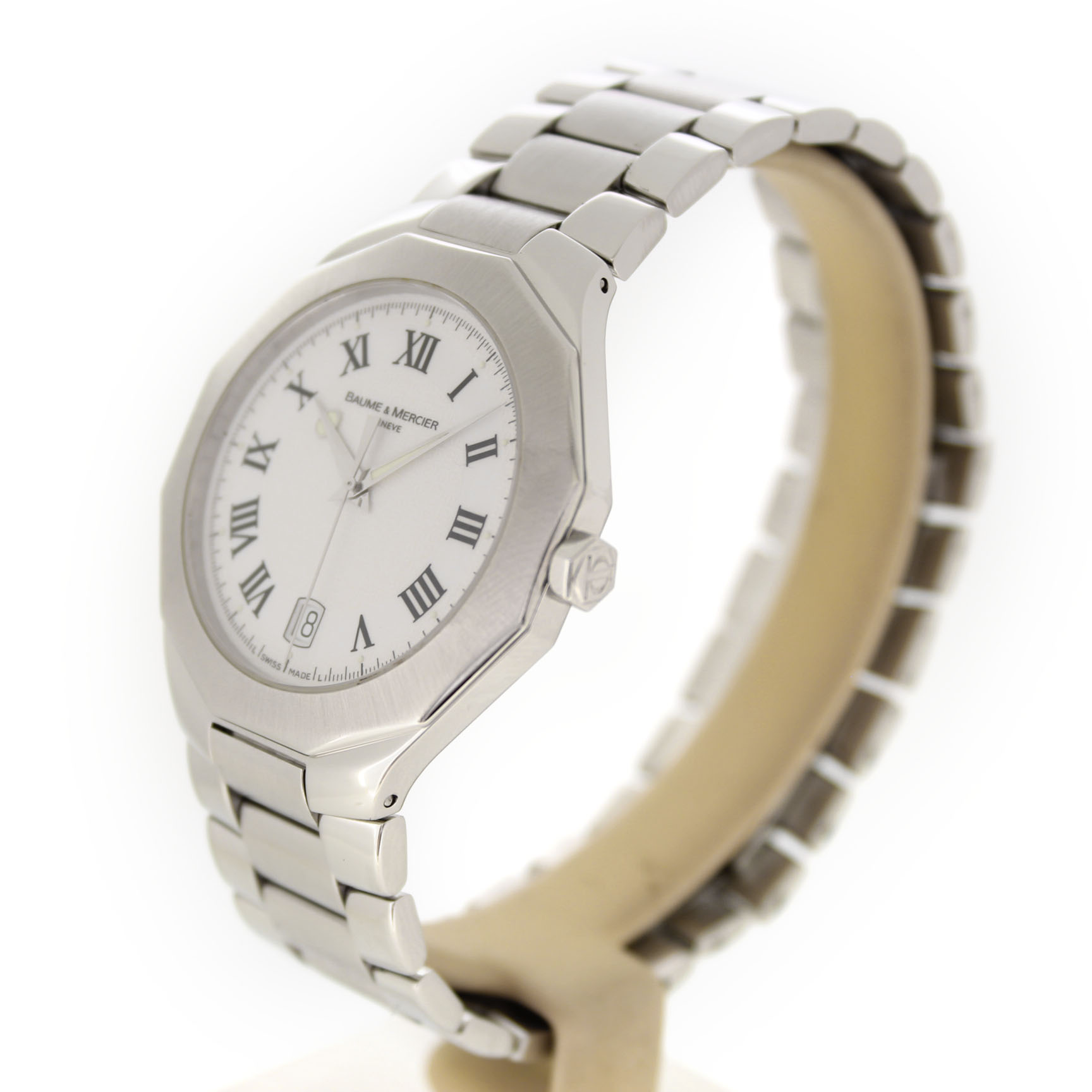 Het tweedehands horloge Baume & Mercier Riviera is een quartz en heeft een zilverkleurige staal kast en band. De wijzerplaat heeft een witte kleur en wordt beschermd met een saffier glas. De datum is te vinden op 6 uur.