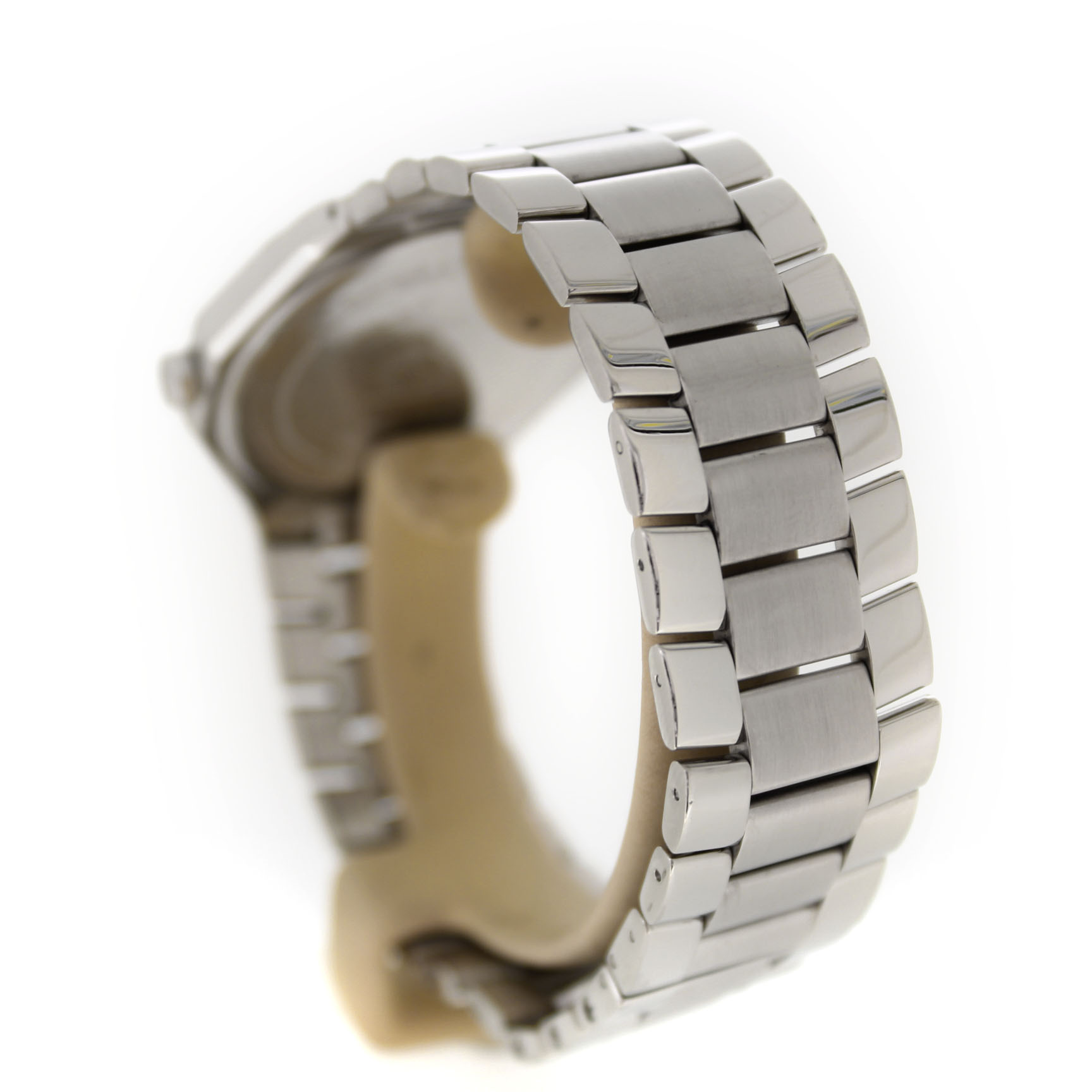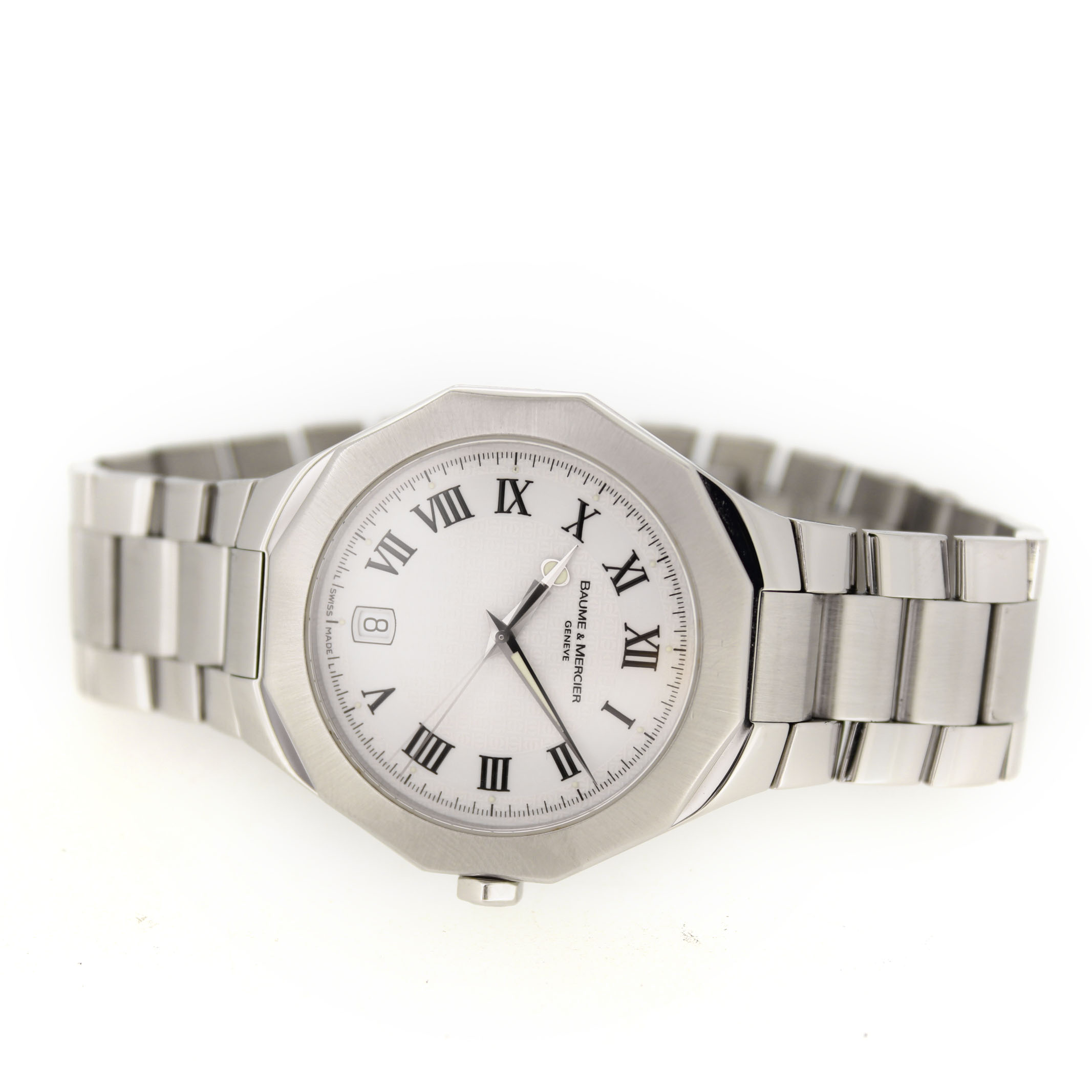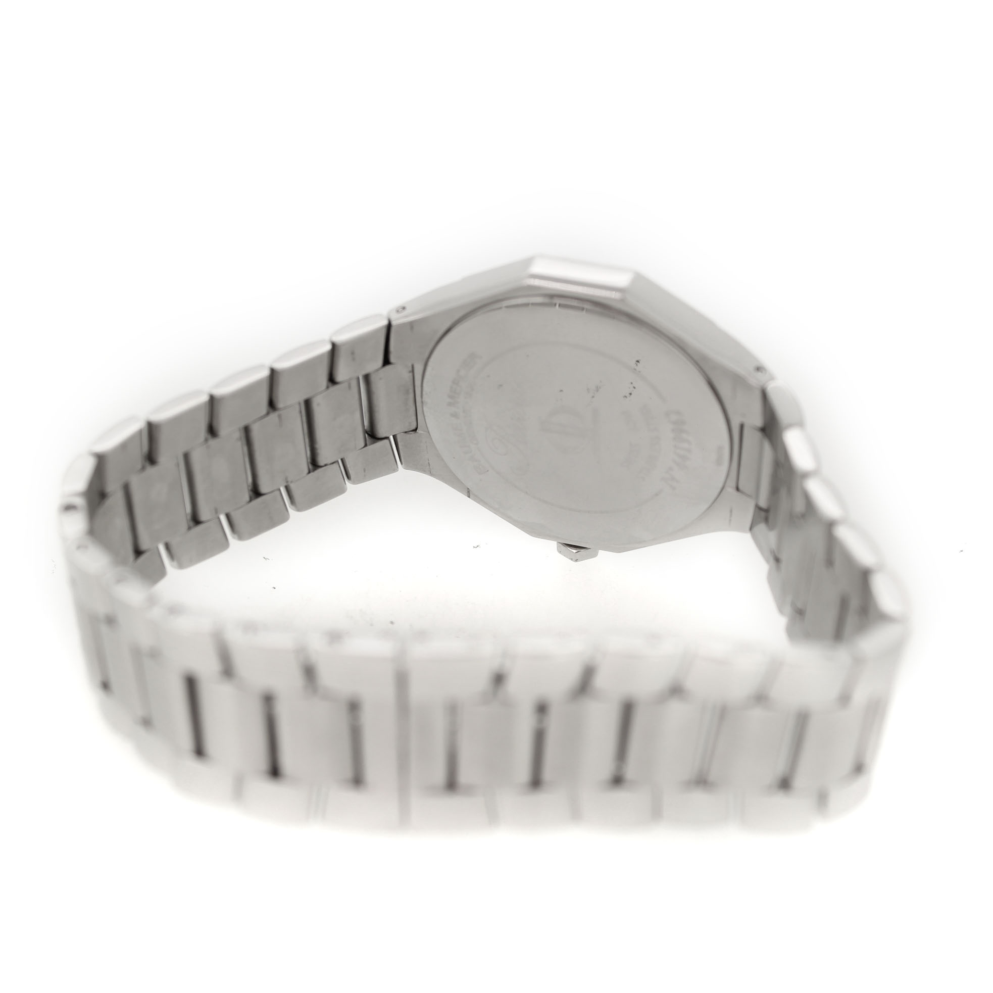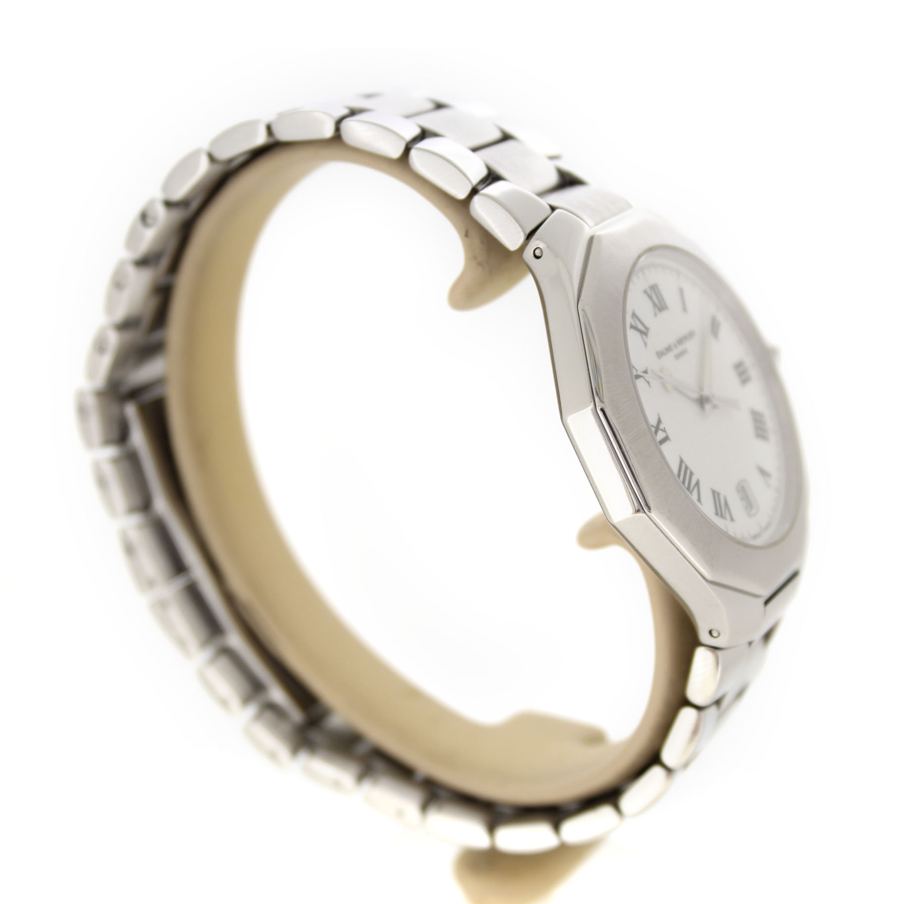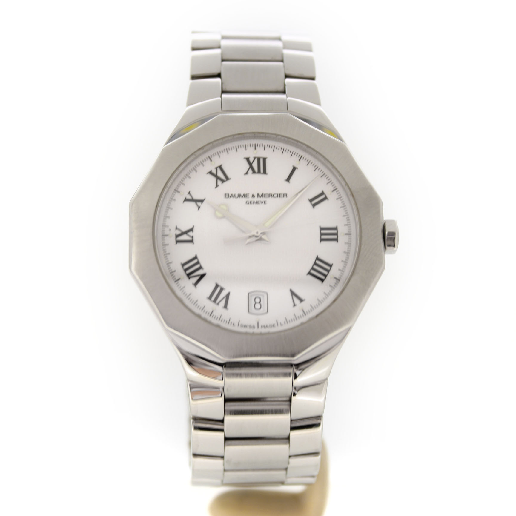 Het tweedehands horloge Baume & Mercier Riviera is een quartz en heeft een zilverkleurige staal kast en band. De wijzerplaat heeft een witte kleur en wordt beschermd met een saffier glas. De datum is te vinden op 6 uur.