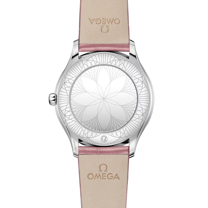 De kast van 36 mm is vervaardigd uit gepolijst roestvrij staal en is bezet met 38 volledig geslepen diamanten (0,49 ct), die netjes langs elke kant buigen. Onder het koepelvormige saffierkristalglas bevindt zich een gezandstraalde wijzerplaat in PVD-roze, die verder is verfraaid door een lotuspatroon verkregen door laserdecoratie. In de kroon is één volledig geslepen diamant geplaatst, terwijl de wijzers, indexen en het OMEGA-logo allemaal gerhodineerd zijn.
