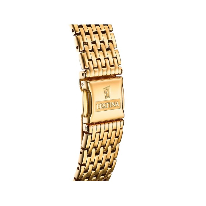 Dit Festina herenhorloge met referentie F20020/4 heeft een 39.3mm geelgoudkleurige stalen kast en armband. De witte wijzerplaat met zwarte cijfers en blauwe wijzers wordt beschermd door een saffierglas. Het is een quartz horloge met en datumaanduiding op 3uur.