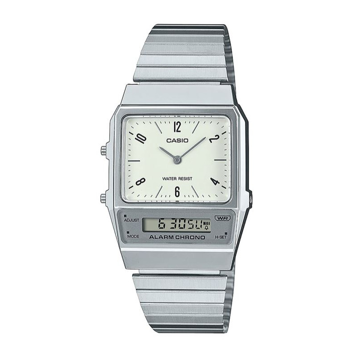 Geef uw vintage retrostijl een nieuwe look met een moderne update van het AQ-450-ontwerp uit de jaren 80. Dit gloednieuwe horloge in vintage stijl is een prachtige mix van retro en klasse. Een aparte wijzerplaat en LCD-scherm zorgen voor een analoge schoonheid en digitale weergave. Het LCD-scherm is onder een lichte hoek geplaatst om de lijnen van de lugs te volgen en de analoge wijzerplaat heeft een eenvoudige streepjesmarkering. De wijzerplaat met een rasterpatroon geeft de finishing touch voor een echte retro uitstraling. De combinatie van de hoekige behuizing en de rechte schakels van de metalen band is een eenvoudige en stijlvolle viering van structurele schoonheid. Deze horloges zijn meer dan een modestatement en bieden praktische functies zoals dubbele tijdsweergave, een stopwatch en alarm, evenals waterbestendigheid voor dagelijks gebruik, ook op regenachtige dagen.