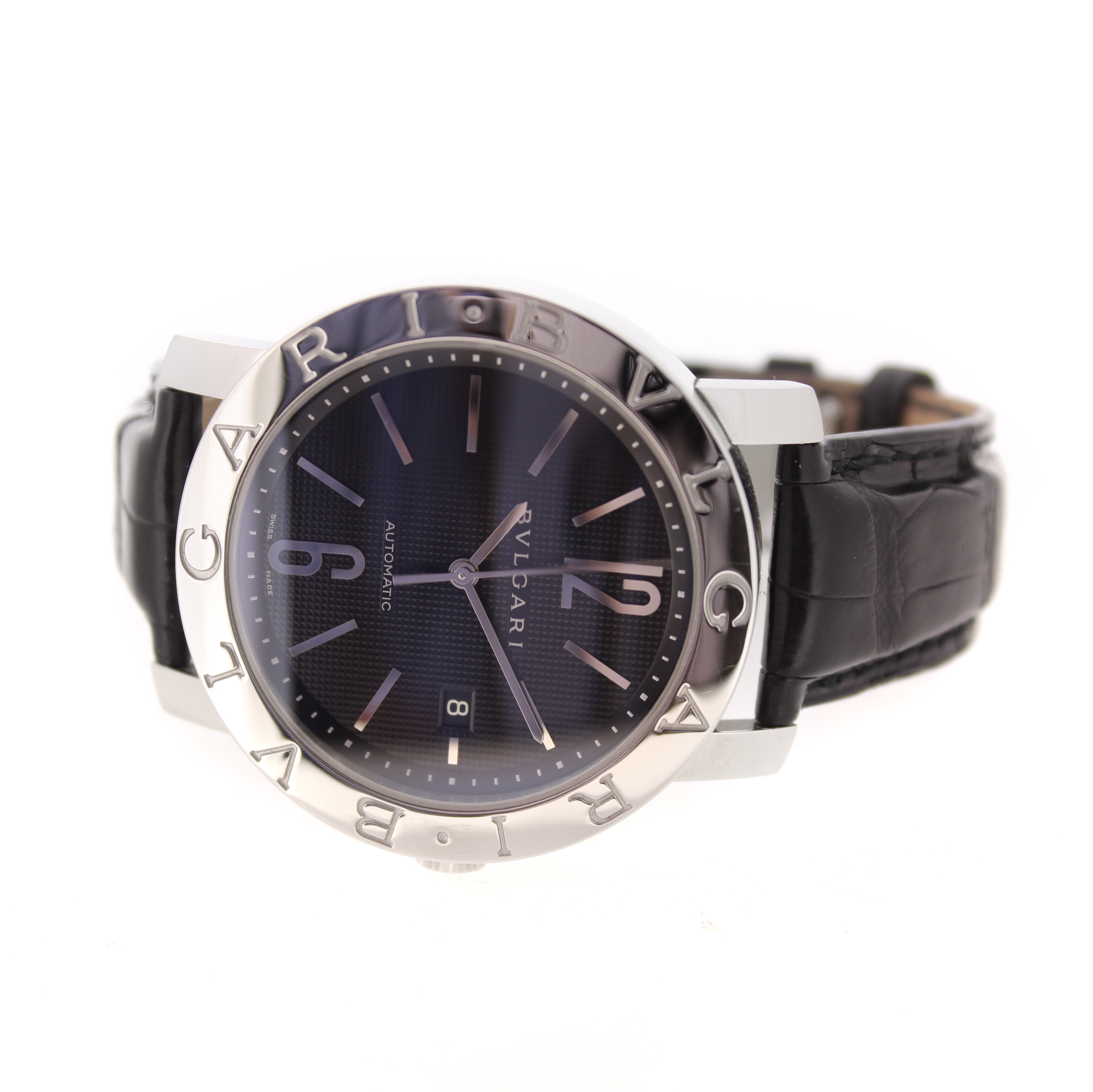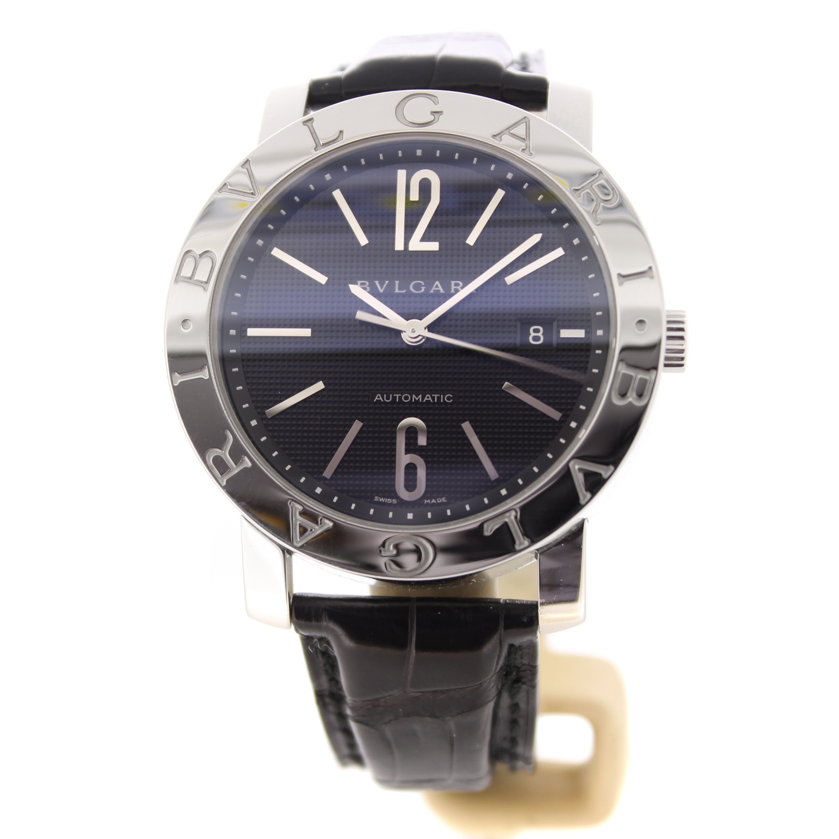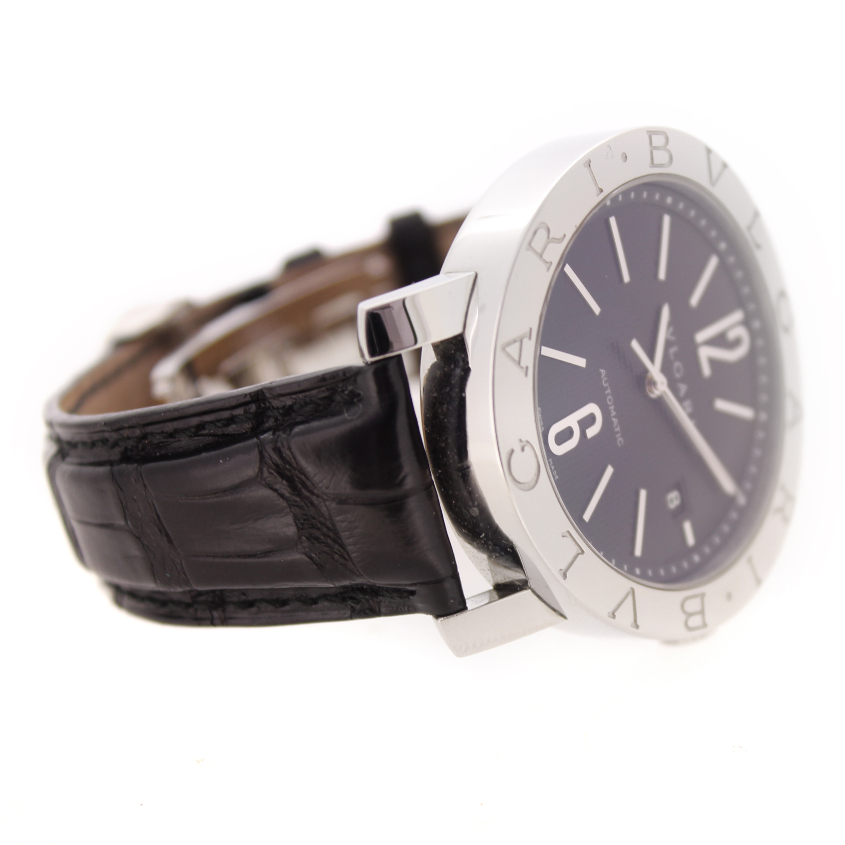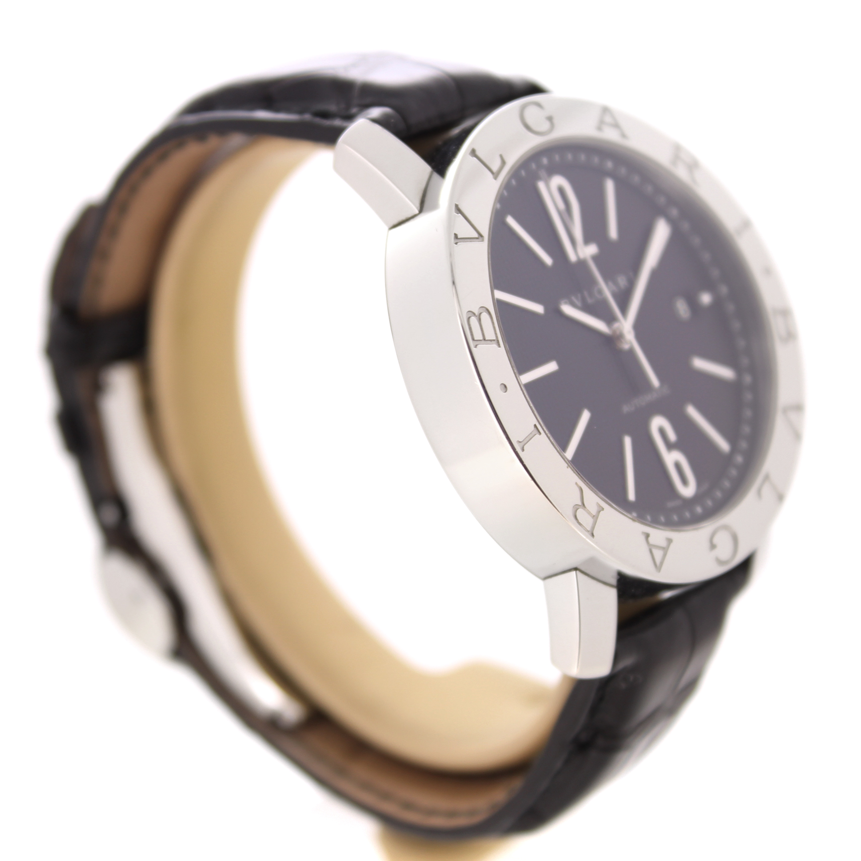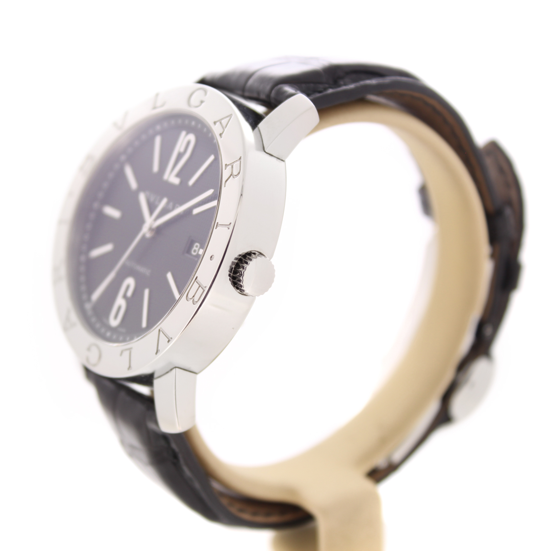 De pré-owned Bvlgari Bulgari Bulgari met de referentie BB42 SL AUTO horloge heeft een 42mm staal kast en een zwart leder armband. De zwarte wijzerplaat is beschermd door een saffierglas en beschikt over een datumaanduiding.
