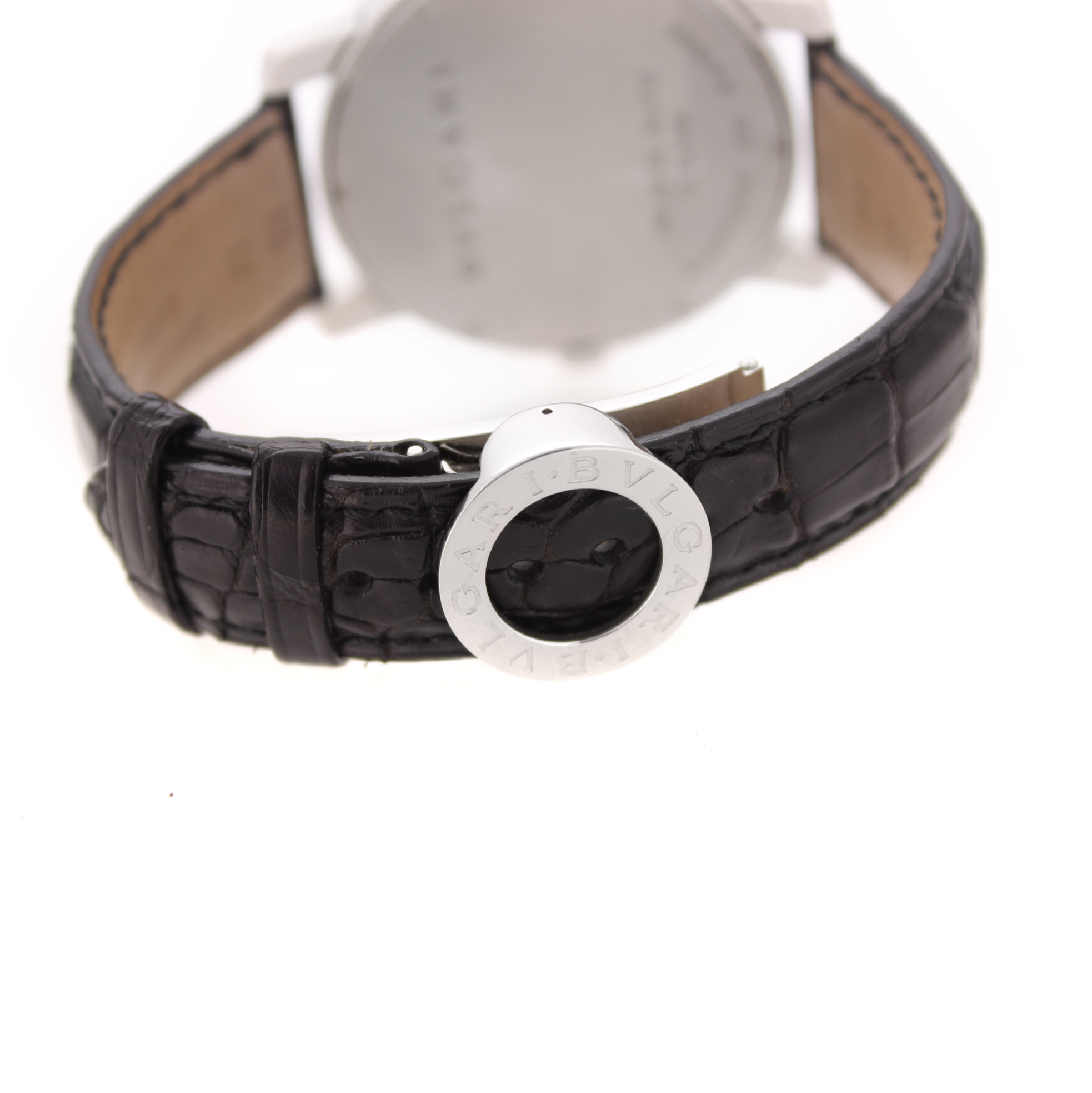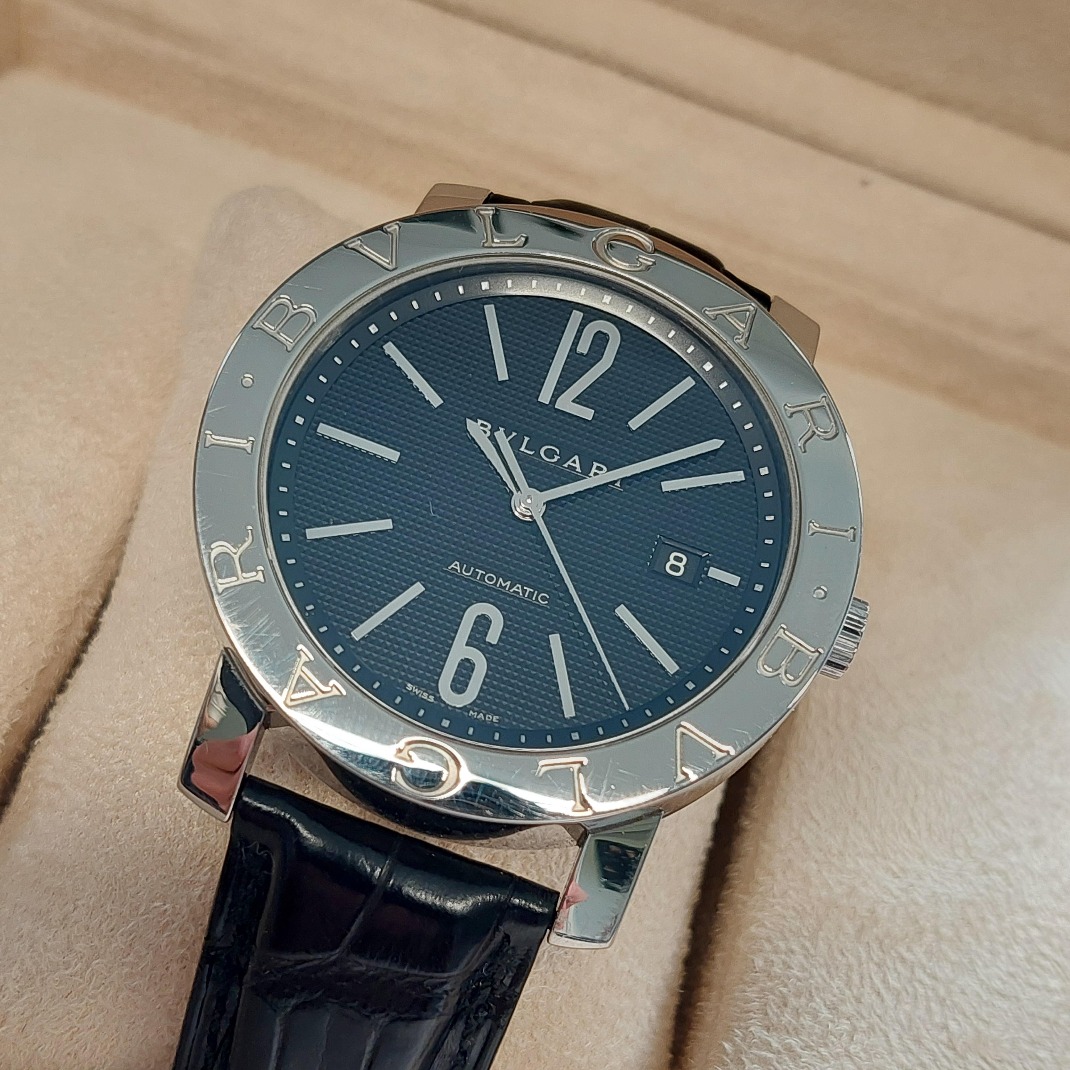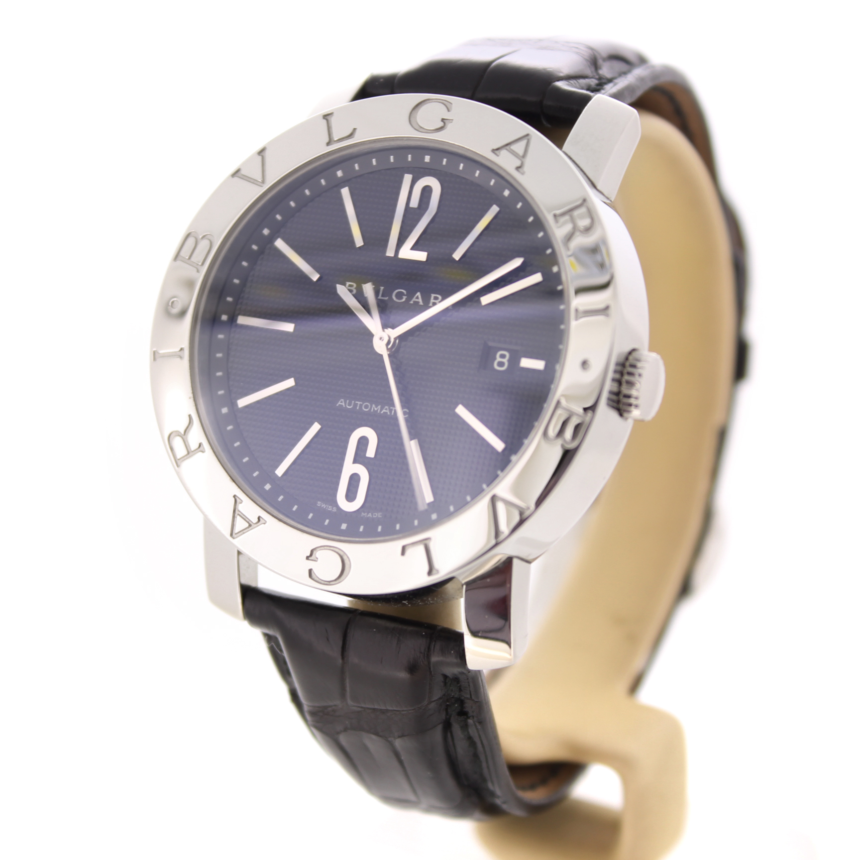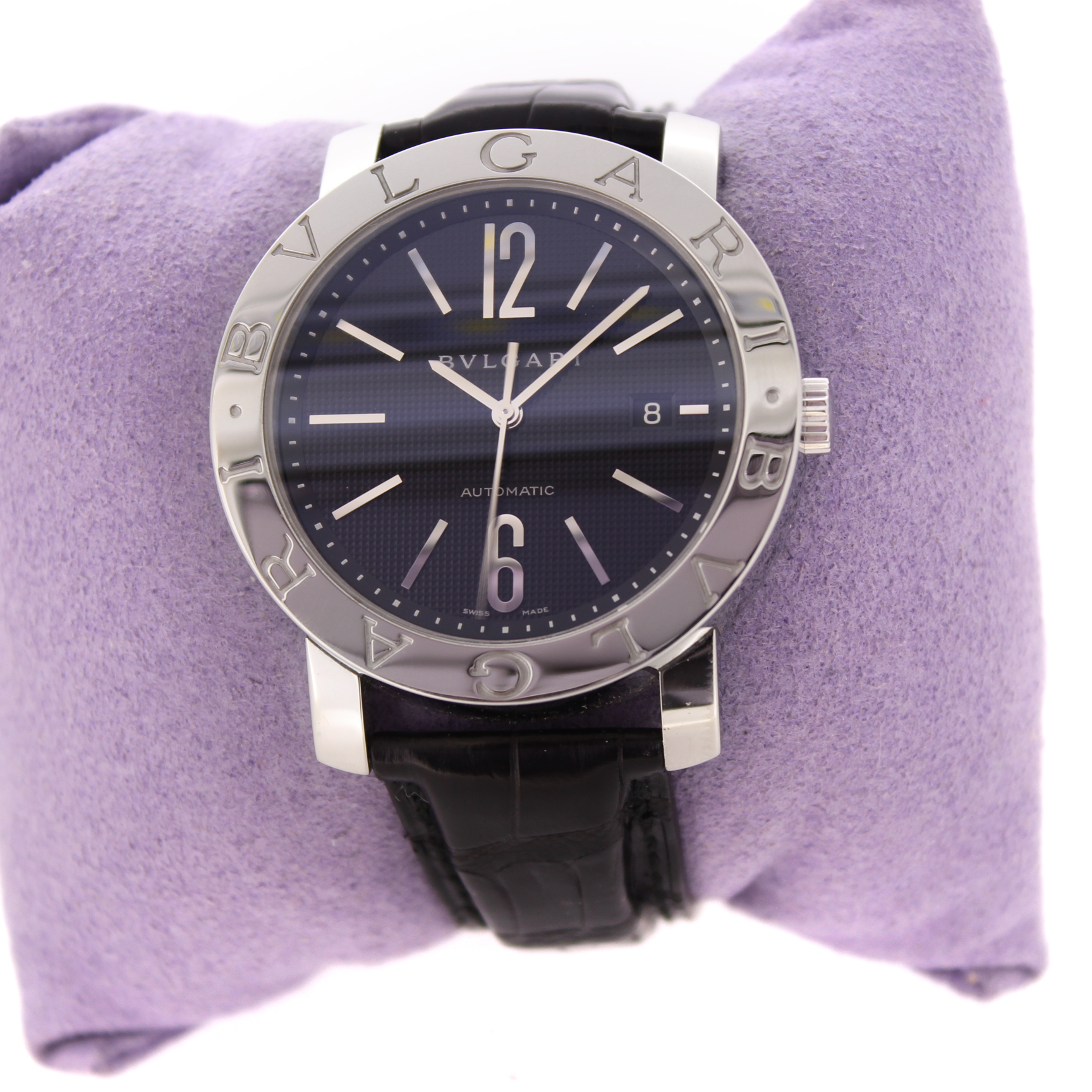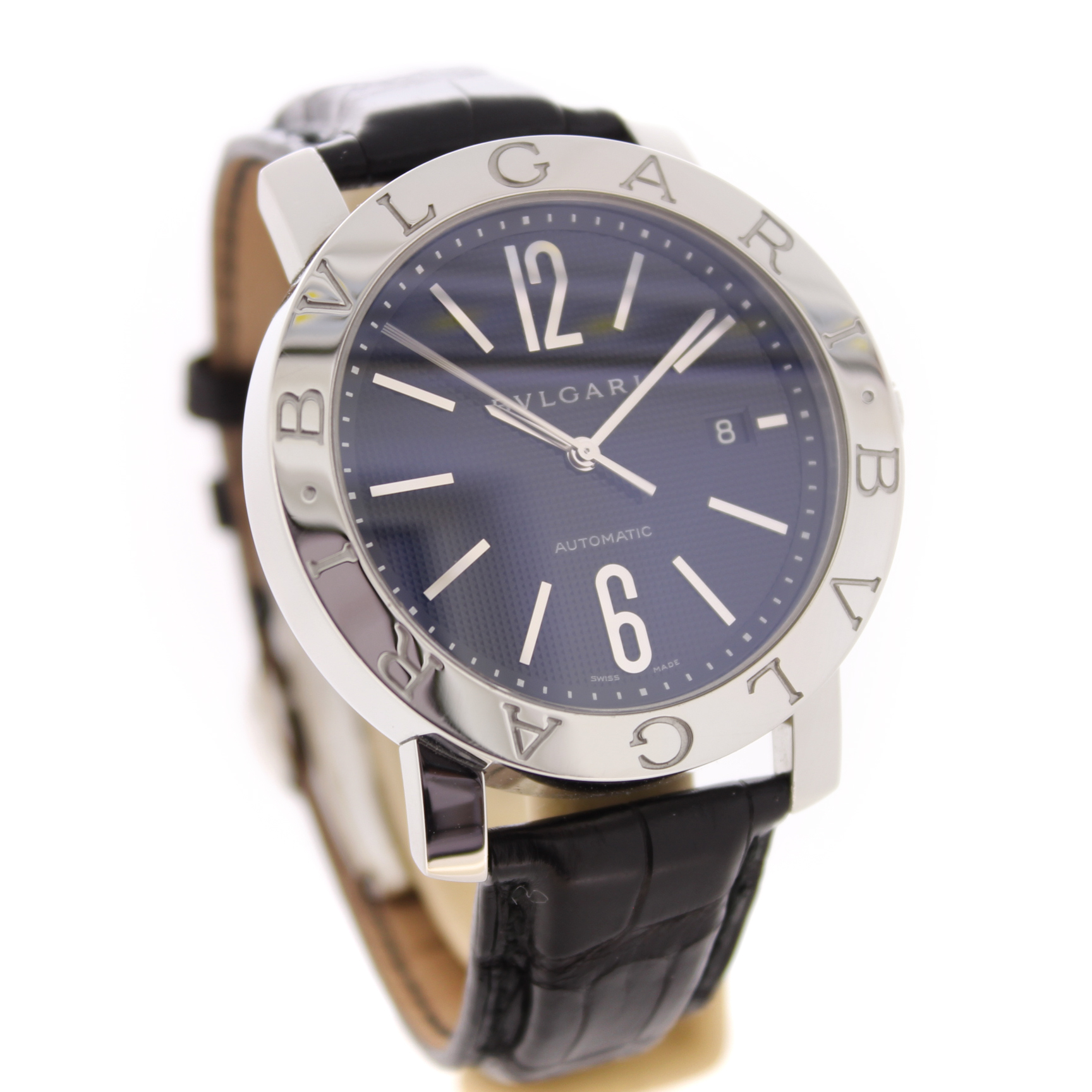 De pré-owned Bvlgari Bulgari Bulgari met de referentie BB42 SL AUTO horloge heeft een 42mm staal kast en een zwart leder armband. De zwarte wijzerplaat is beschermd door een saffierglas en beschikt over een datumaanduiding.