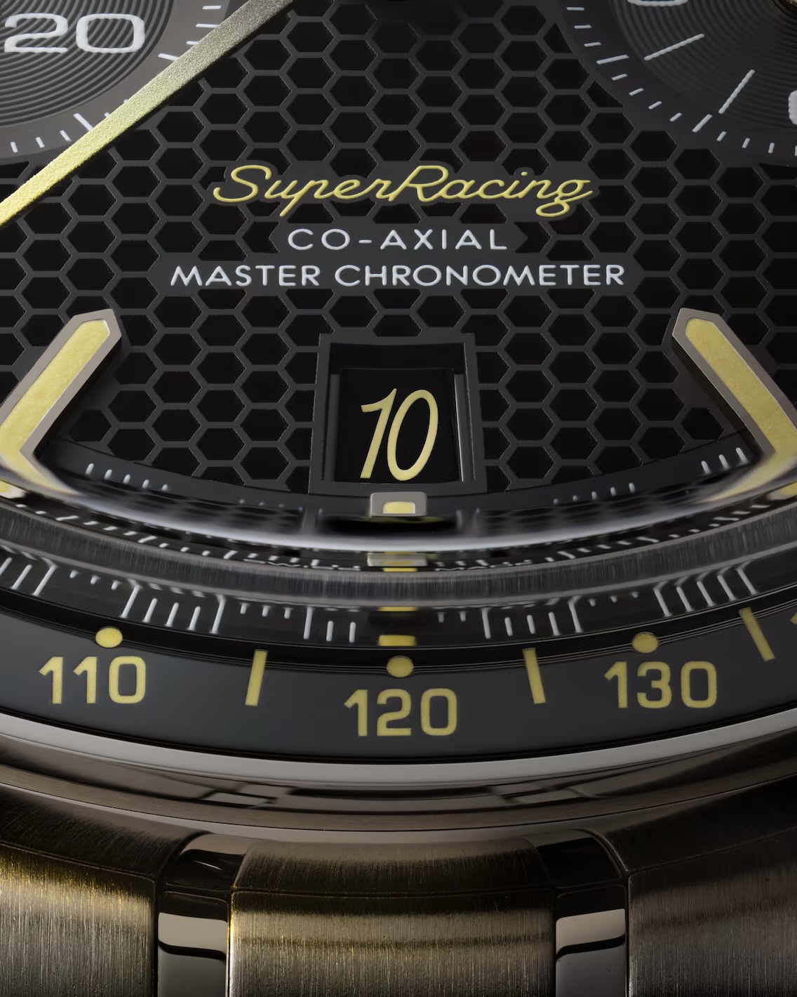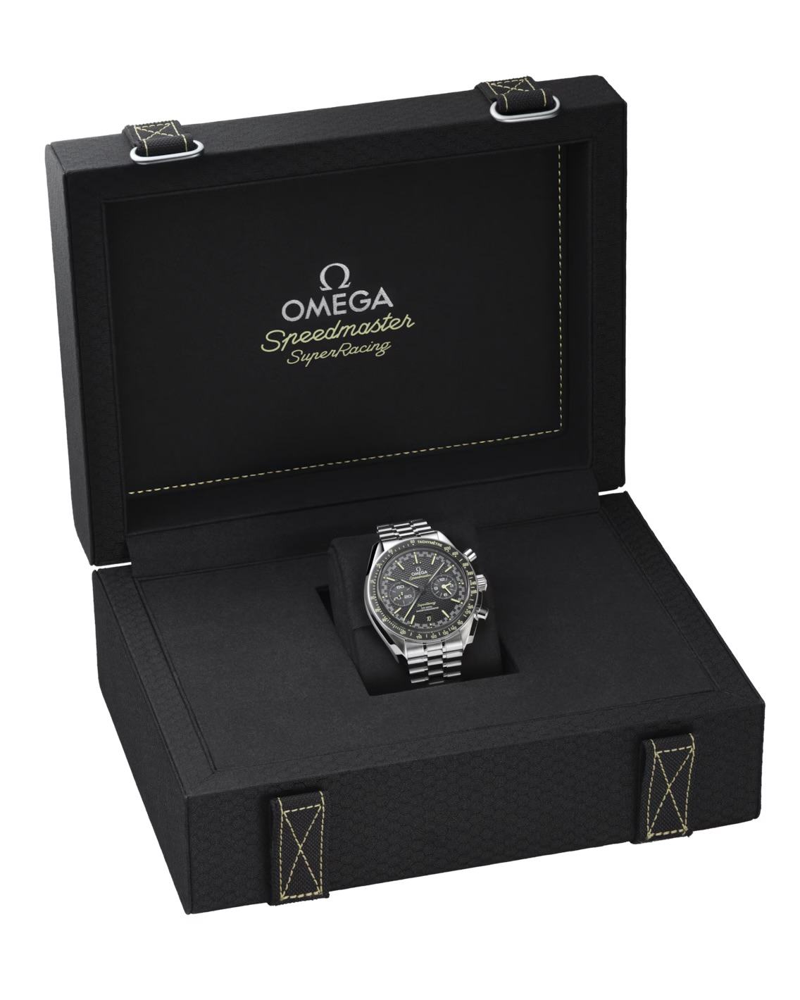 De met diamant gepolijste en afgeschuinde zwarte pijlpuntindexen zijn gevuld met gele Super-LumiNova, die een gele gloed afgeeft. Deze kleurcode wordt doorgetrokken naar de Speedmaster- en Super Racing-tekst op de wijzerplaat.