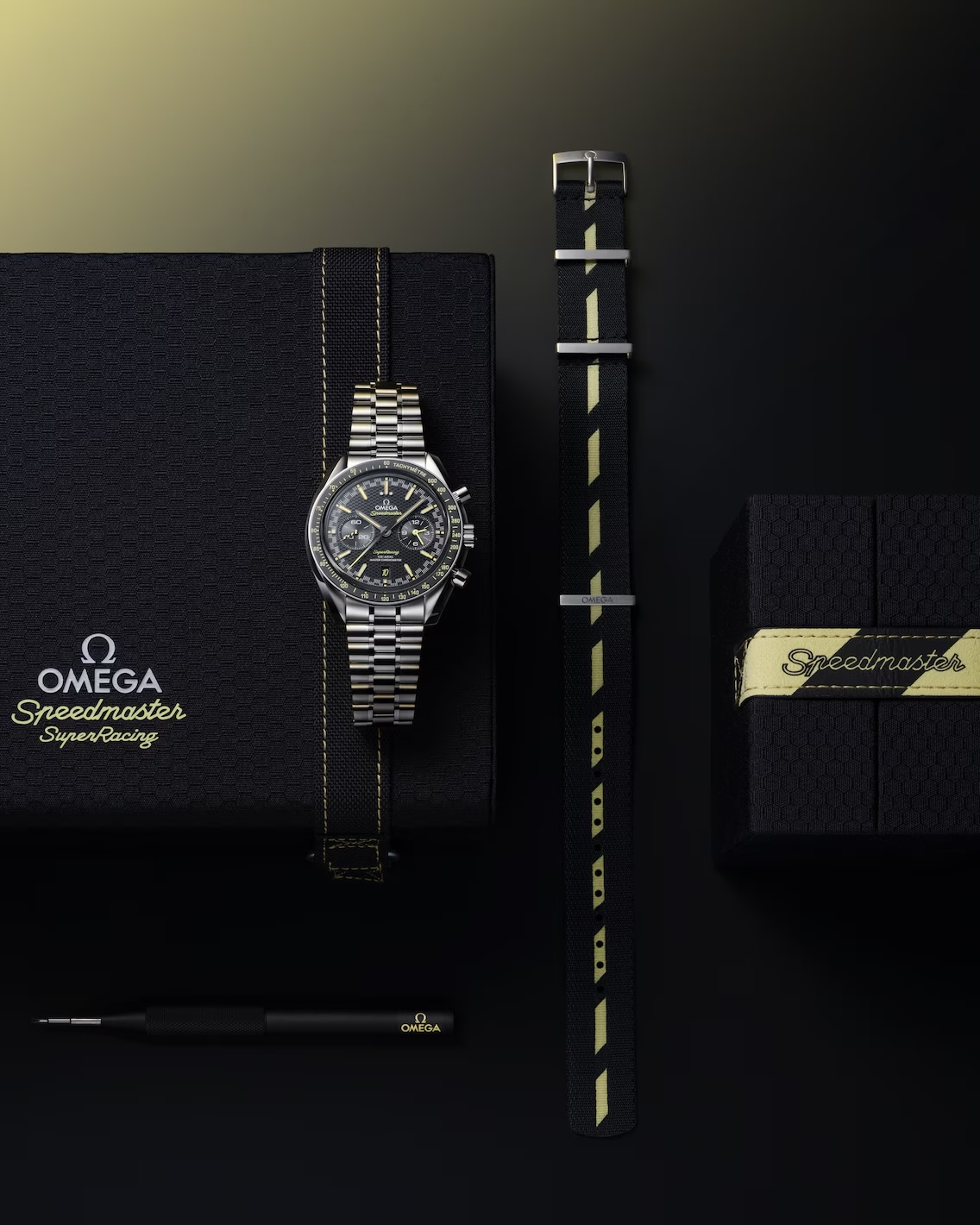 Het horloge wordt geleverd in een Speedmaster horlogedoos met honingraatmotief in het zwart met gele stiksels, inclusief een NATO-band van gerecycled nylon met zwarte en gele strepen.