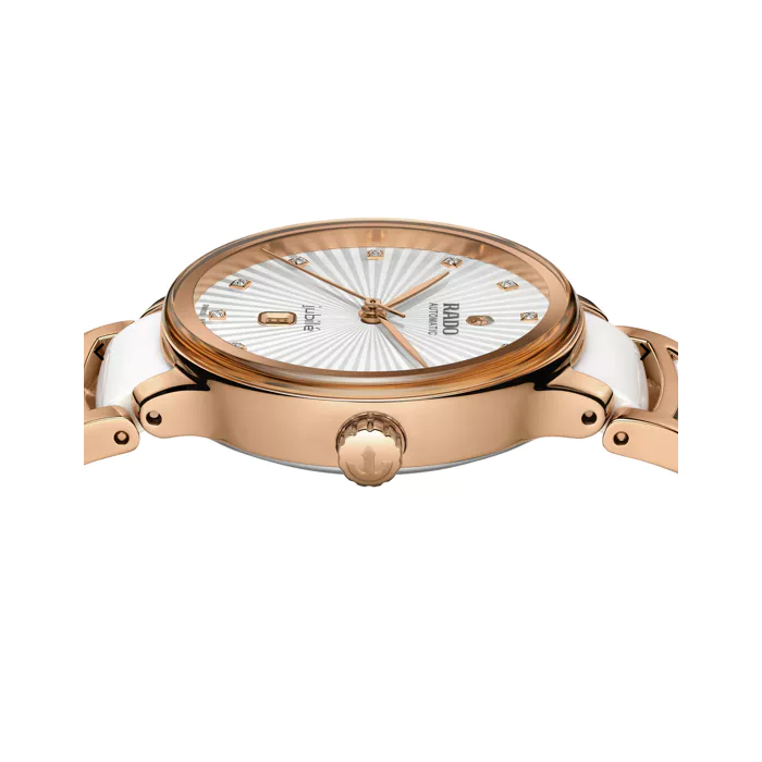 Laat je verleiden door de visuele harmonie van dit dames RADO Centrix Automatic Diamonds horloge met de referentie R30019744. De voormalige scherpe vorm van de Centrix is in deze prachtige uitvoering vervangen door sensuele silhouetten geïnspireerd op de duinen en woestijnen. De kleurcombinatie van wit en roségoud benadrukt de schoonheid van parelwitte stranden. De gefaceteerde jubilé wijzerplaat met weelderig 3D-effect accentueert jouw innerlijke schoonheid en vrouwelijke kracht. De stalen kast met gepolijste roségoudkleurige PVD coating is afgewerkt met een stalen band met hightech keramische middenschakels en een krasbestendig saffierglas. Dit iconische uurwerk is bovendien uitgerust met het Swiss Made R582 kaliber, een automatisch gangwerk met verhoogd antimagnetisme dankzij een Nivachron™-spiraalveer. Het biedt betrouwbare en nauwkeurigere prestaties. Verder is het waterdicht tot 50 meter.