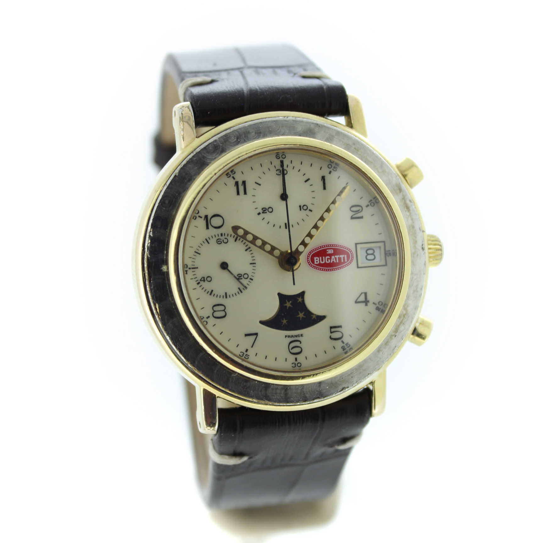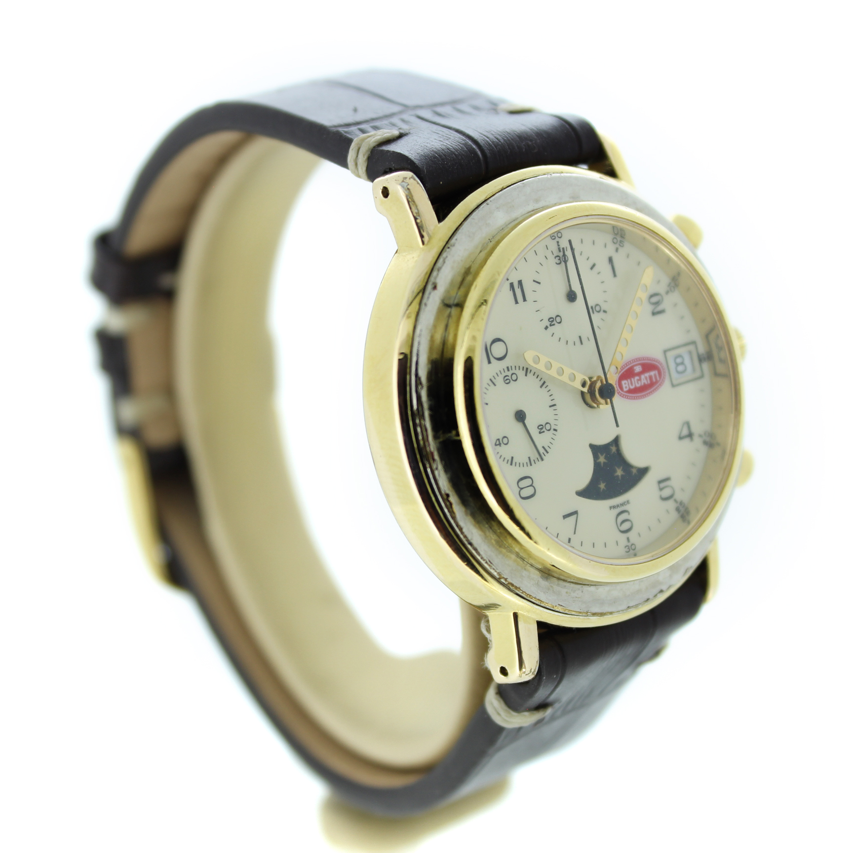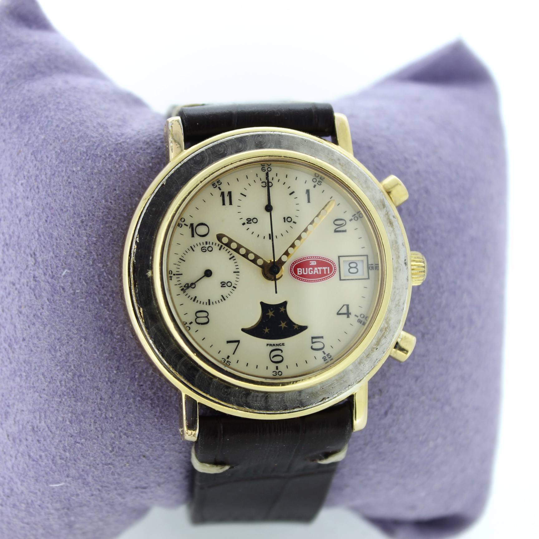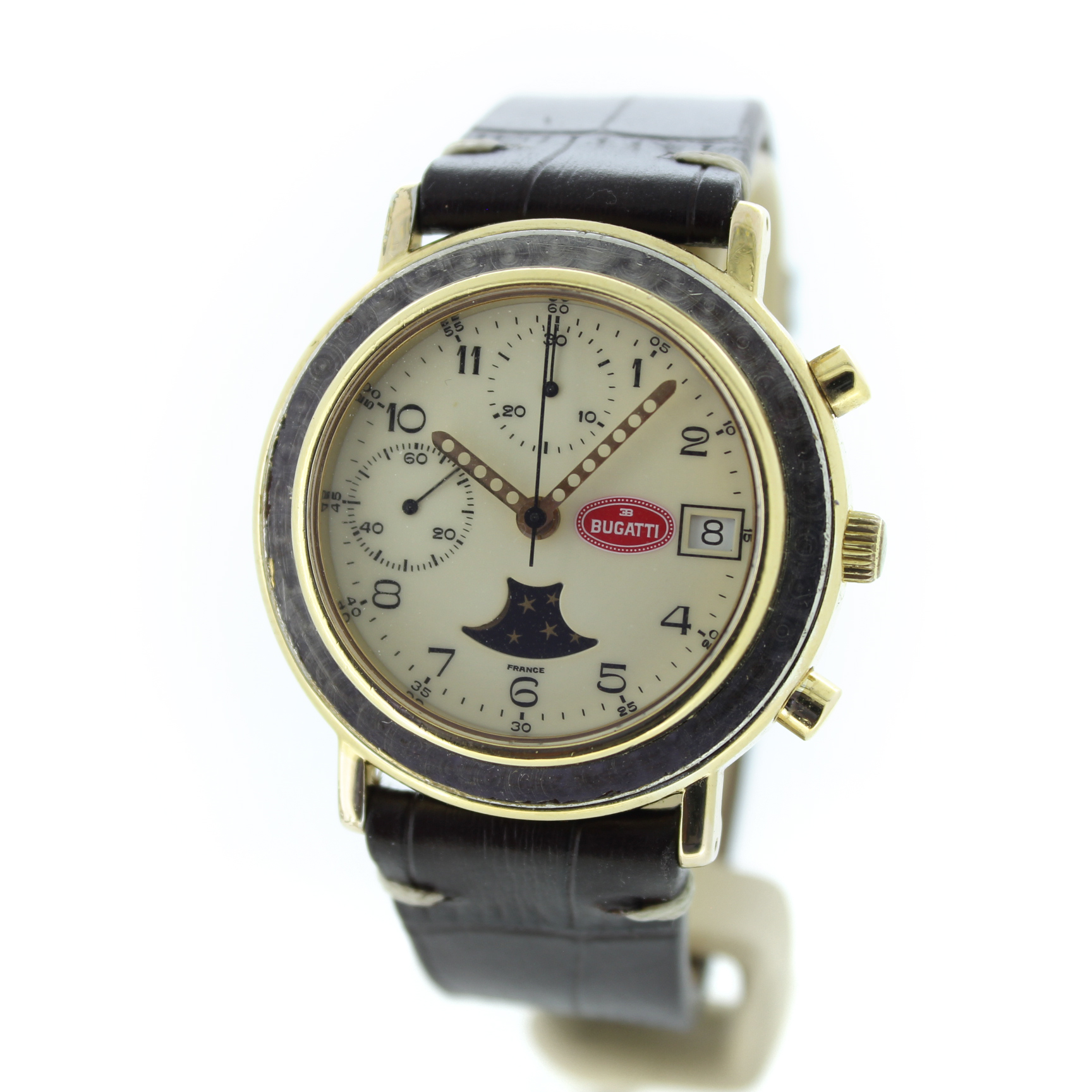 Dit pré-owned Bugatti Vintage horloge heeft een 38 mm Pleetgouden kast en een bruine leder armband. De beige wijzerplaat is beschermd door een saffierglas en beschikt over een datumaanduiding, chronograaf en moonphase.