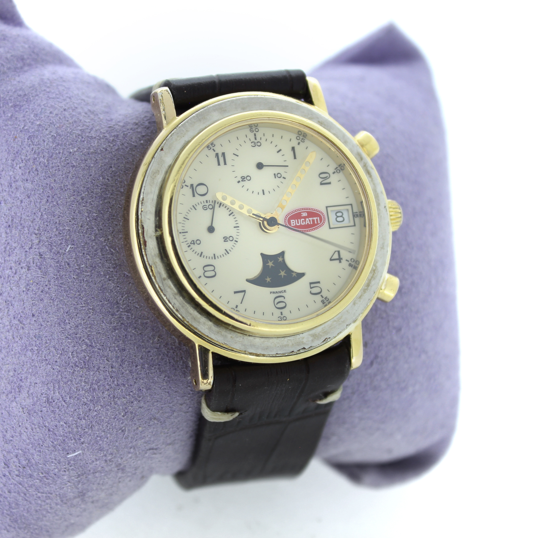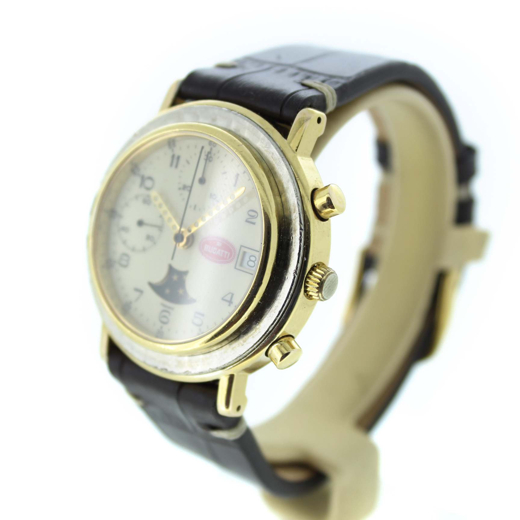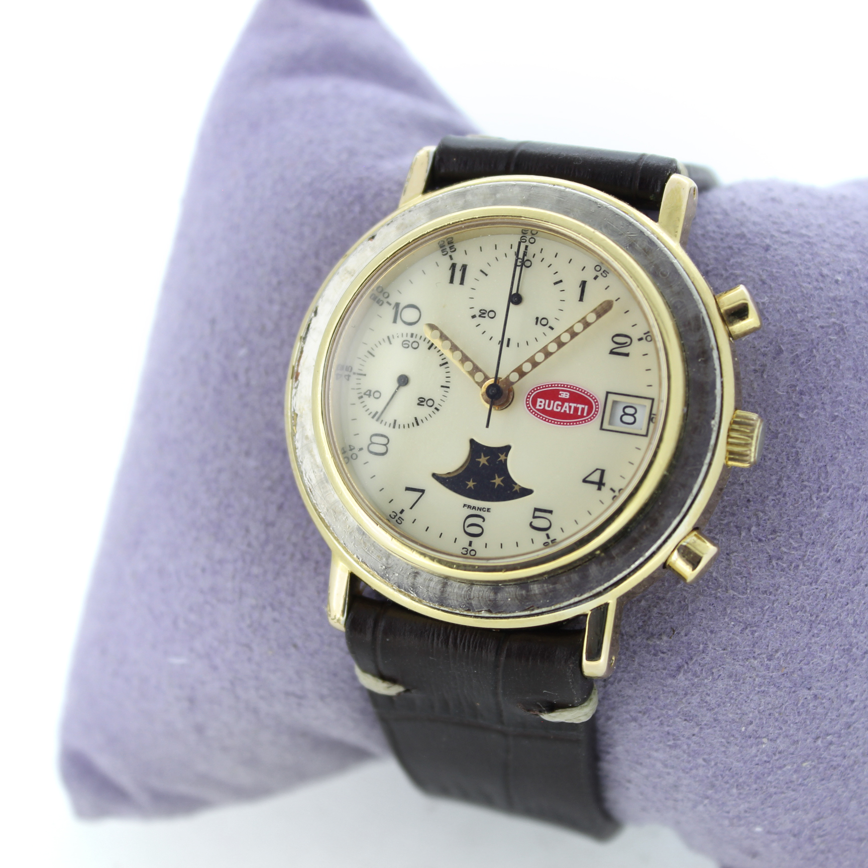 Dit pré-owned Bugatti Vintage horloge heeft een 38 mm Pleetgouden kast en een bruine leder armband. De beige wijzerplaat is beschermd door een saffierglas en beschikt over een datumaanduiding, chronograaf en moonphase.