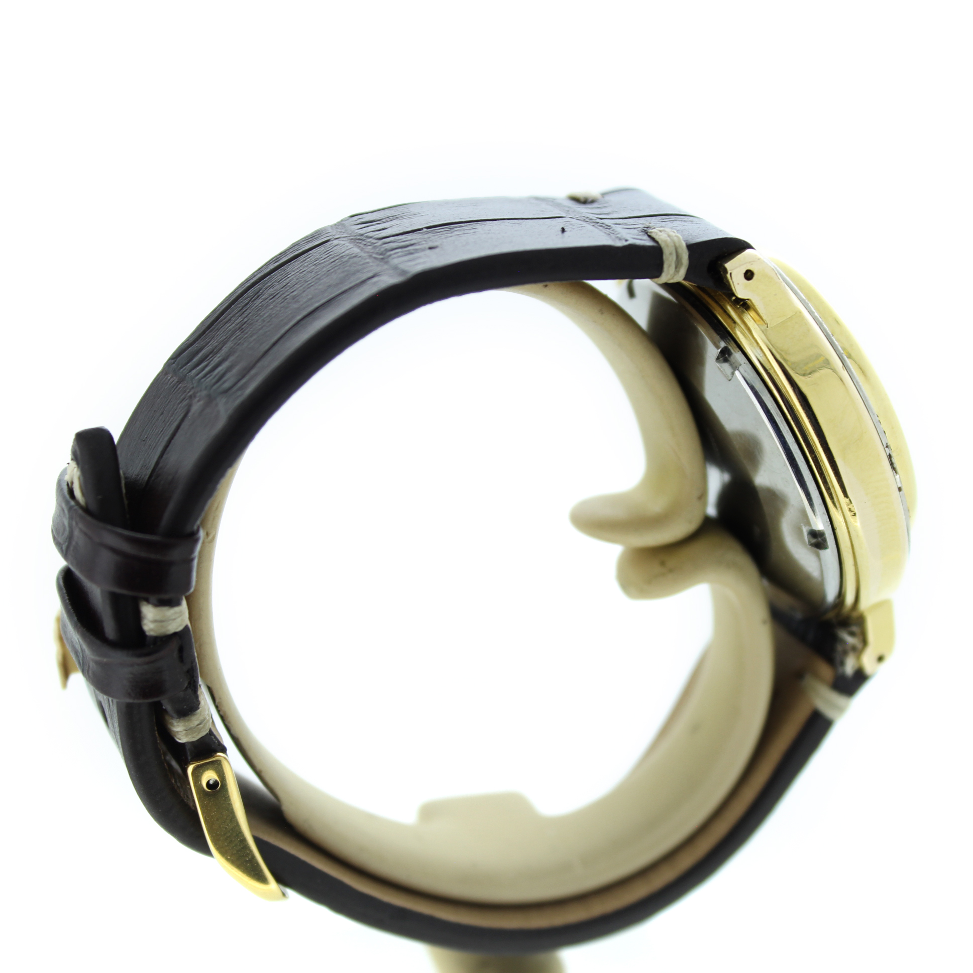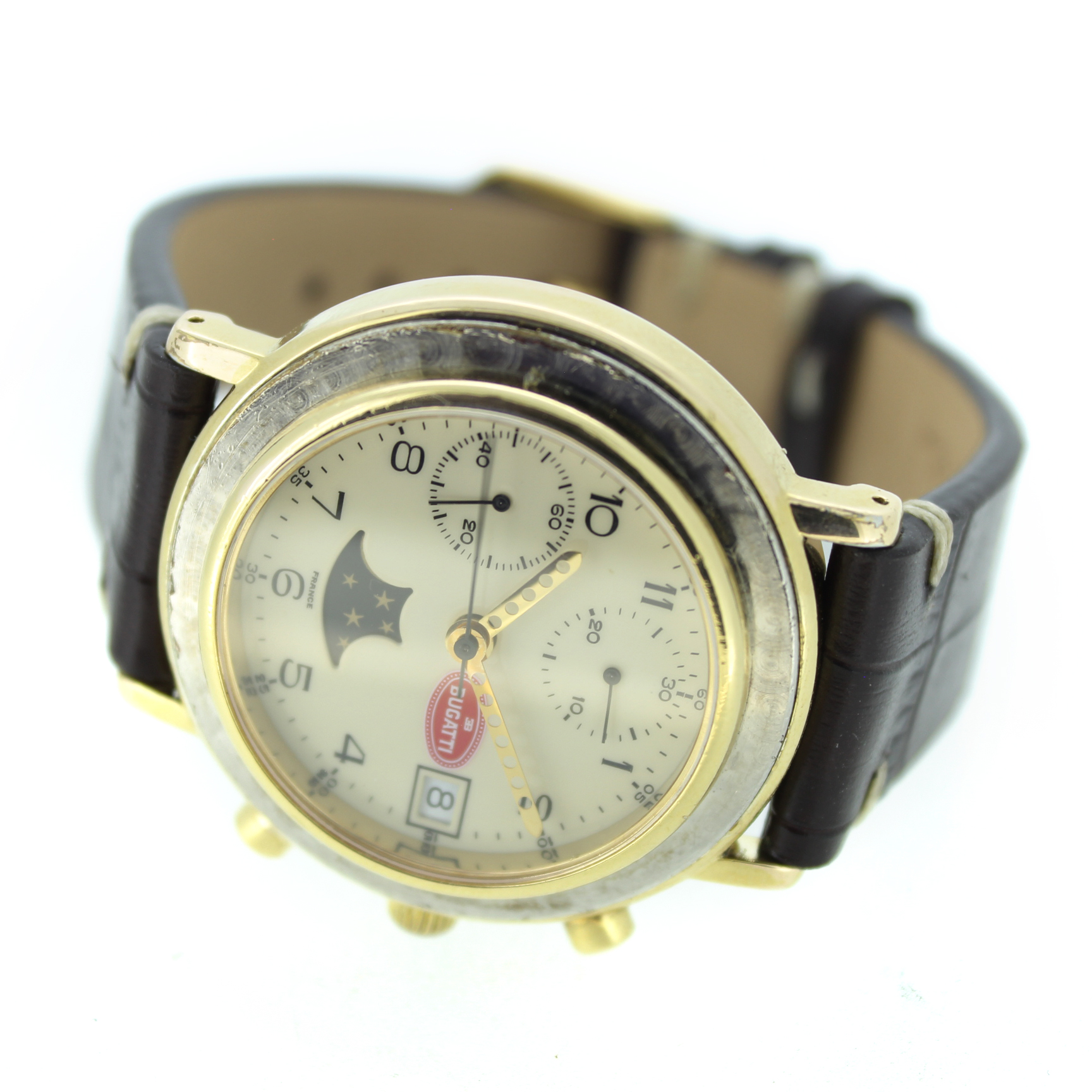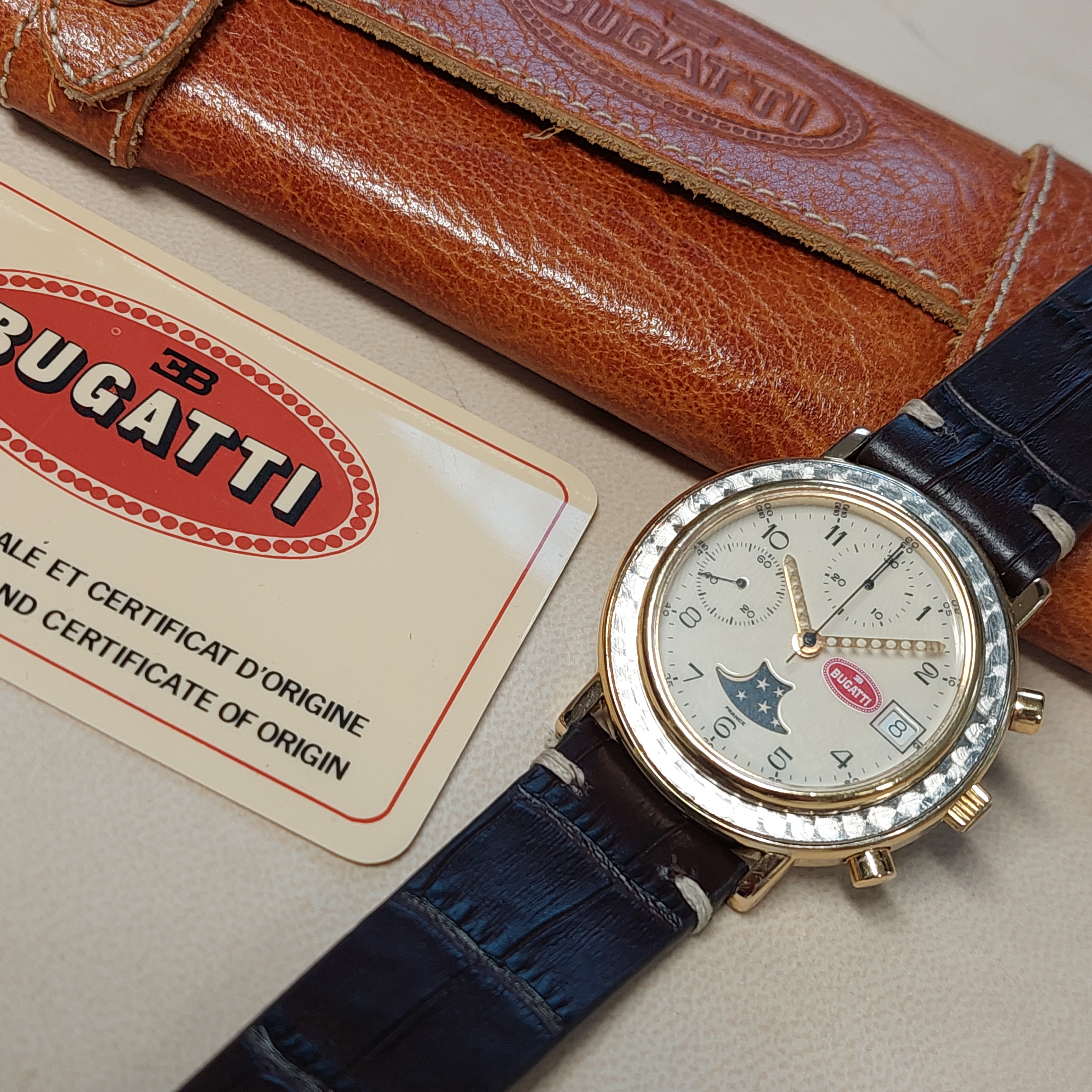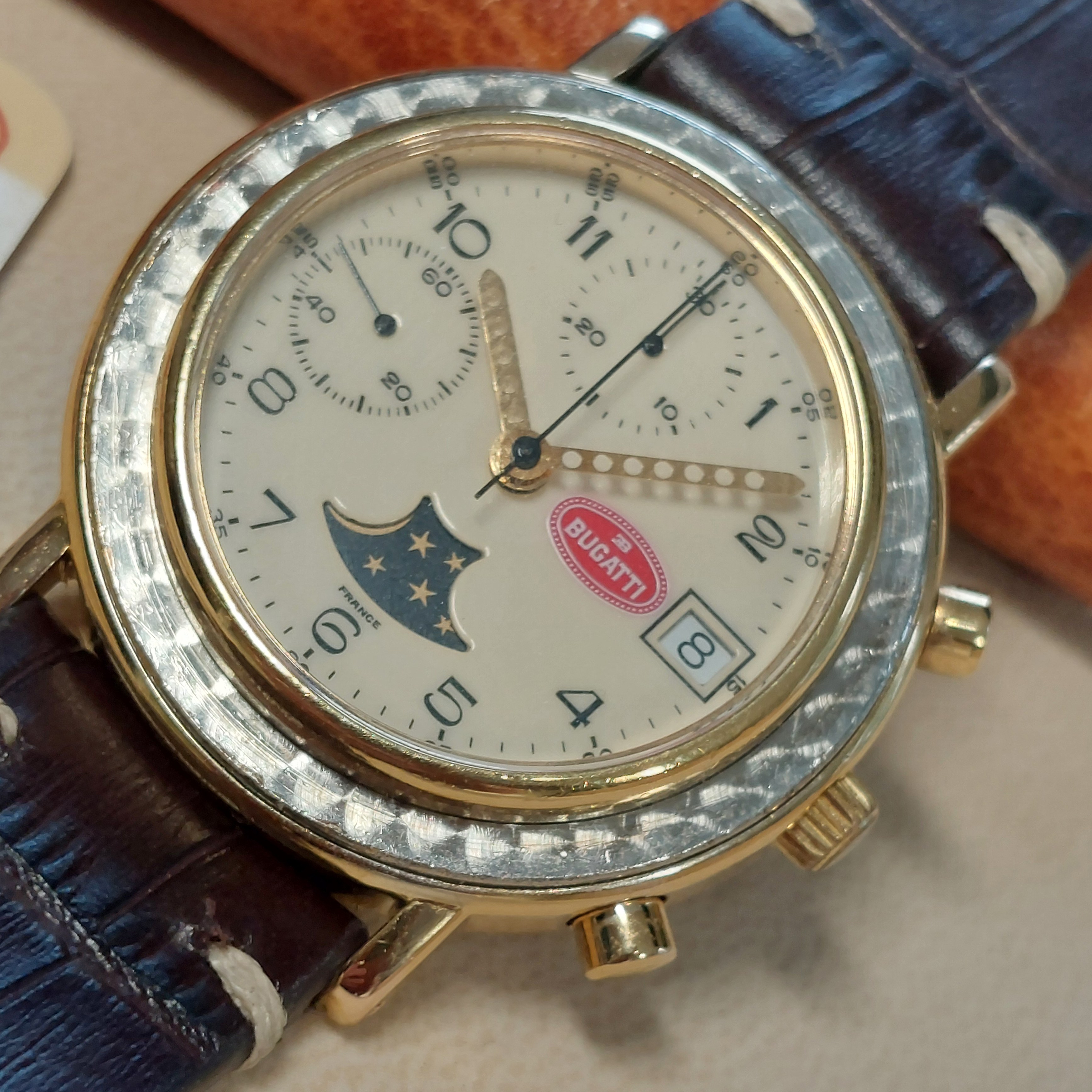 Dit pré-owned Bugatti Vintage horloge heeft een 38 mm Pleetgouden kast en een bruine leder armband. De beige wijzerplaat is beschermd door een saffierglas en beschikt over een datumaanduiding, chronograaf en moonphase.