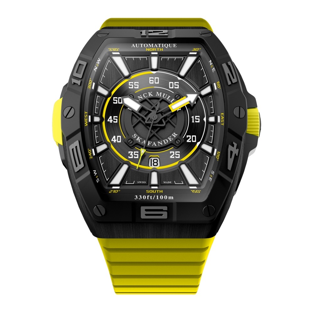 De Franck Muller Skafander is uitgerust met een zwarte wijzerplaat met gele accenten, en een datum aanduiding op 6 uur. Het Franck Muller horloge is voorzien van het MVT 2536-SCDT gangwerk, 191 componenten en een gangreserve van 42 uur. Deze Frank Muller Skafander heeft een staal zwart PVD horlogekast van van 43.1 mm x 52.35 mm en test 10 bar waterdichtheid. Het exclusief Zwitsers Franck Muller horloge is voorzien met een gele rubber armband.