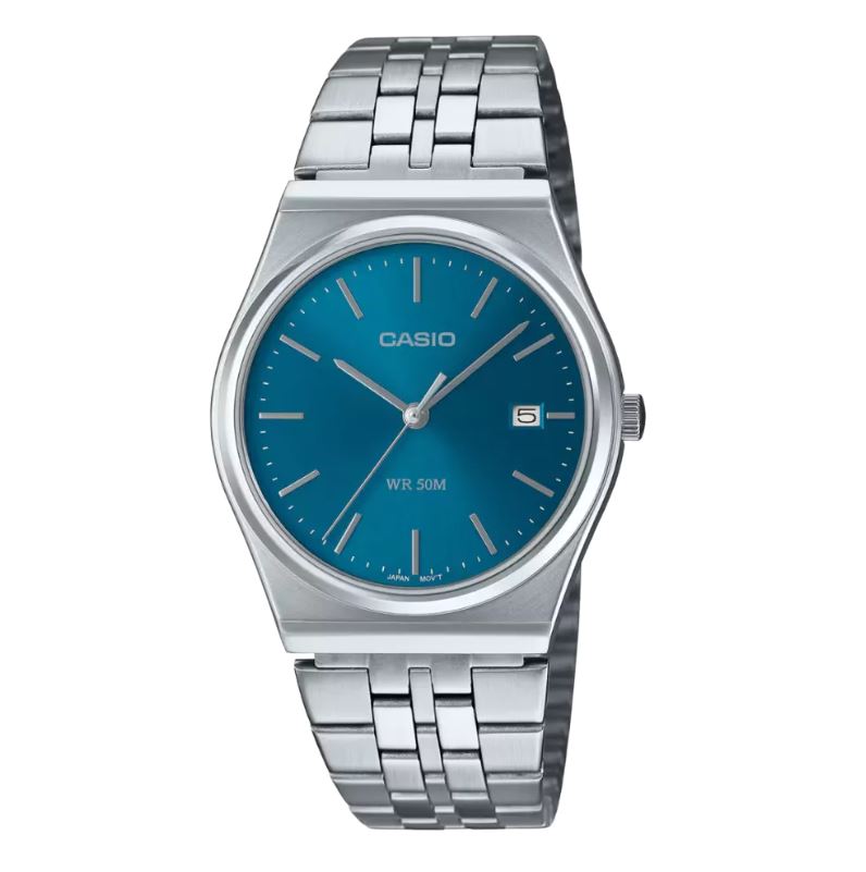 Dit Casio horloge met referentie MTP-B145D-2A2VEF is een quartz aangedreven horloge dat vervaardigd is uit een staal kast en armband. De wijzerplaat is blauw van kleur.