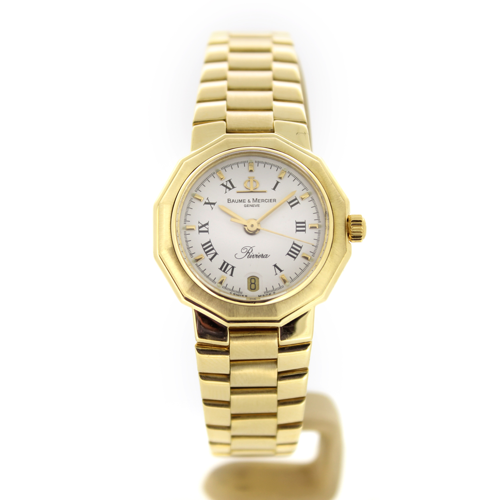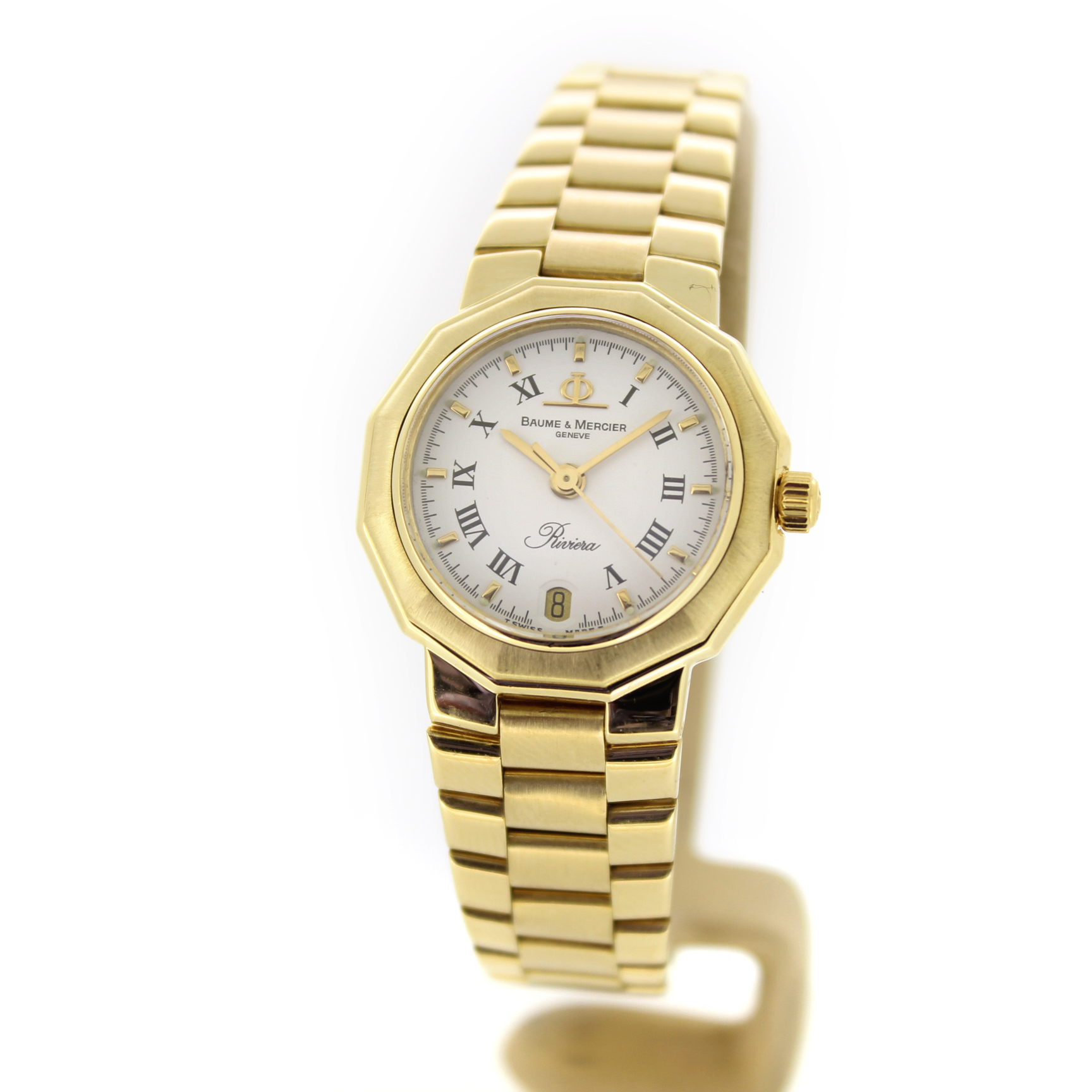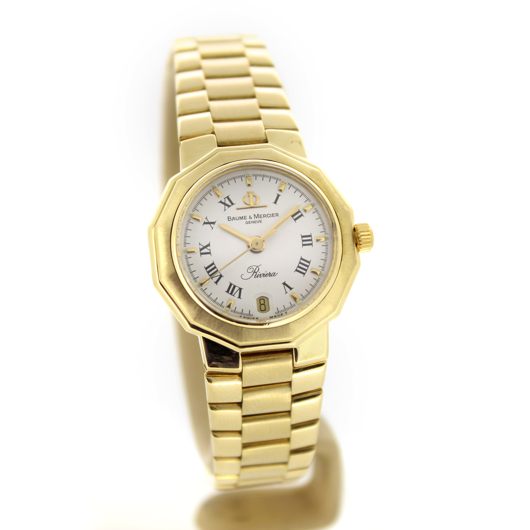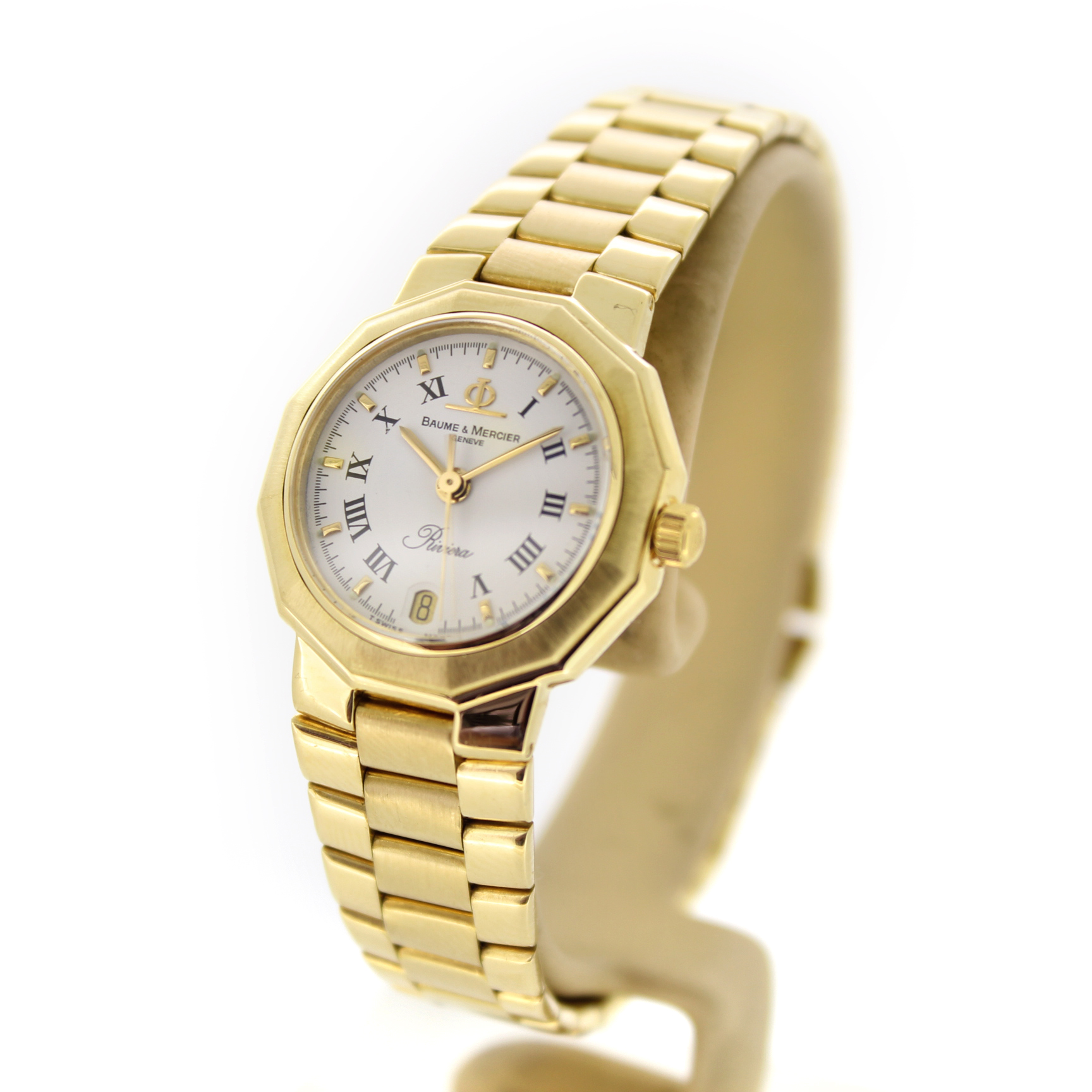 De pré-owned dames Baume & Mercier Riviera 83212 horloge is een quartz en heeft een 18 karaat geelgouden kast en armband. De wijzerplaat heeft een witte kleur en wordt beschermd met een saffier glas. Dit horloge heeft een datumaanduiding op 6uur.