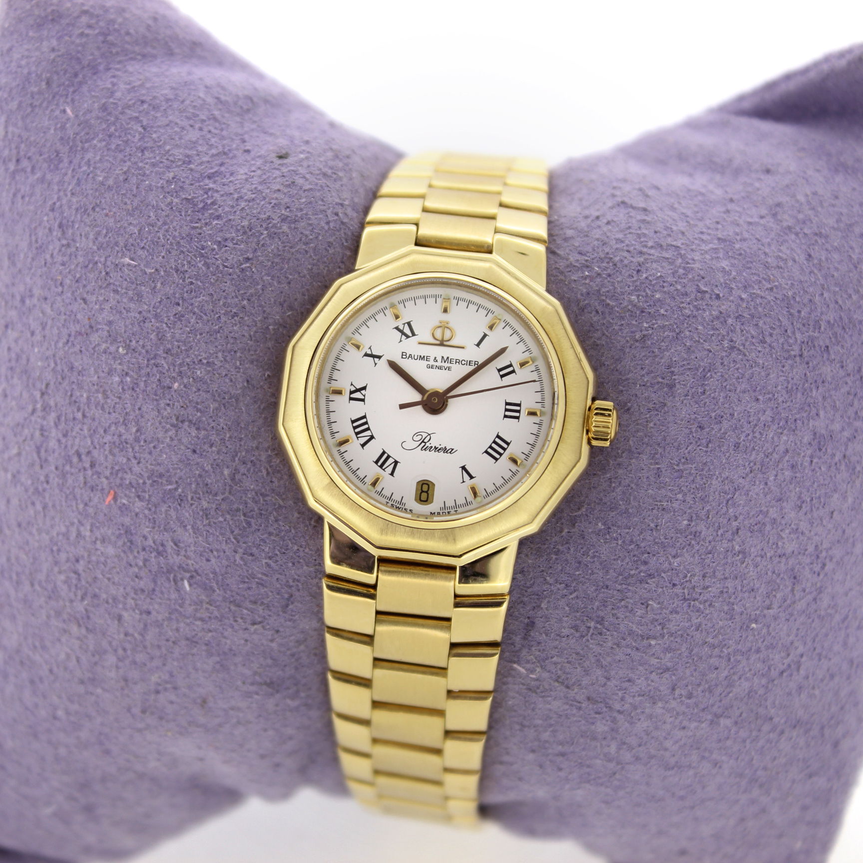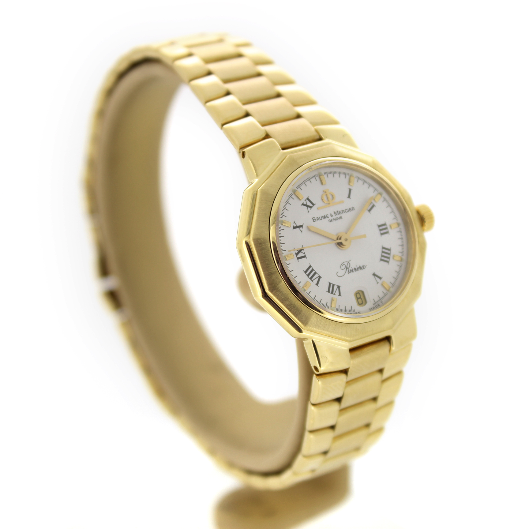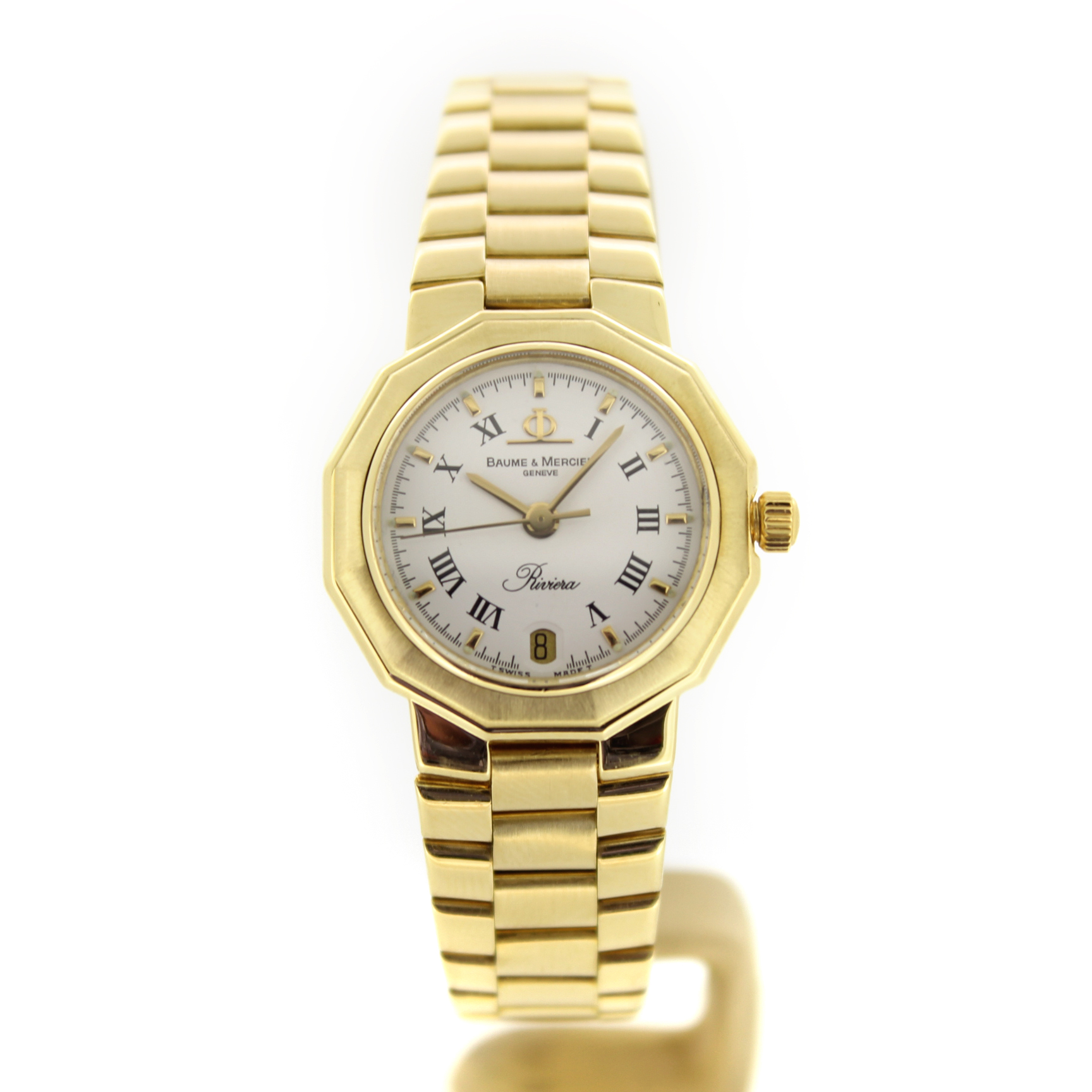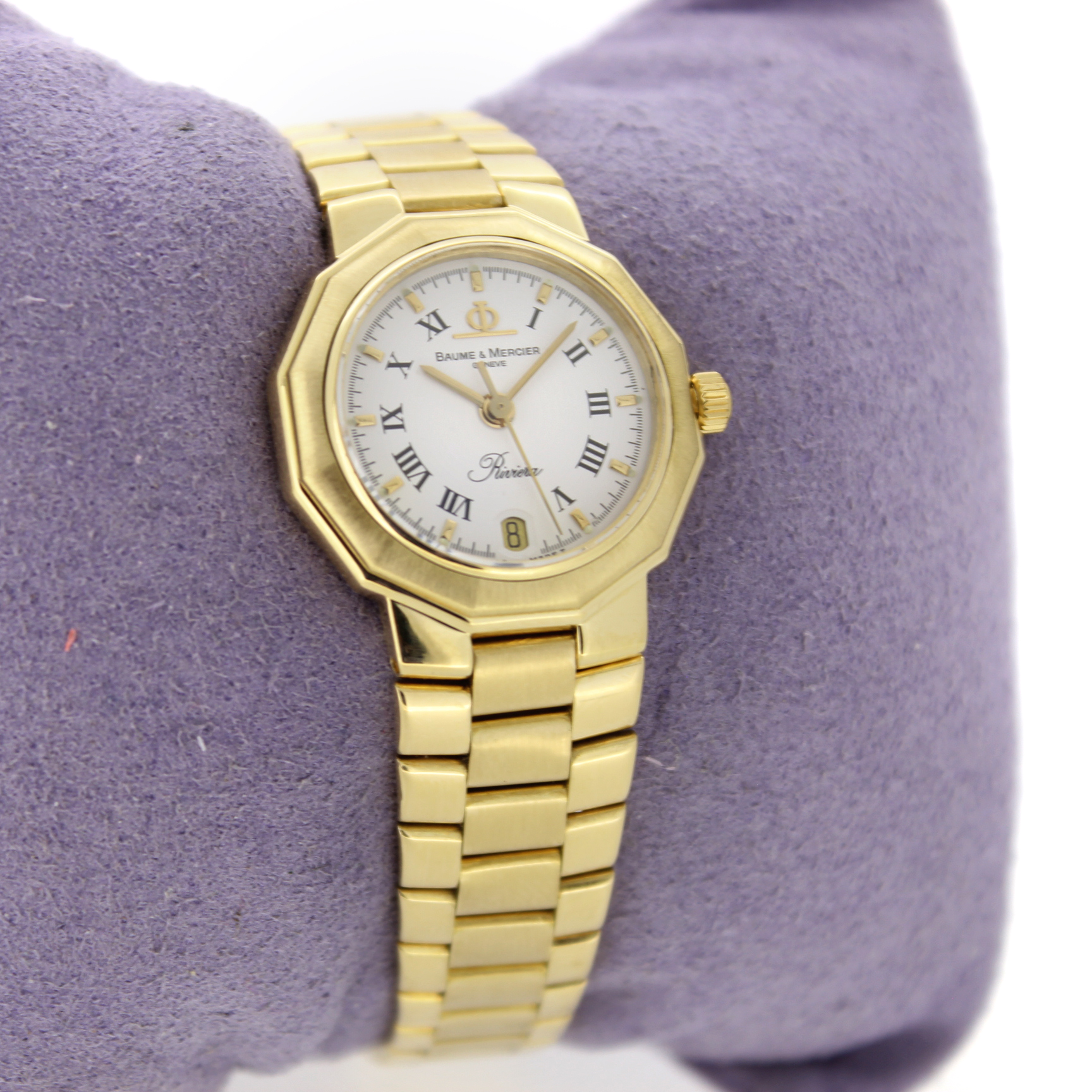 De pré-owned dames Baume & Mercier Riviera 83212 horloge is een quartz en heeft een 18 karaat geelgouden kast en armband. De wijzerplaat heeft een witte kleur en wordt beschermd met een saffier glas. Dit horloge heeft een datumaanduiding op 6uur.