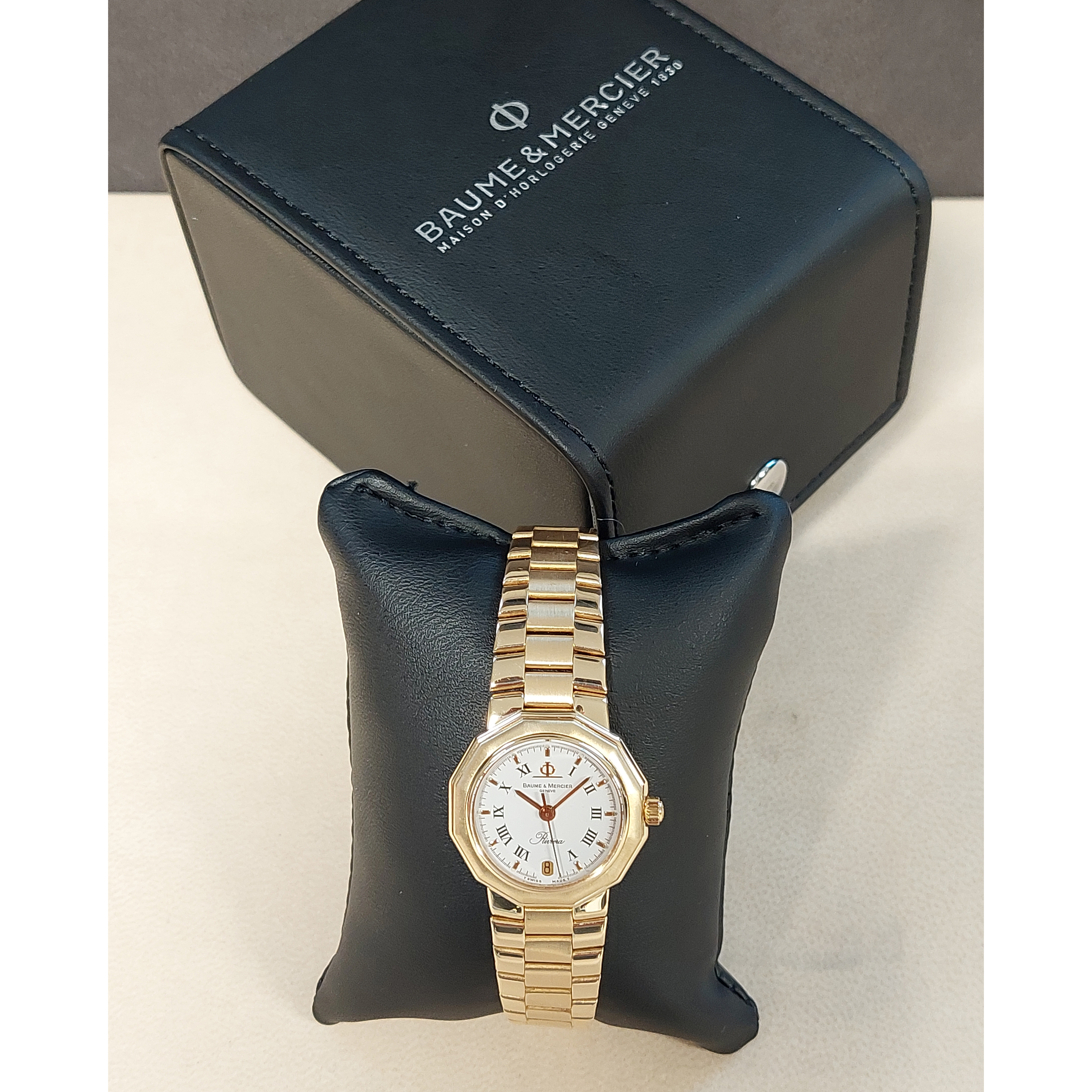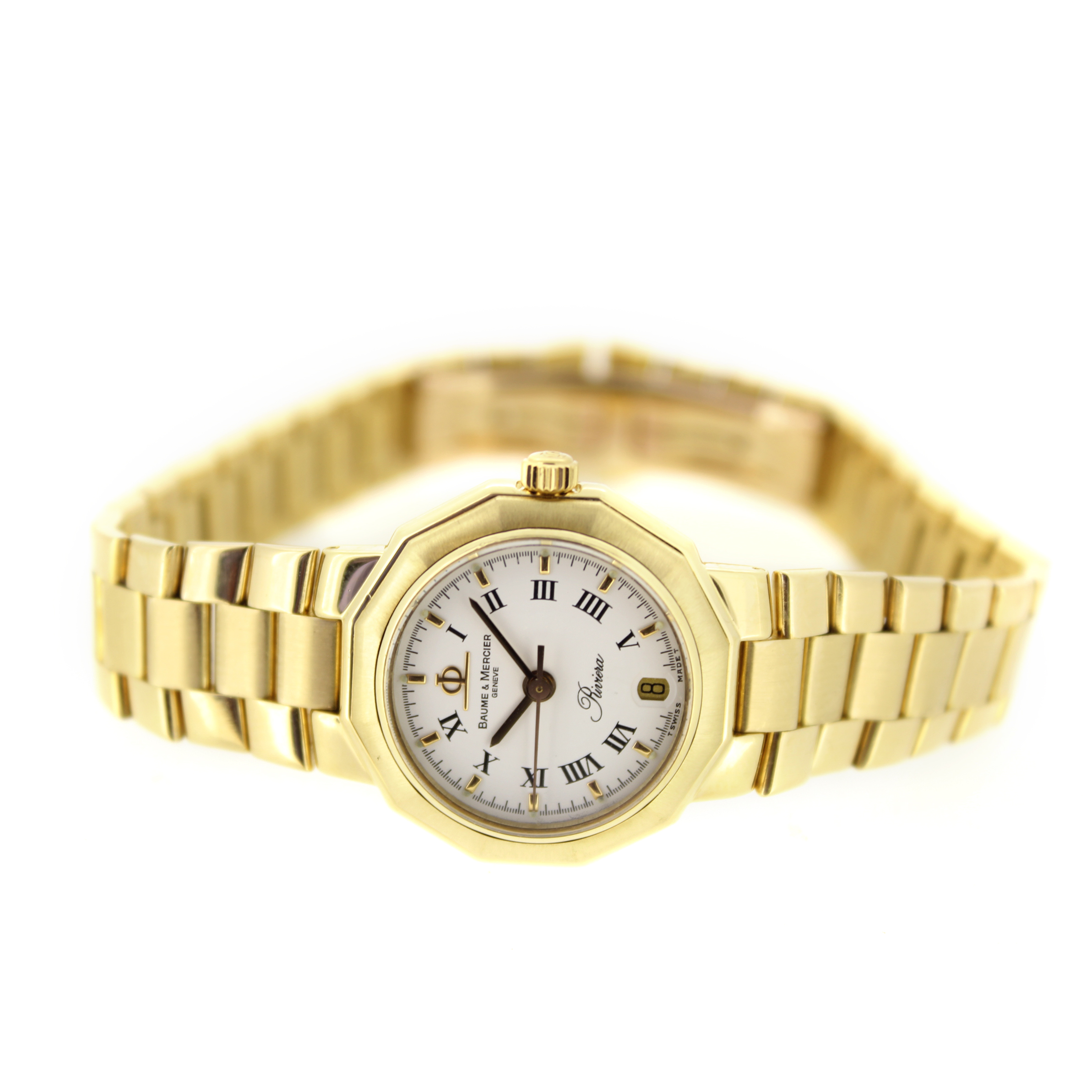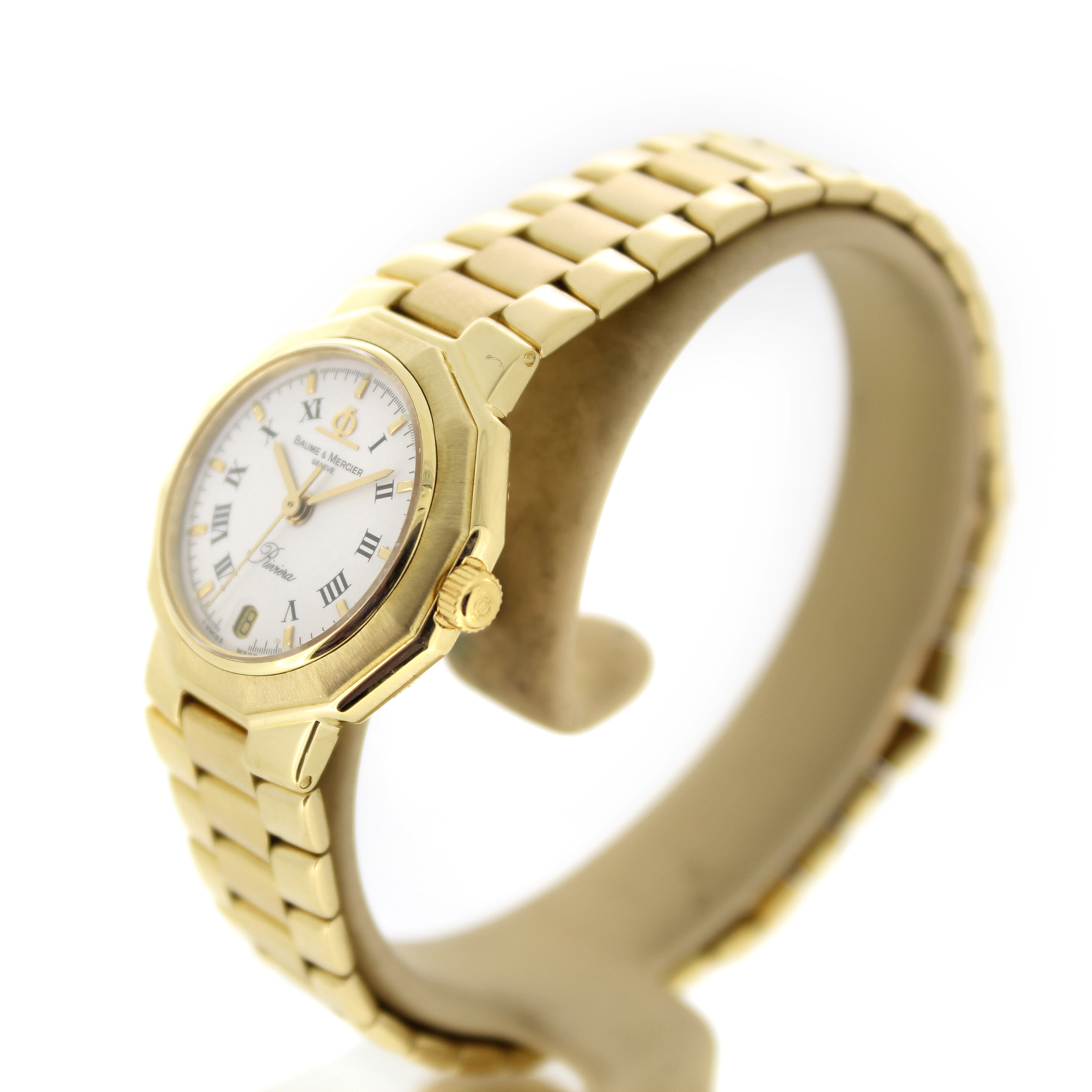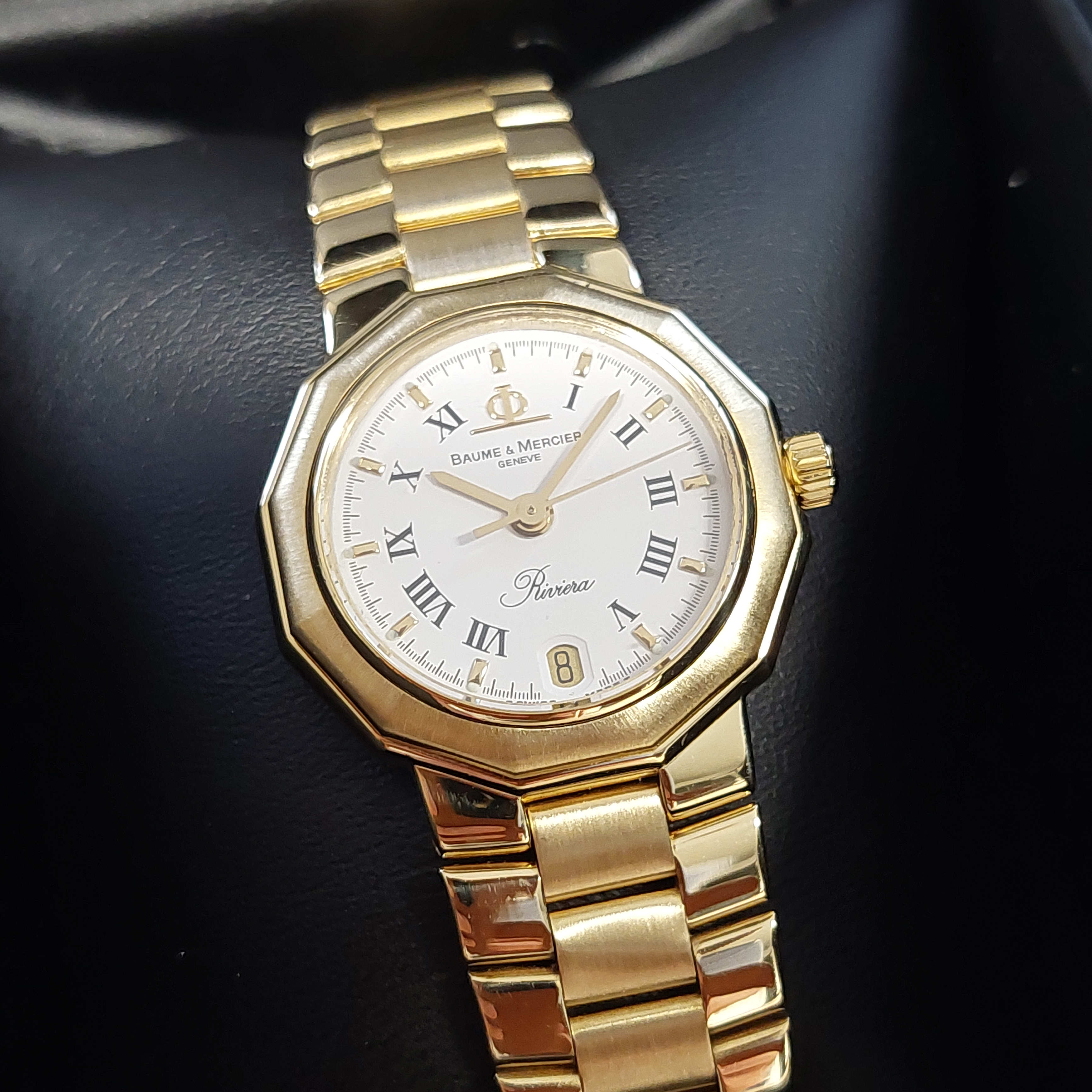De pré-owned dames Baume & Mercier Riviera 83212 horloge is een quartz en heeft een 18 karaat geelgouden kast en armband. De wijzerplaat heeft een witte kleur en wordt beschermd met een saffier glas. Dit horloge heeft een datumaanduiding op 6uur.