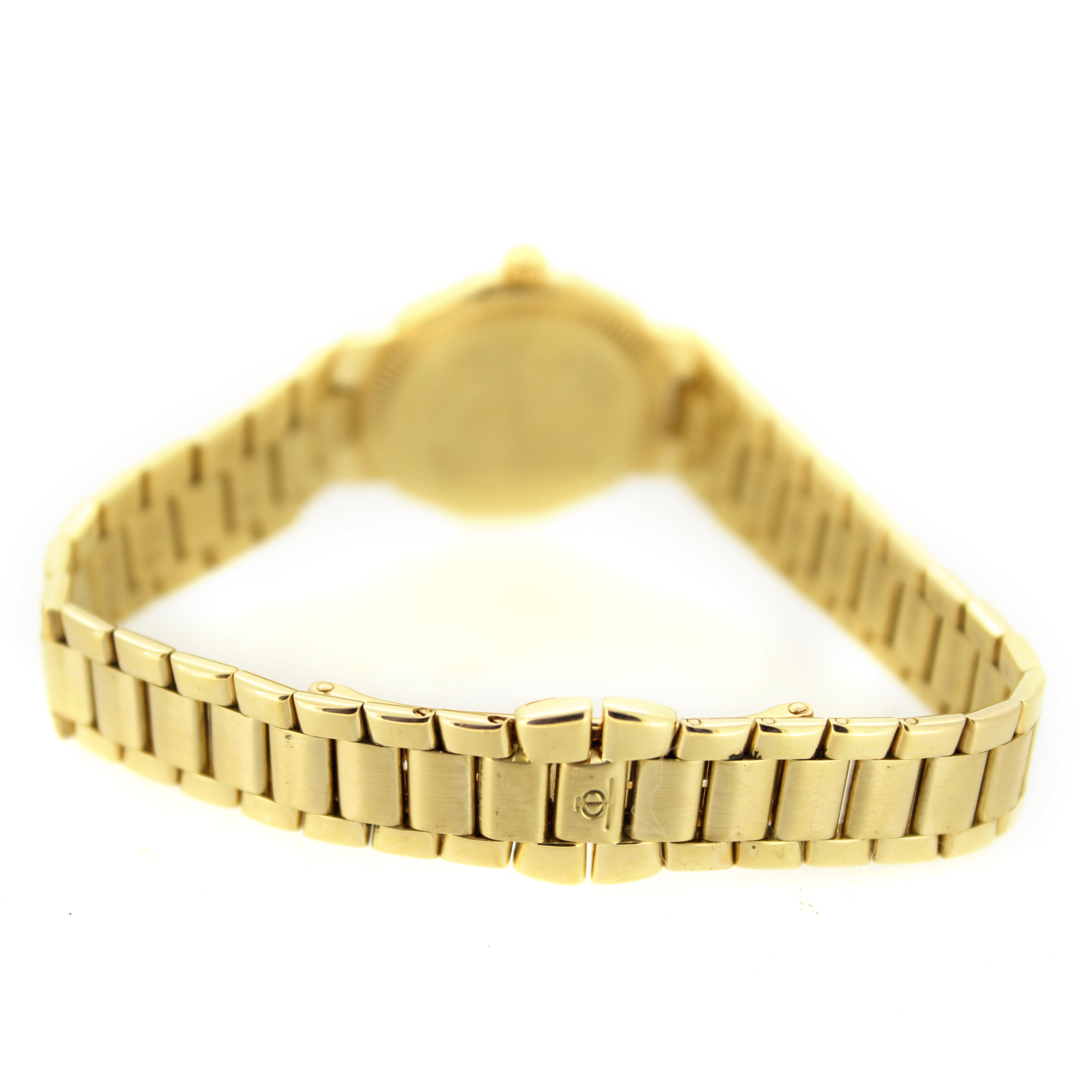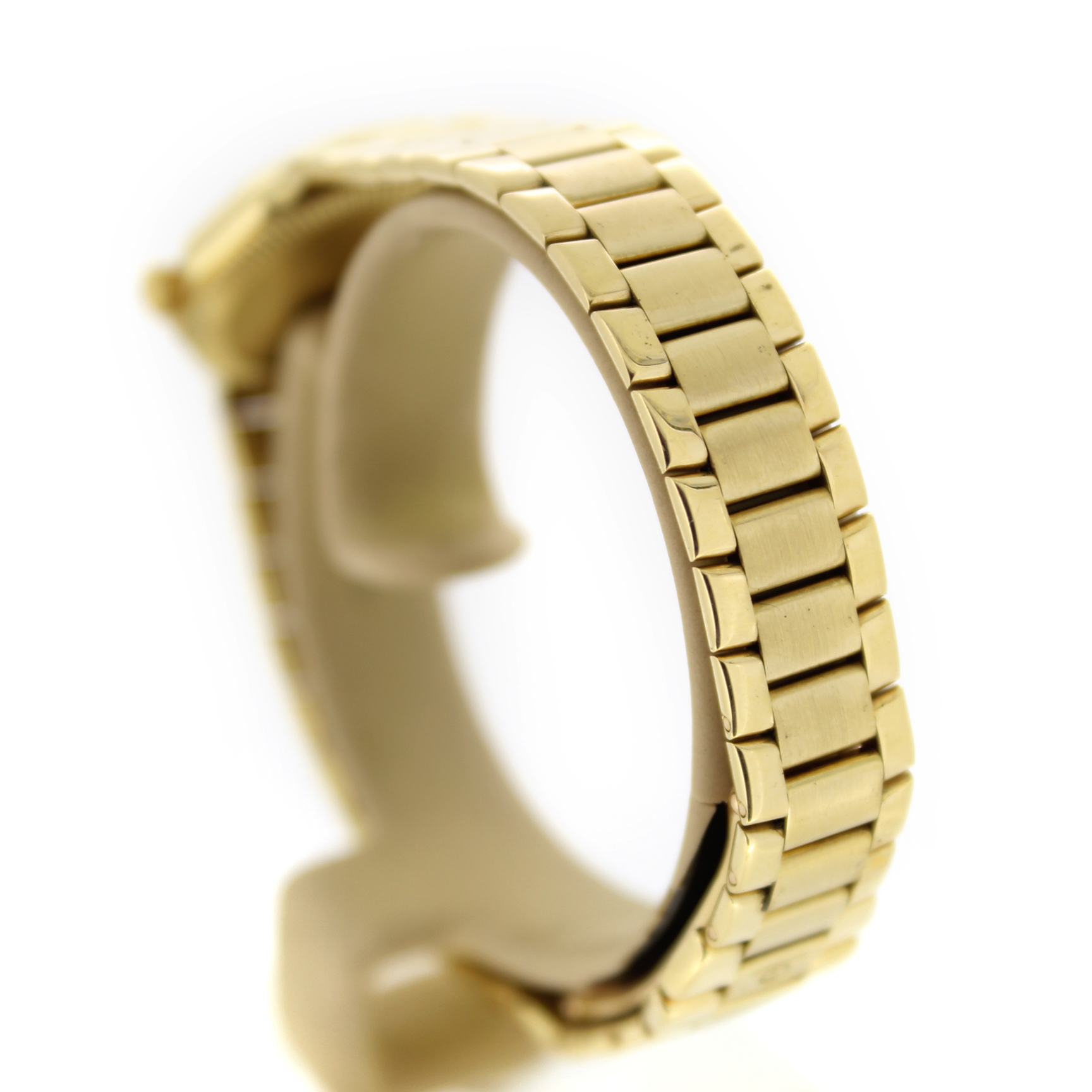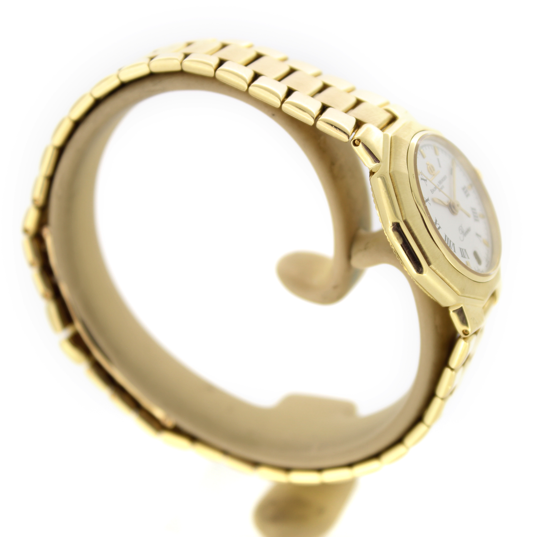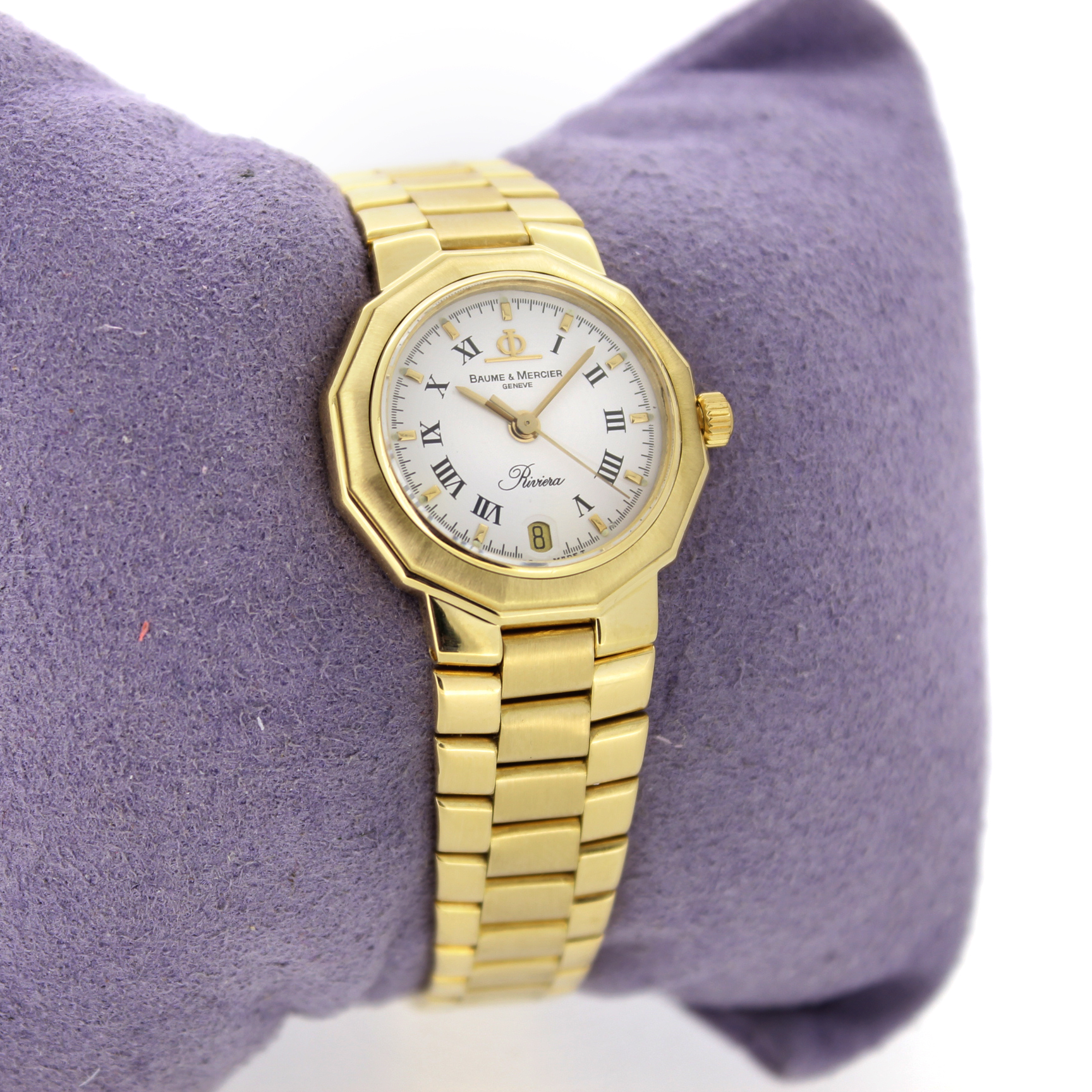 De pré-owned dames Baume & Mercier Riviera 83212 horloge is een quartz en heeft een 18 karaat geelgouden kast en armband. De wijzerplaat heeft een witte kleur en wordt beschermd met een saffier glas. Dit horloge heeft een datumaanduiding op 6uur.
