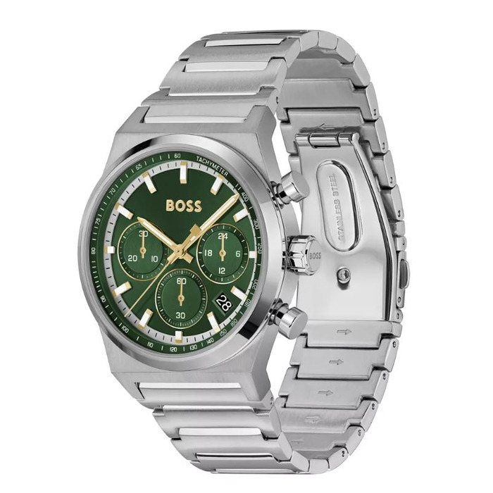 Hugo Boss candor 1514220 horloge heeft een 41mm zilverkleurige staal kast en armband. Het heeft een groene wijzerplaat met een datum aanduiding tussen 4 en 5 uur. Dit horloge bezorgt je jarenlang draagplezier!