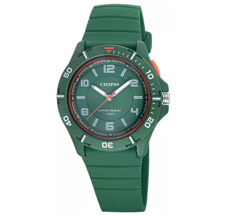 Dit Calypso horloge met de referentie K5857/4 is een quartz herenhorloge. Het horloge is vervaardigd uit een groene kunststoffen kast en groene rubberen armband.