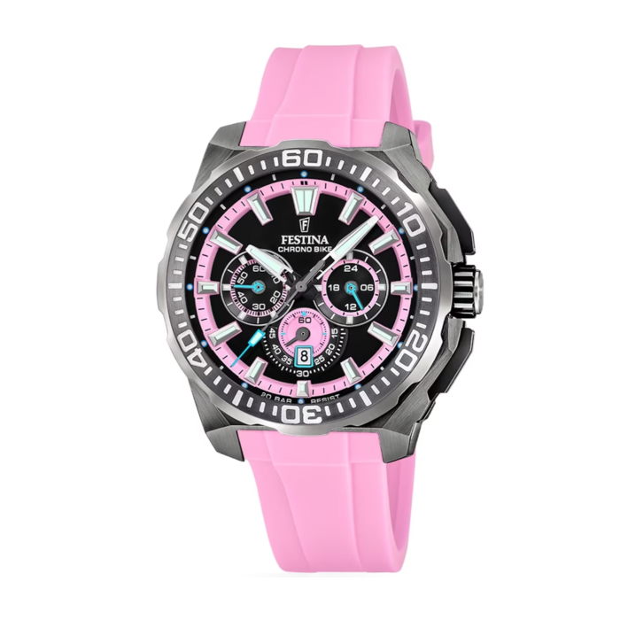 Festina, een horloge merk van de Festina group, is een innovatief Spaans horlogemerk, en richt zich op de productie van moderne, sportieve horloges. Horlogefabrikant Festina is lange tijd sponsor en officieel tijdwaarnemer geweest van wielerevenementen zoals de Tour de France en Giro d’Italia. Daarom brengt het merk al sinds begin van deze eeuw ieder jaar een op de wielersport gebaseerde serie chronografen uit: de Festina Chrono Bike. De collectie van Festina horloge bevat zowel horloges voor heren en dames.