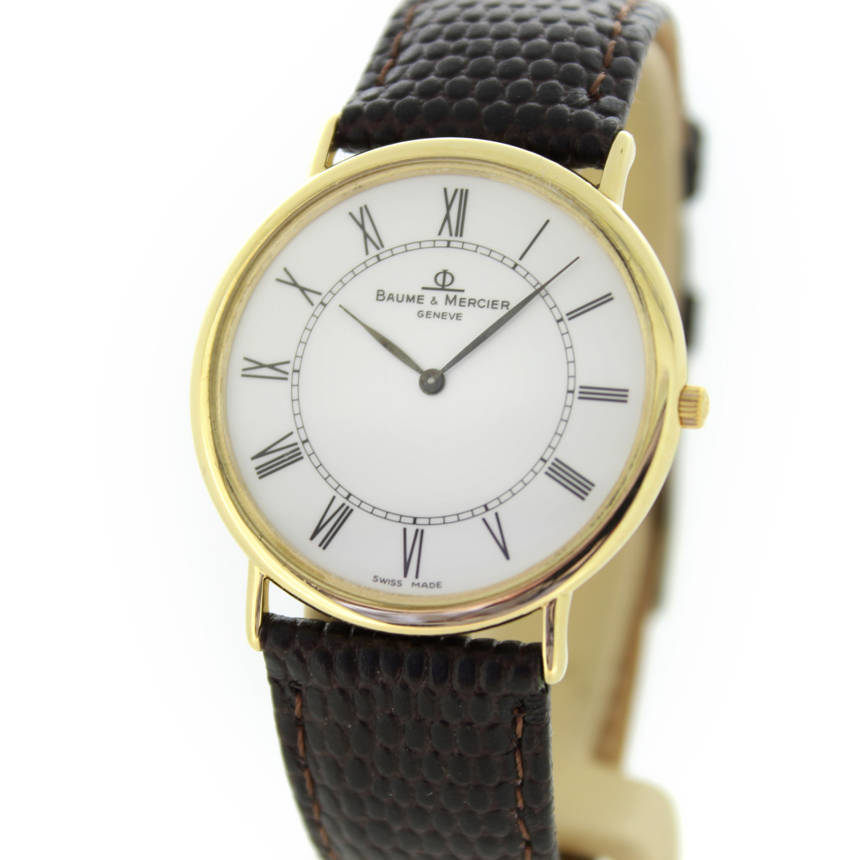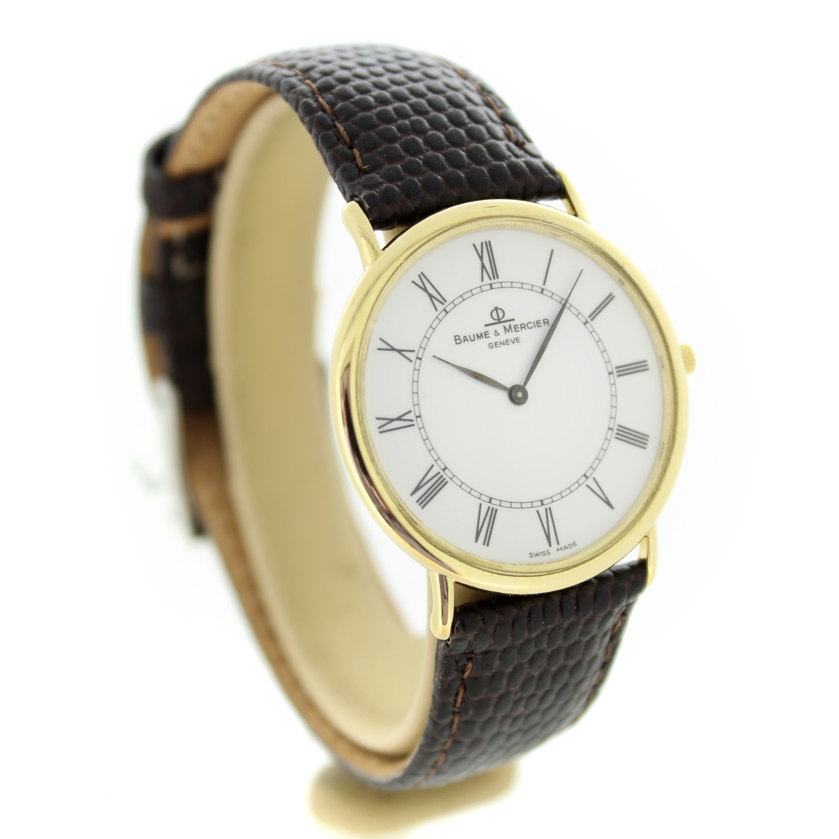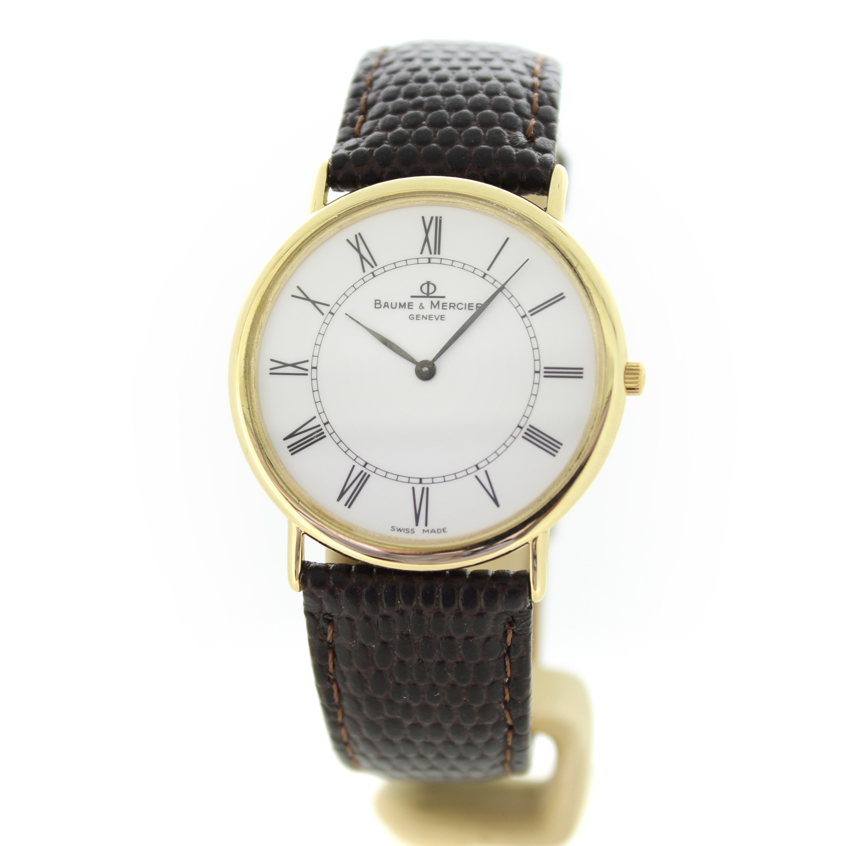 Het tweedehands horloge Baume & Mercier Classima is een prachtig exemplaar. Het heeft een quartz beweging, wat zorgt voor nauwkeurige tijdsregistratie. De kast is gemaakt van 18 karaat geelgoud, wat het horloge een luxe uitstraling geeft. De bruine leren armband zorgt voor een klassieke en elegante look, terwijl de witte wijzerplaat met saffierglas bescherming biedt tegen krassen en beschadigingen. Dit horloge combineert verfijning met praktische functies, ideaal voor liefhebbers van luxe tijdsmeters.