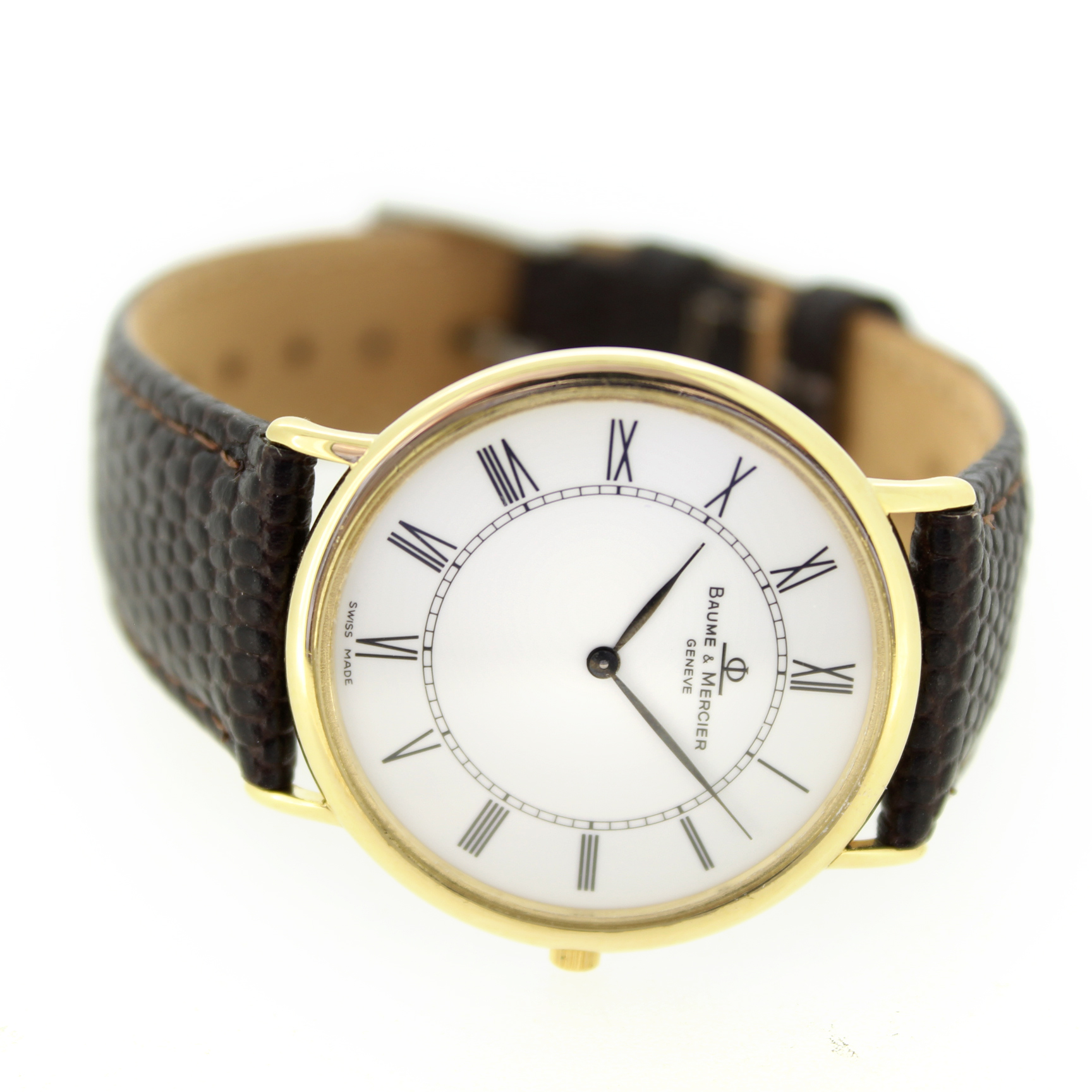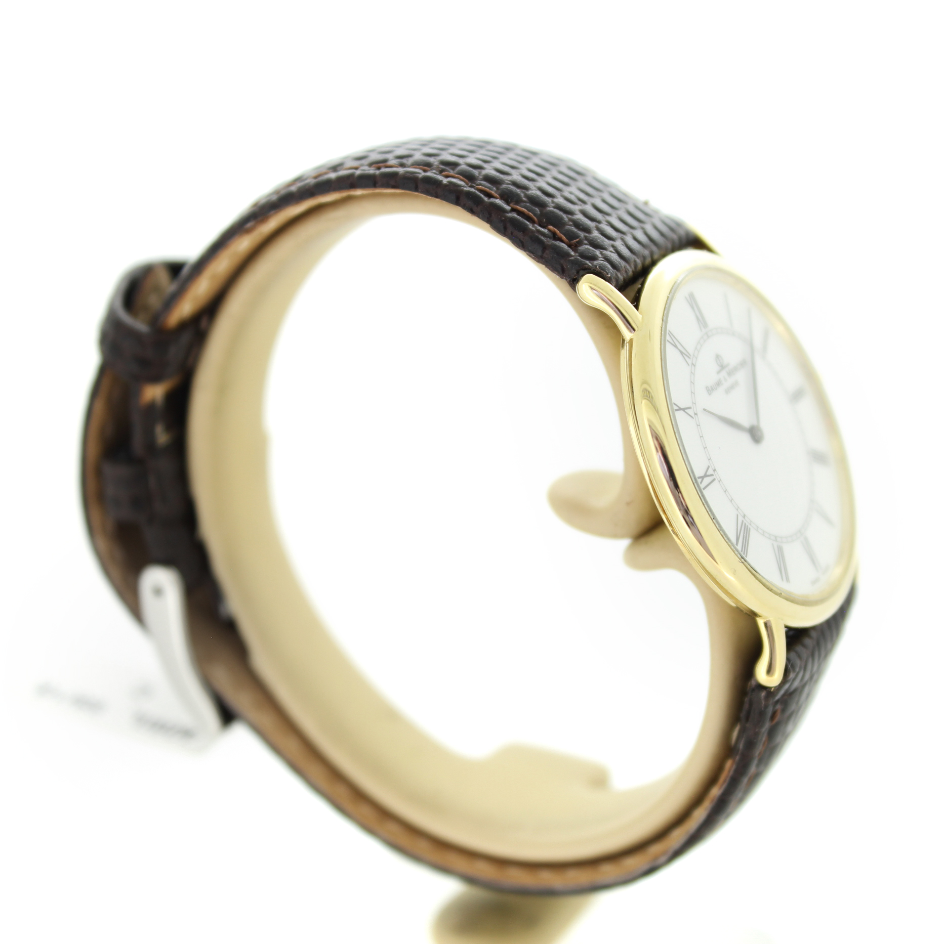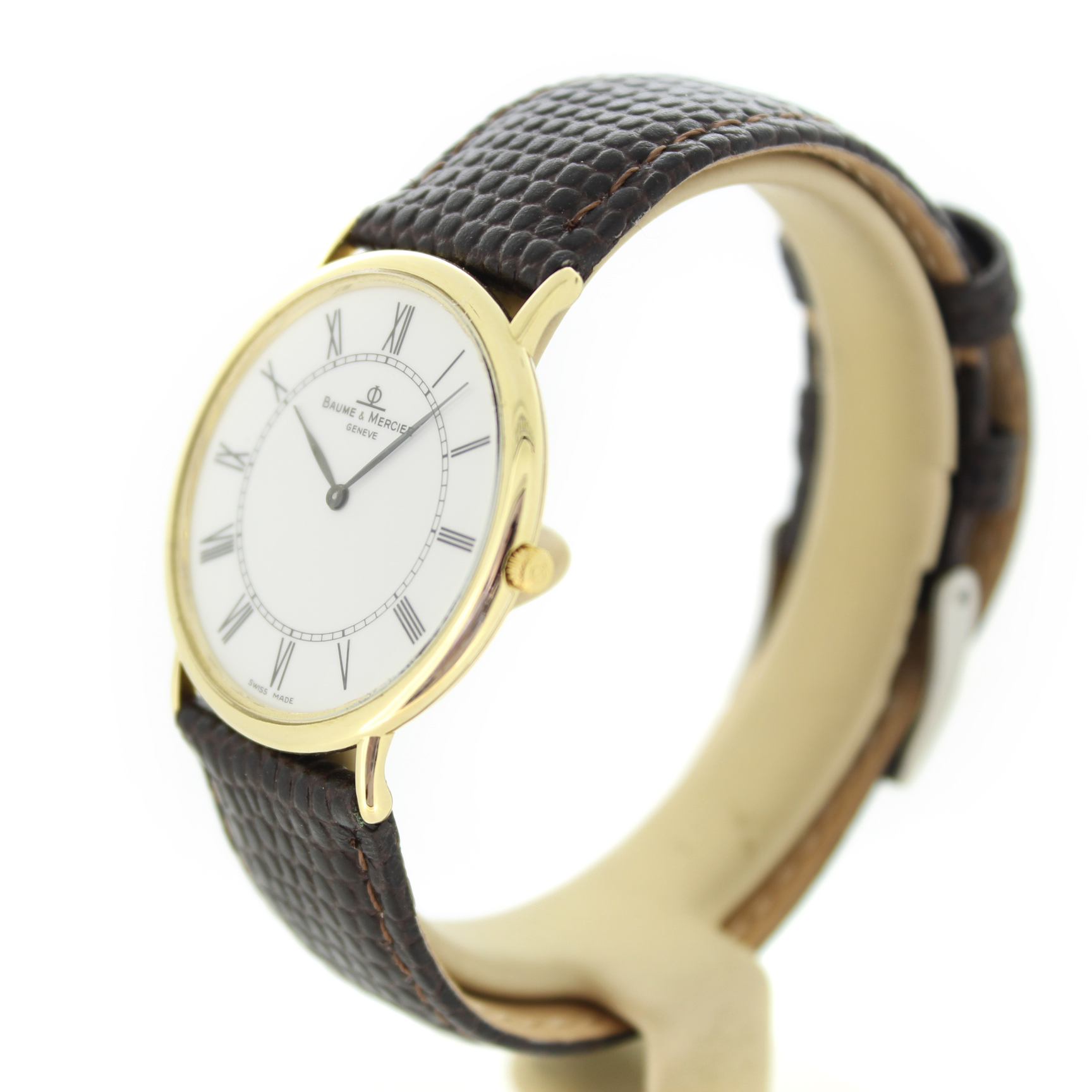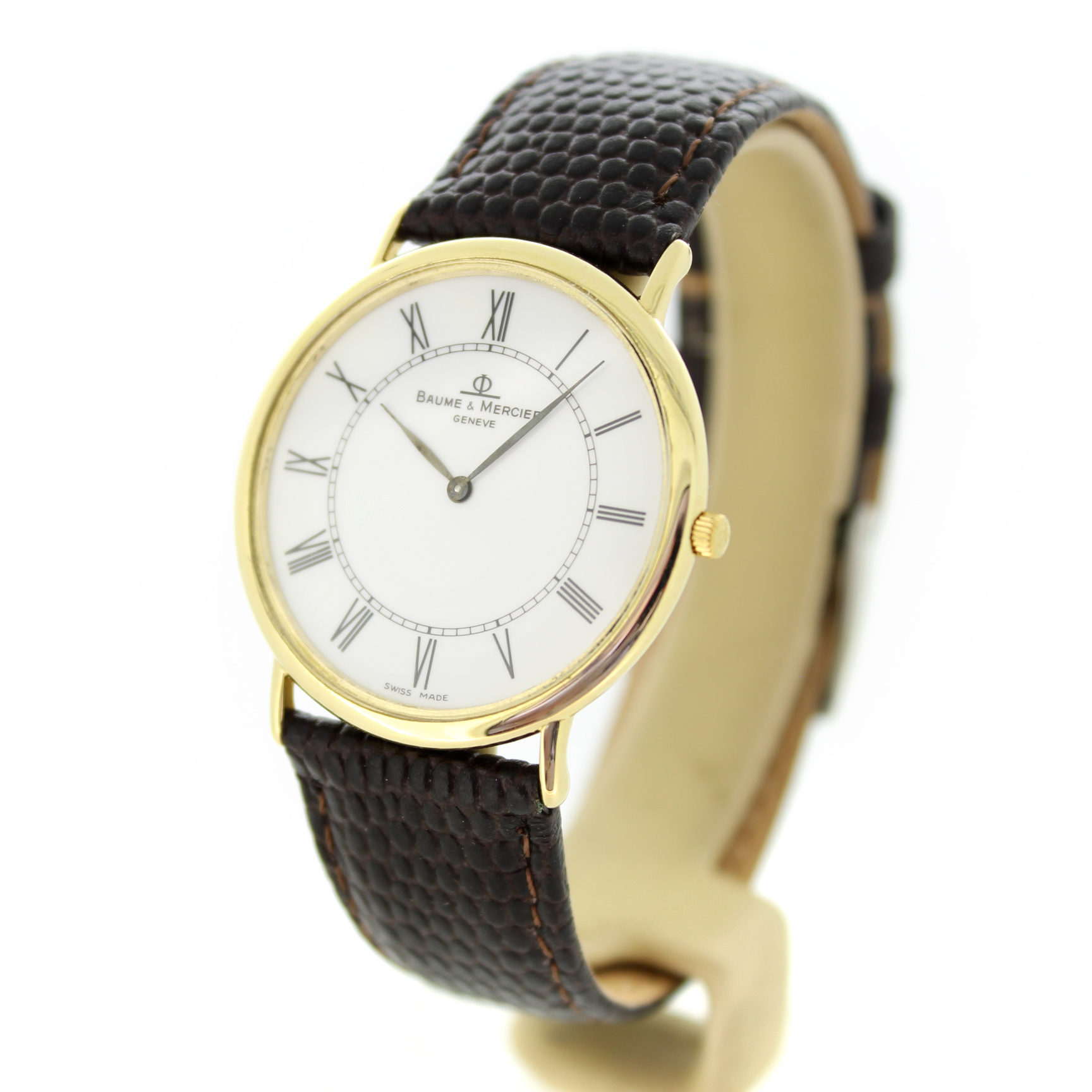 Het tweedehands horloge Baume & Mercier Classima is een prachtig exemplaar. Het heeft een quartz beweging, wat zorgt voor nauwkeurige tijdsregistratie. De kast is gemaakt van 18 karaat geelgoud, wat het horloge een luxe uitstraling geeft. De bruine leren armband zorgt voor een klassieke en elegante look, terwijl de witte wijzerplaat met saffierglas bescherming biedt tegen krassen en beschadigingen. Dit horloge combineert verfijning met praktische functies, ideaal voor liefhebbers van luxe tijdsmeters.