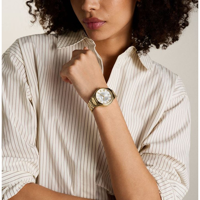Dit Fossil horloge met referentie ES5395 uit de Gilmore collectie combineert een vintage-geïnspireerd design met moderne veelzijdigheid. De slanke goudkleurige kast heeft een lichtreflecterende zilveren sunray wijzerplaat en een elegante H-link band. Een driewijzer datumuurwerk zorgt voor tijdloze functionaliteit, zodat u op schema blijft. Draag deze klassieke metgezel van ochtendvergaderingen tot een avondje uit.