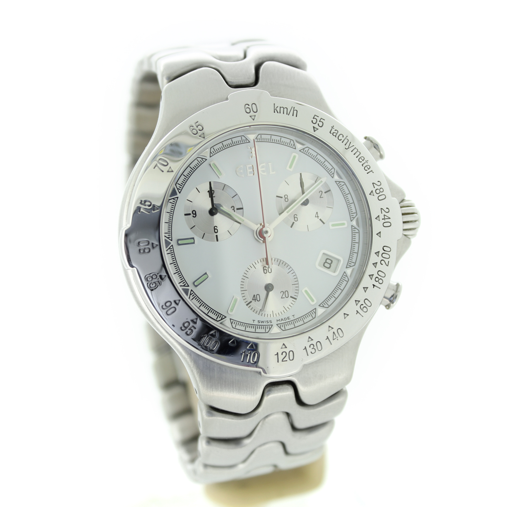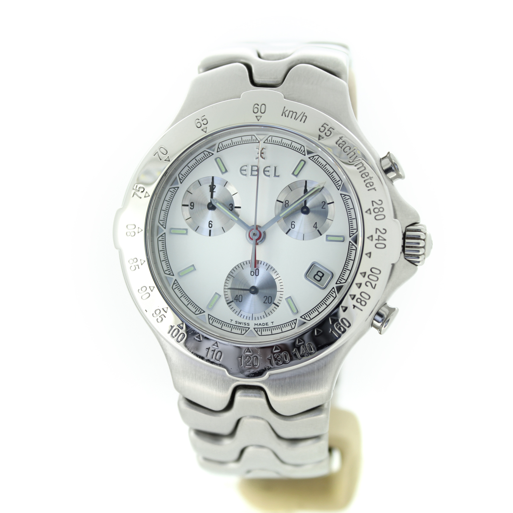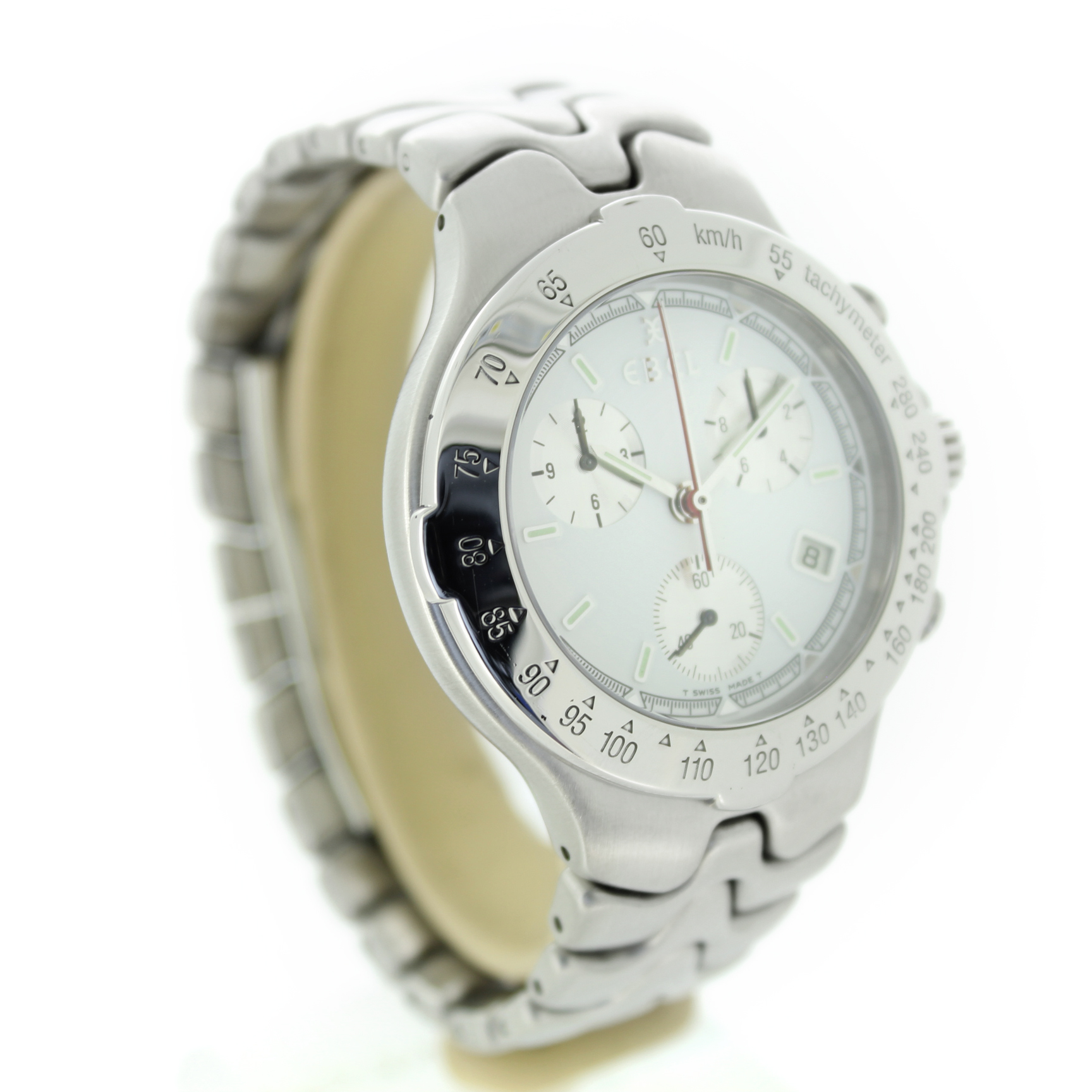Deze Ebel Sport Wave met referentie 9251641 is een stijlvol en sportief quartz horloge met een witte wijzerplaat, chronograaffunctie en datumaanduiding. Het horloge is uitgevoerd in zilverkleurig staal, heeft een kastdiameter van 40 mm en verkeert in goede conditie.