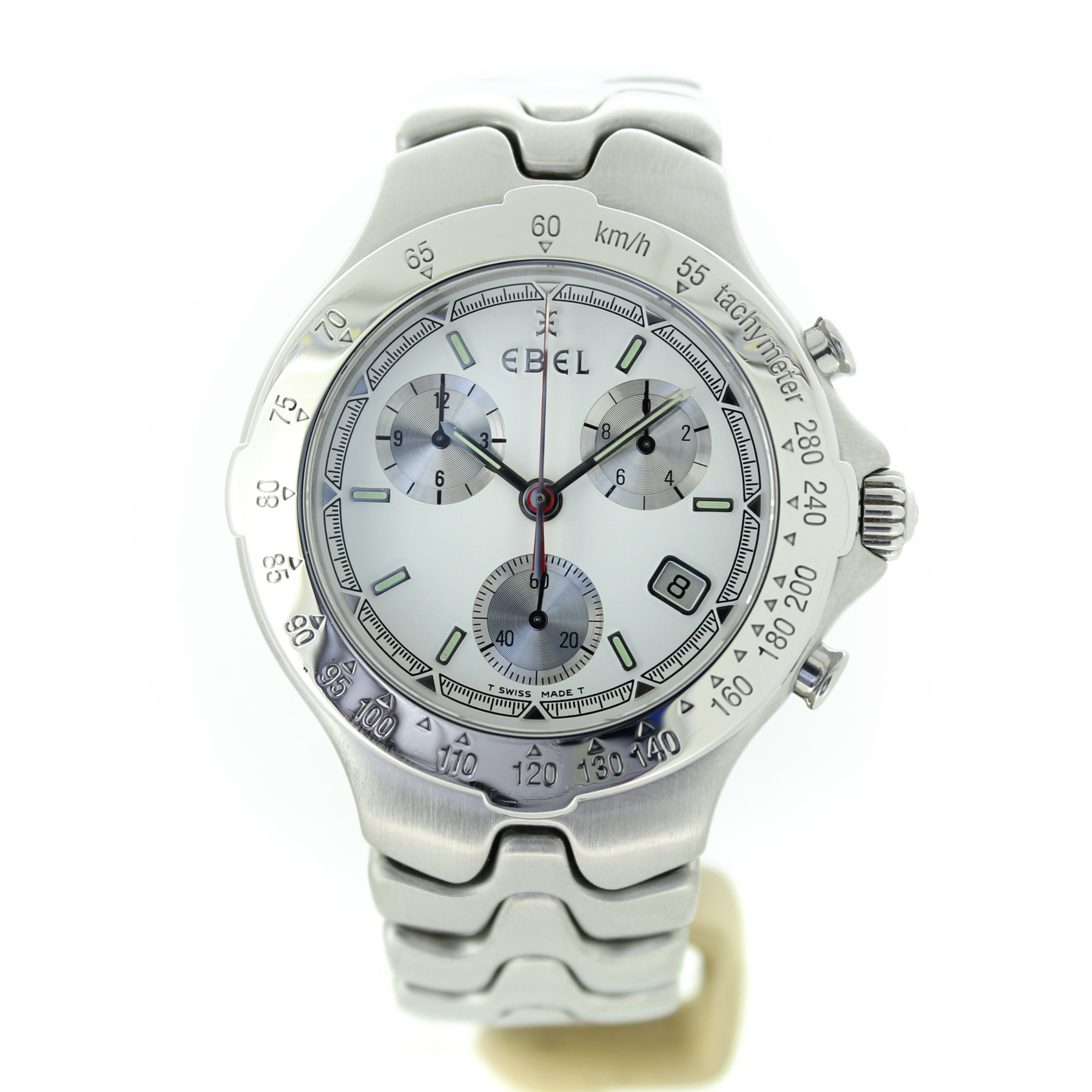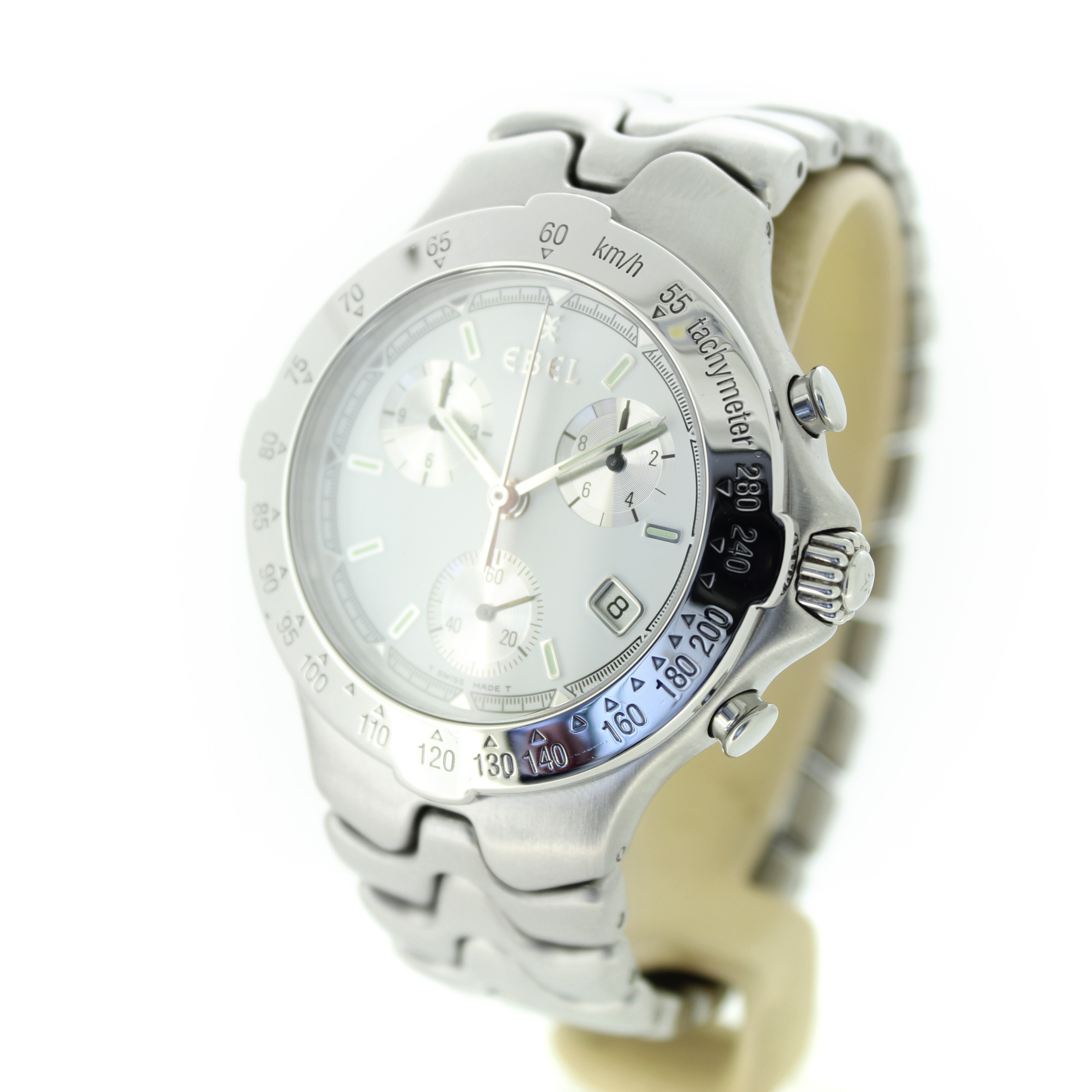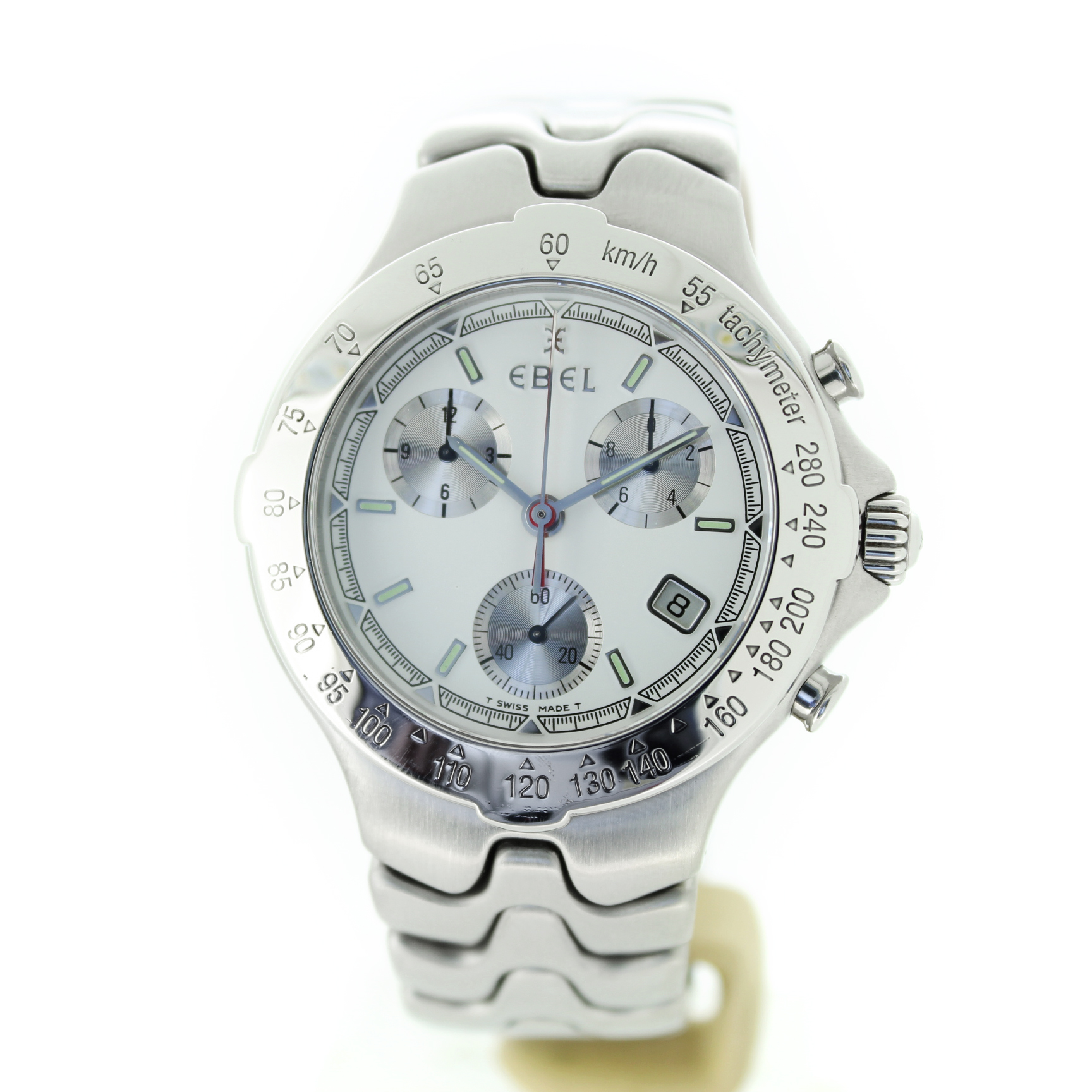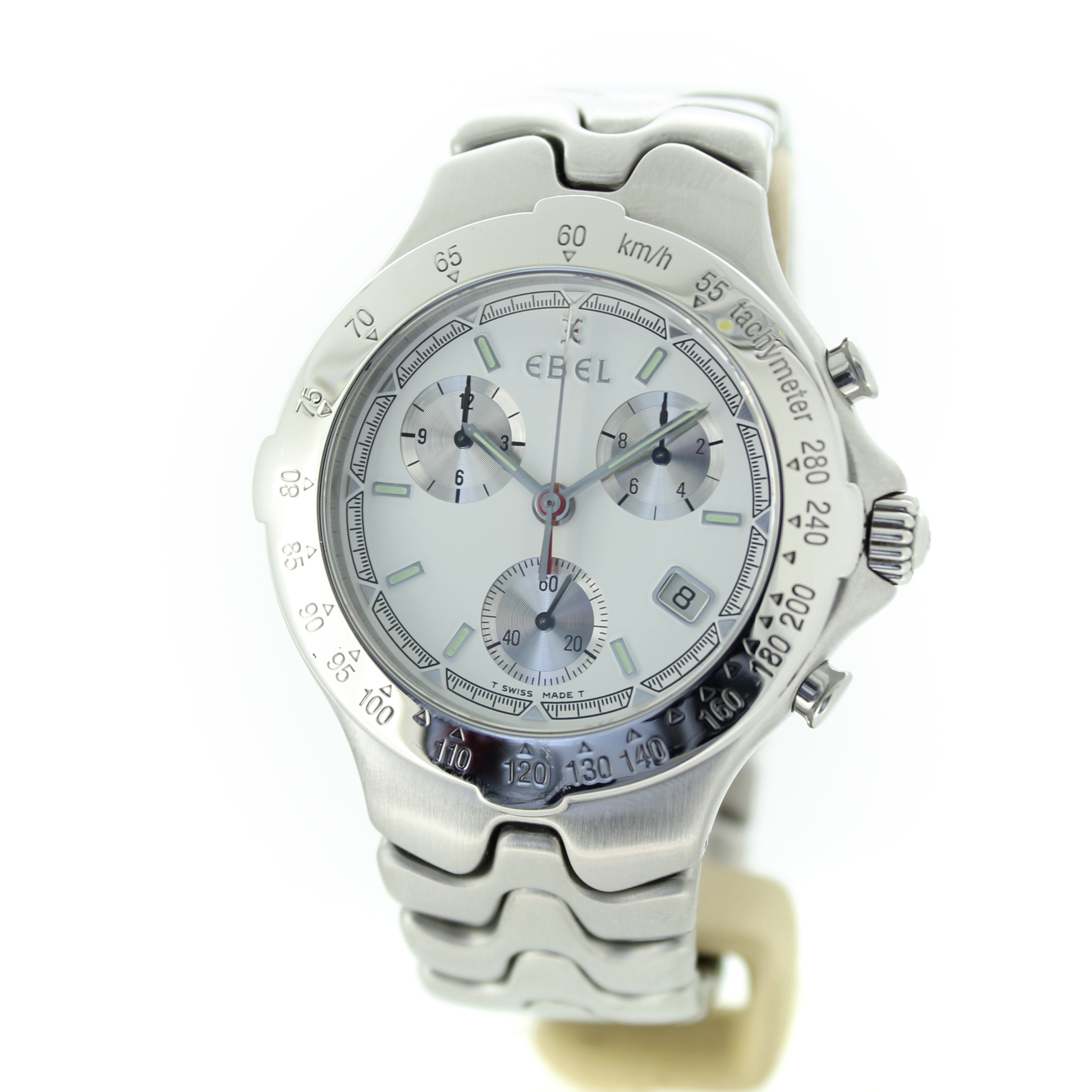 Deze Ebel Sport Wave met referentie 9251641 is een stijlvol en sportief quartz horloge met een witte wijzerplaat, chronograaffunctie en datumaanduiding. Het horloge is uitgevoerd in zilverkleurig staal, heeft een kastdiameter van 40 mm en verkeert in goede conditie.