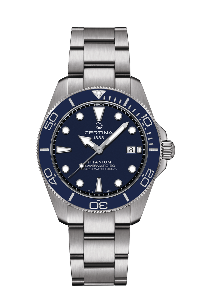 De blauwe wijzerplaat wordt beschermd door krasbestendig saffierglas met een enkelvoudige anti-reflectiecoating, waardoor optimale leesbaarheid onder water en in fel zonlicht gegarandeerd is. Binnenin tikt het Zwitserse ETA Powermatic 80 uurwerk, met een gangreserve van maar liefst 80 uur – betrouwbaar, nauwkeurig en bestand tegen schokken dankzij het Double Security (DS) systeem van Certina.