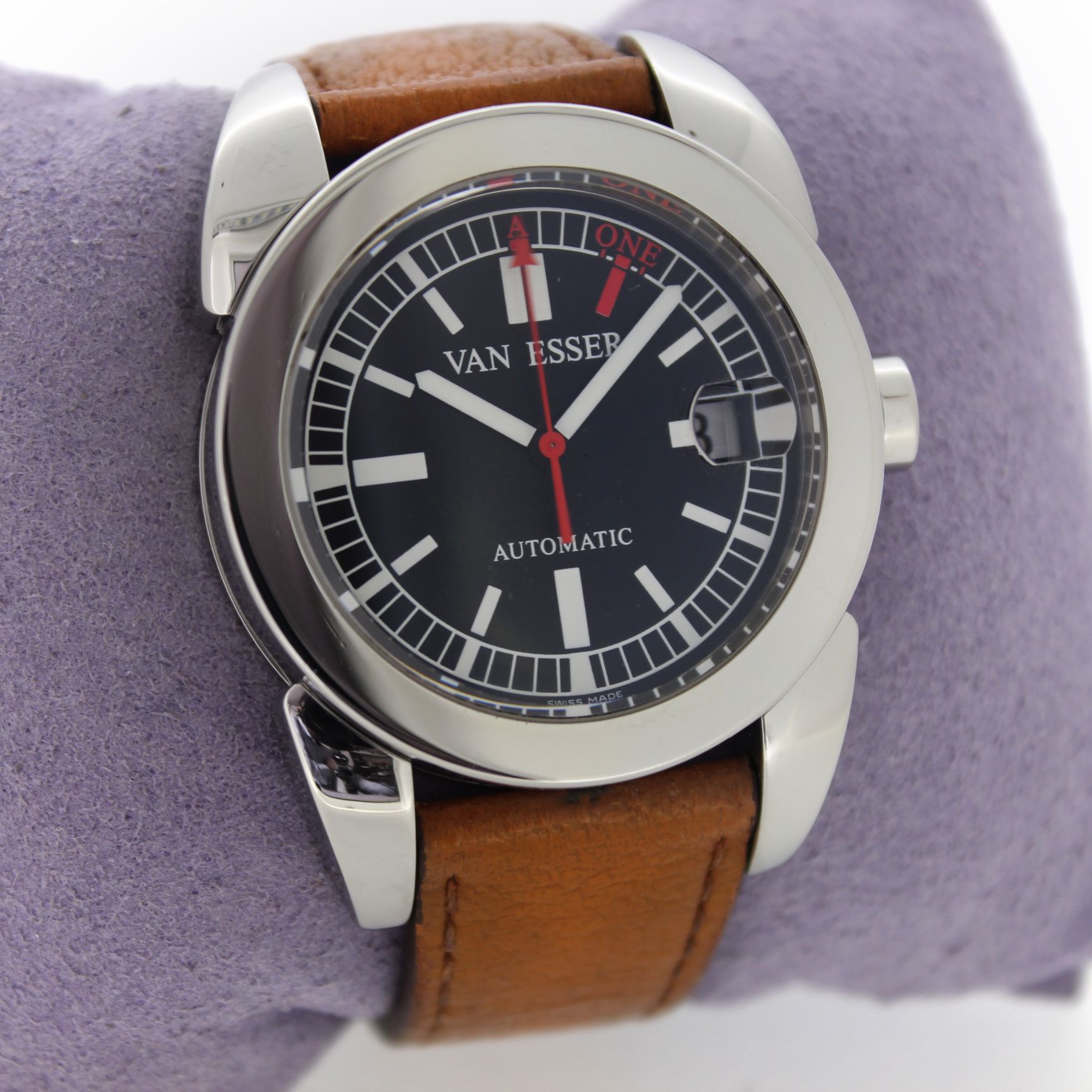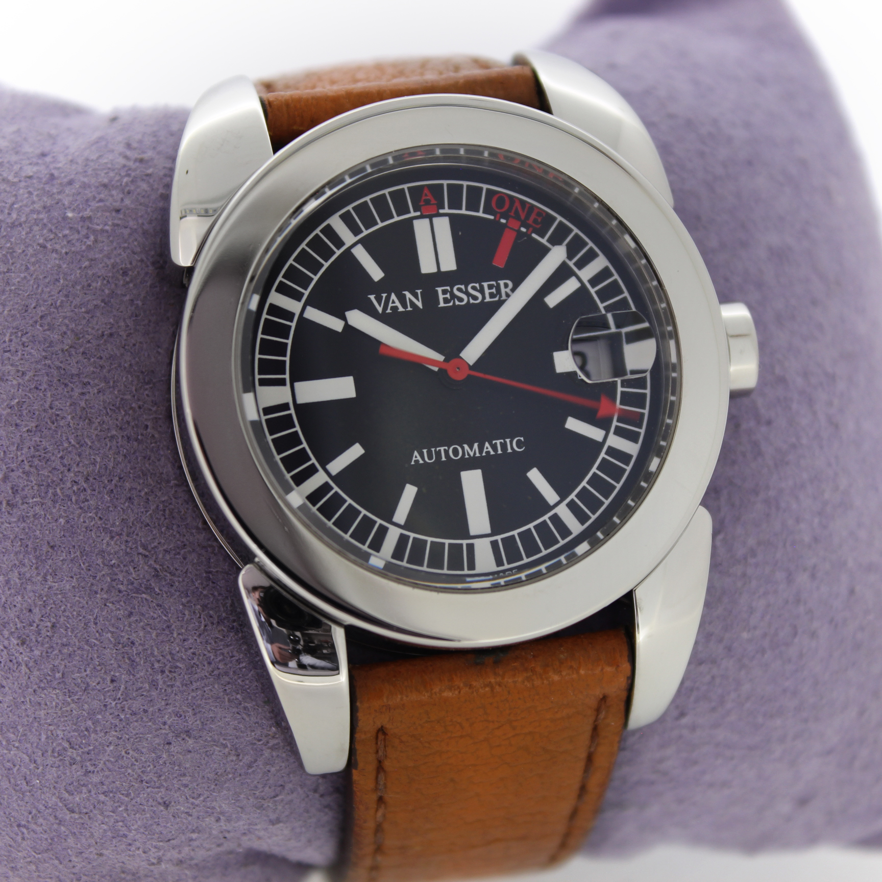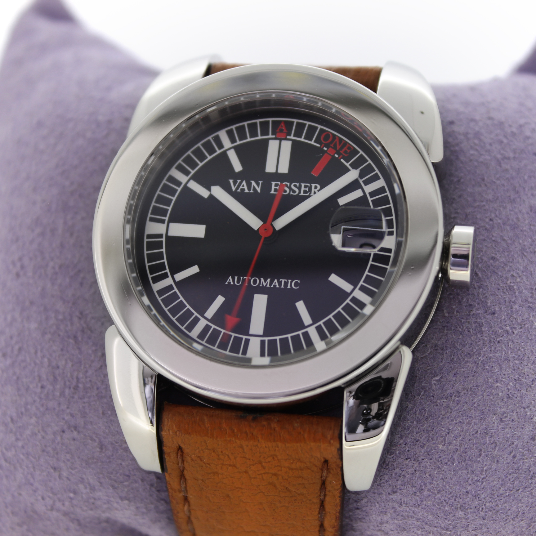 De pre-owned Van Esser A One Automatic A1-3801-167-ST horloge wordt aangeboden in onze zaak en heeft een zilverkleurige staal kast en een gloednieuwe bruine leder armband. Het Van Esser horloge beschikt over een zwarte wijzerplaat met datum aanduiding.