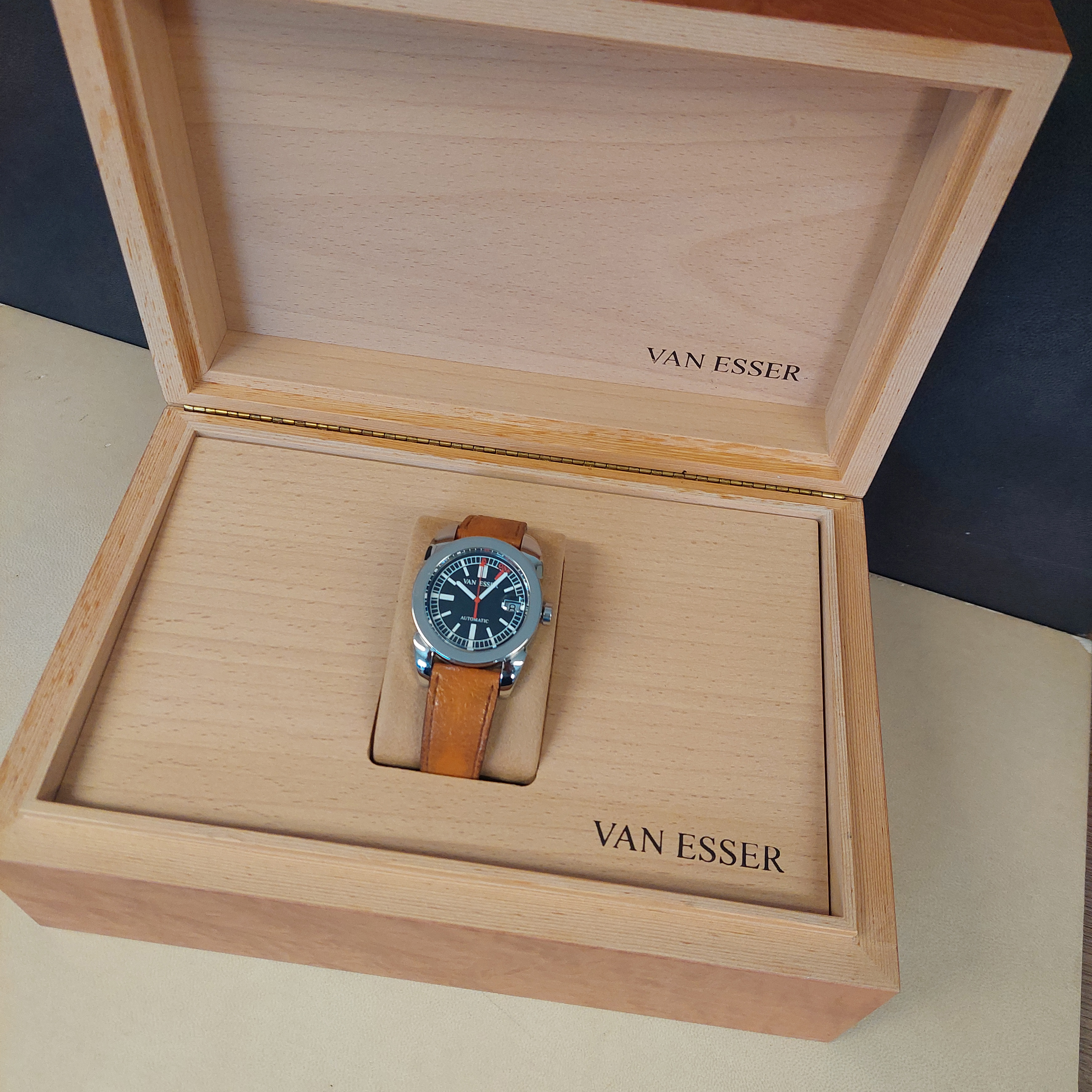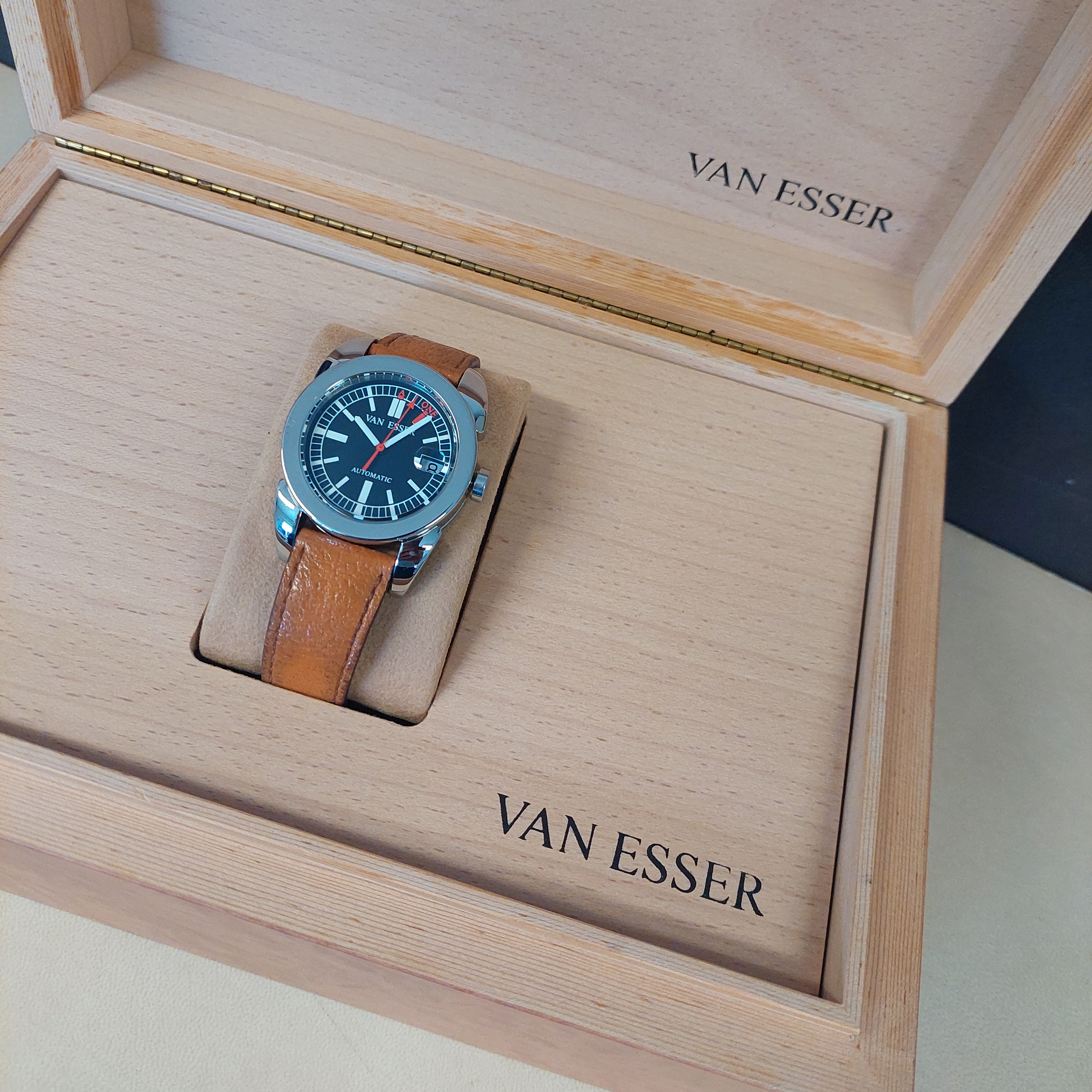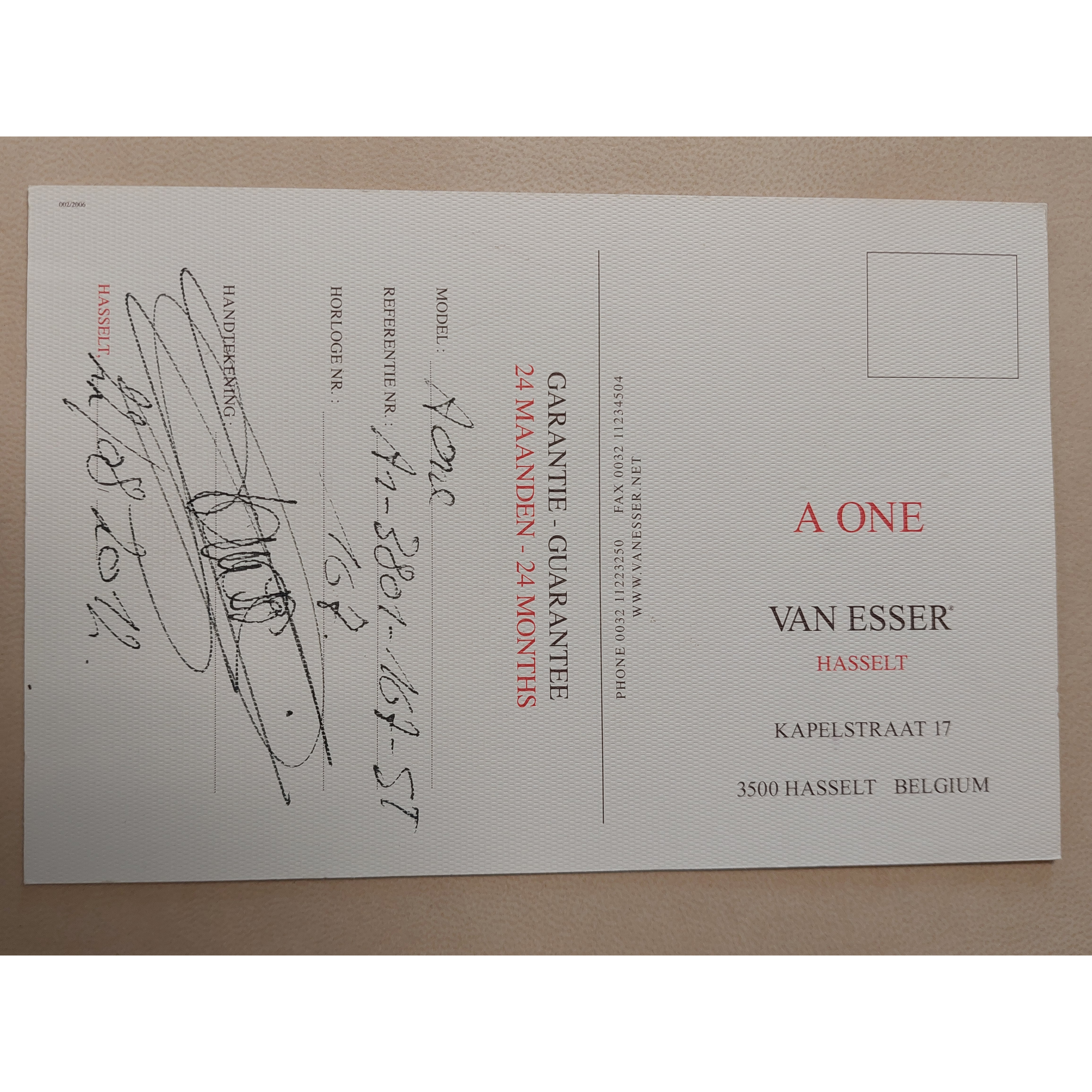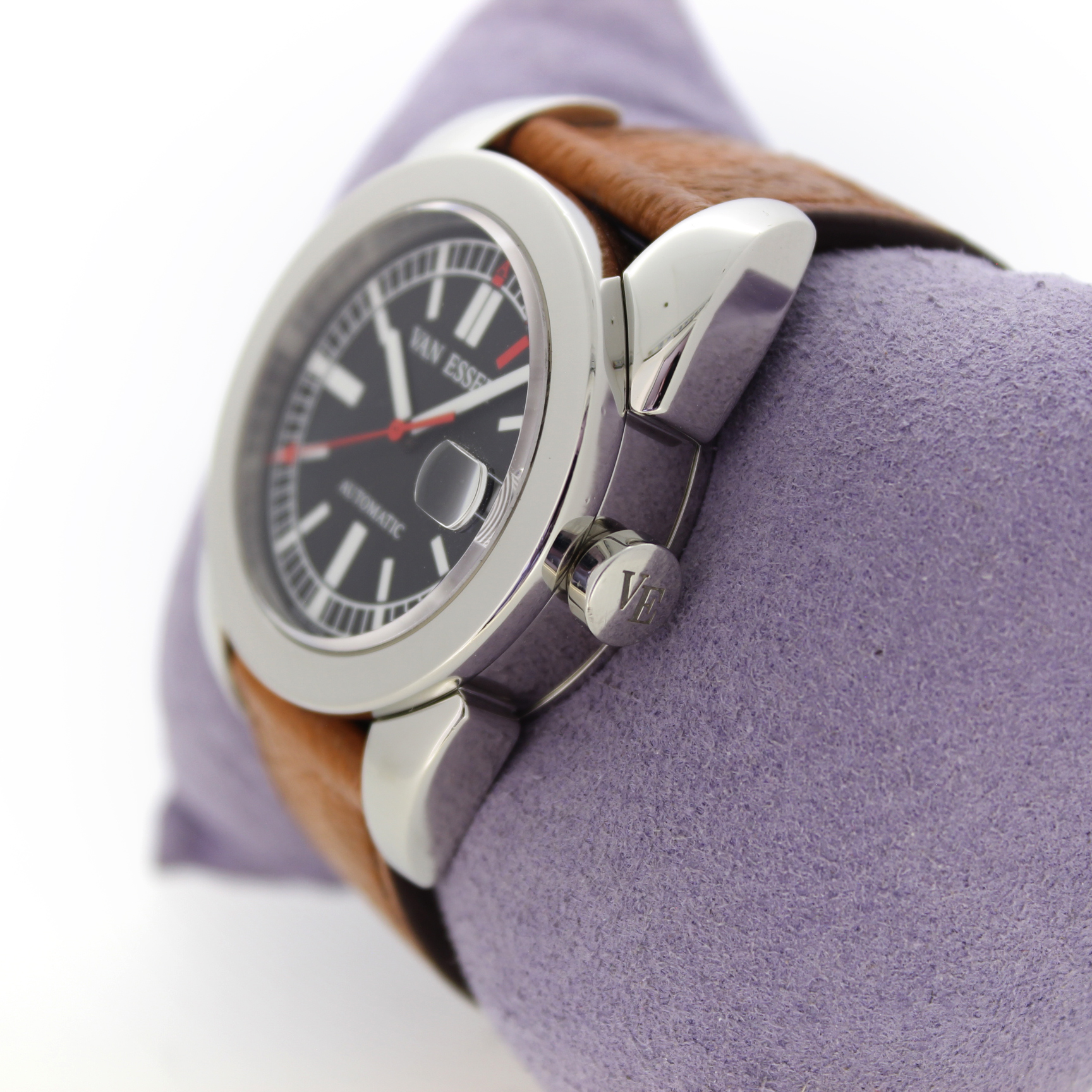 De pre-owned Van Esser A One Automatic A1-3801-167-ST horloge wordt aangeboden in onze zaak en heeft een zilverkleurige staal kast en een gloednieuwe bruine leder armband. Het Van Esser horloge beschikt over een zwarte wijzerplaat met datum aanduiding.
