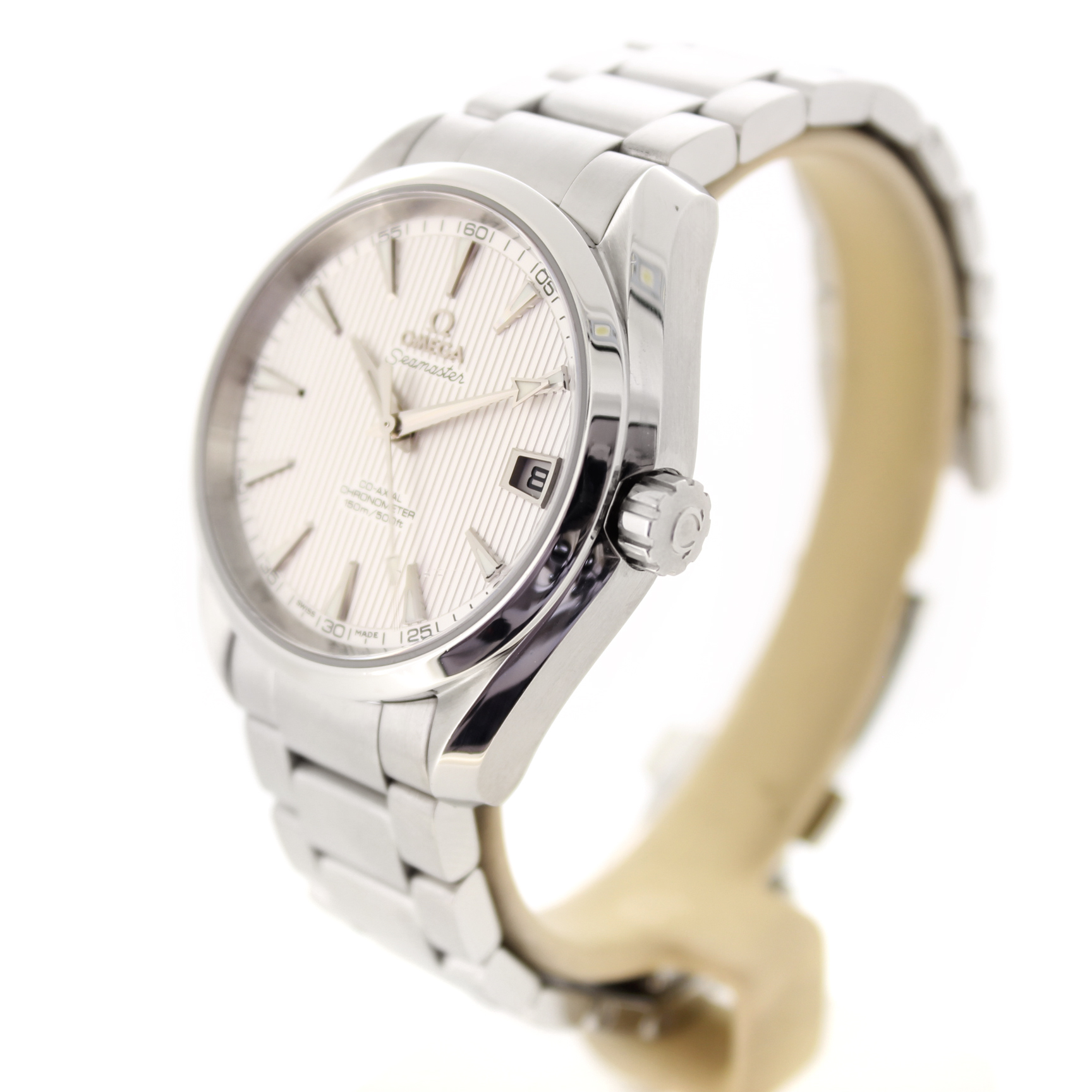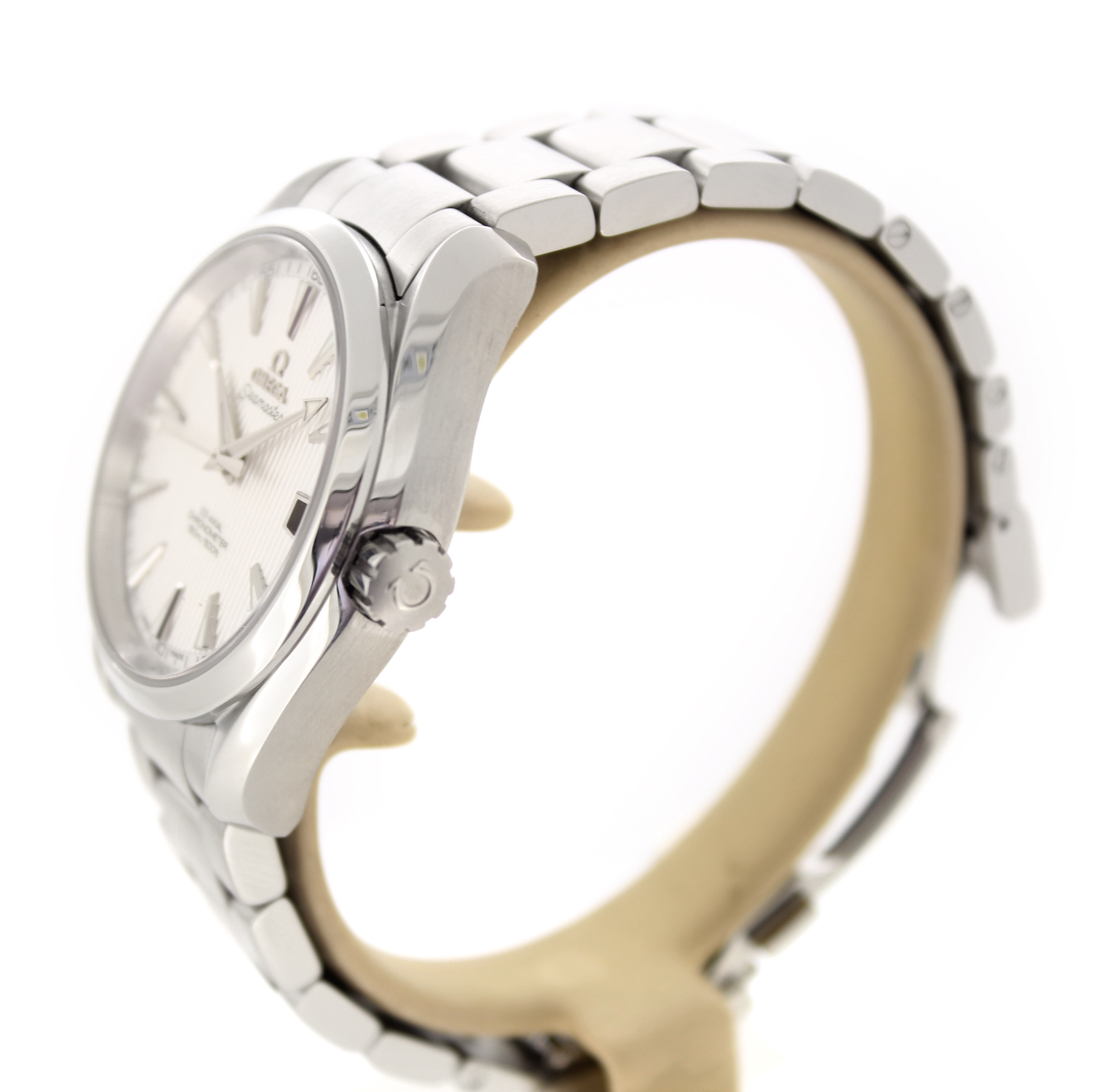 Deze elegante Omega Seamaster Aqua Terra is een perfect voorbeeld van Zwitserse precisie en stijlvolle veelzijdigheid. Het horloge beschikt over een 38.5 mm roestvrijstalen kast met bijpassende zilverkleurige stalen armband, en een verfijnde witte wijzerplaat met datumweergave op 3 uur.