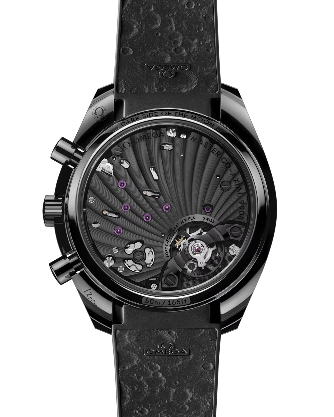 Aan de achterzijde biedt het saffierglas zicht op het indrukwekkende OMEGA Co-Axial Master Chronometer Calibre 9908 Black Edition – een handopwindbaar uurwerk met een mat-zwarte afwerking en een gangreserve van 60 uur. Elk detail, van de ceramised titanium sluiting tot de zwarte rubberen band met maanmotorpatroon, ademt innovatie en precisie.