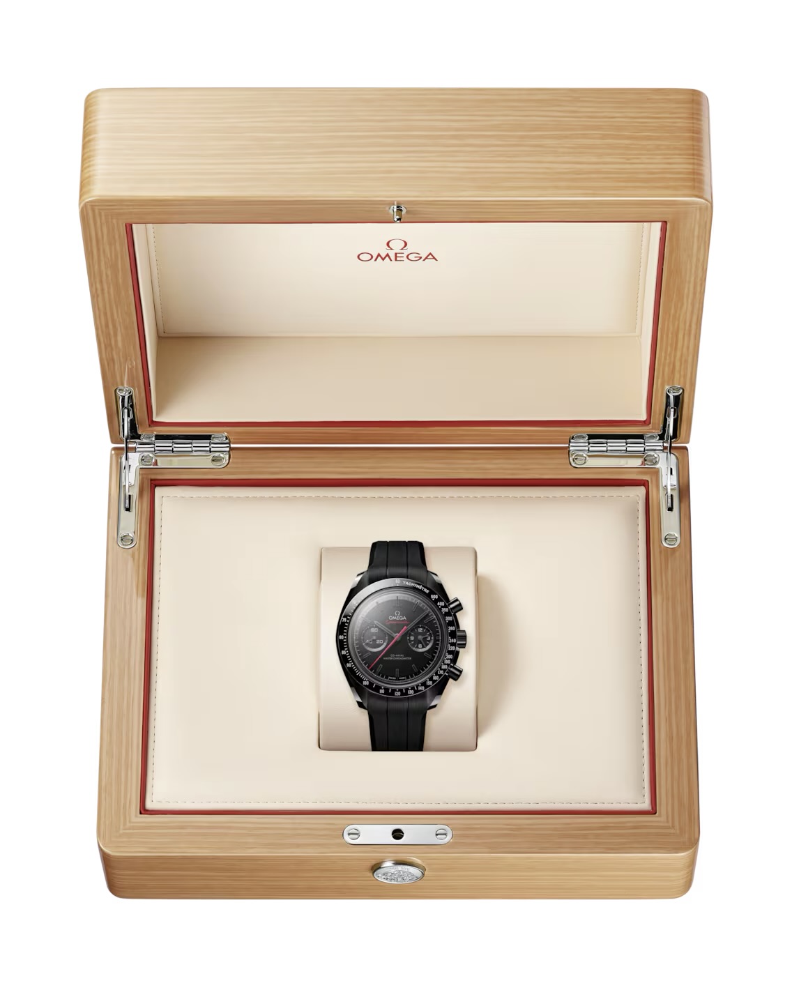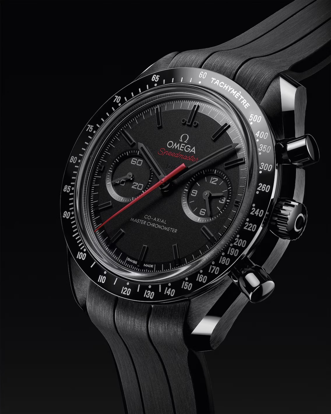 De 44,25 mm kast in gepolijst en geborsteld zwart keramiek vormt een krachtig statement. De zwarte keramische lunette met Liquidmetal™ tachymeterschaal weerspiegelt het technische meesterschap van OMEGA. Onder het dubbelzijdig ontspiegeld saffierglas onthult de laser-gezandstraalde keramische wijzerplaat subtiele diepte en detail. De zwart vergulde wijzers en indexen met zwarte Super-LumiNova zorgen voor perfecte leesbaarheid in het donker, terwijl de rode chronograafwijzer een sportieve toets toevoegt.