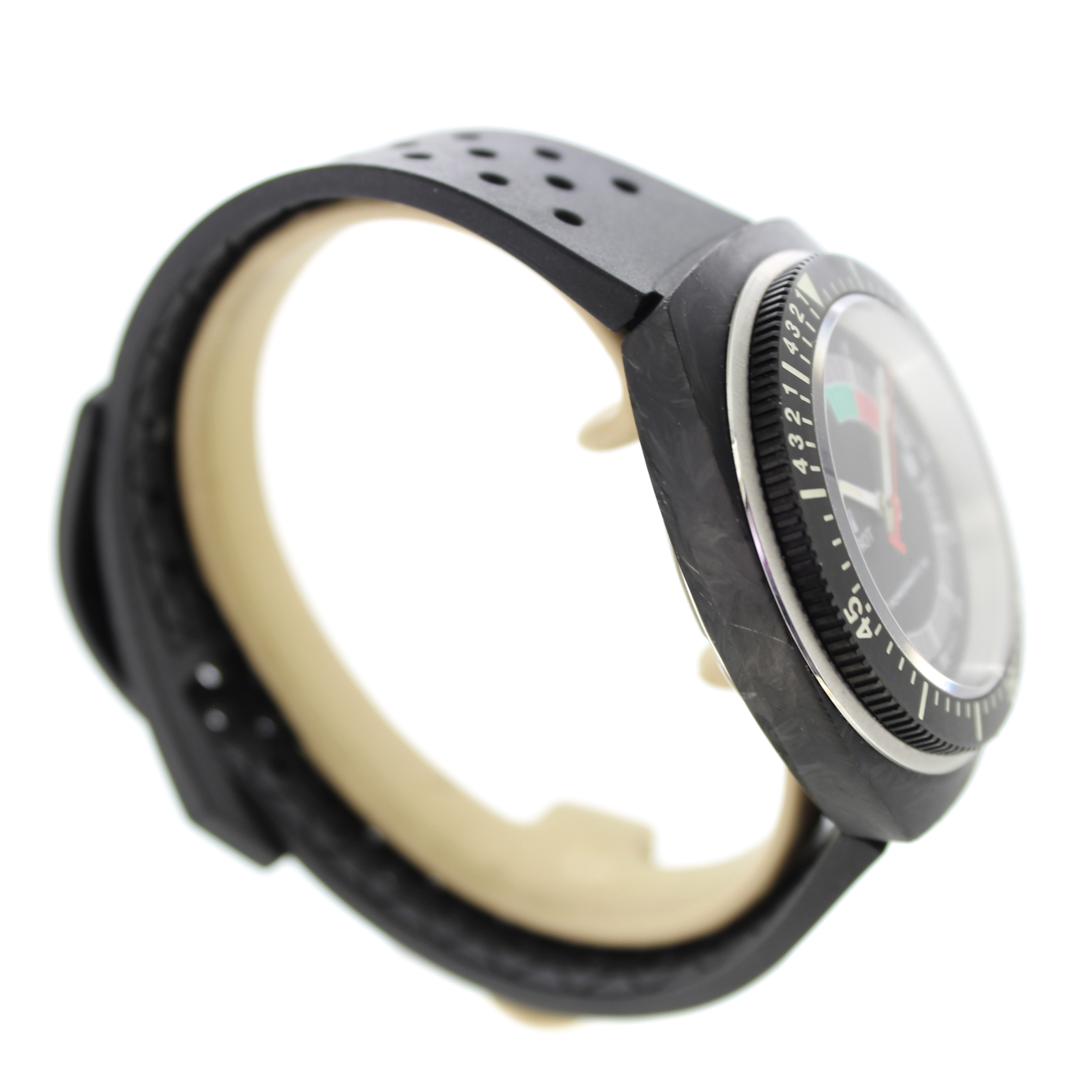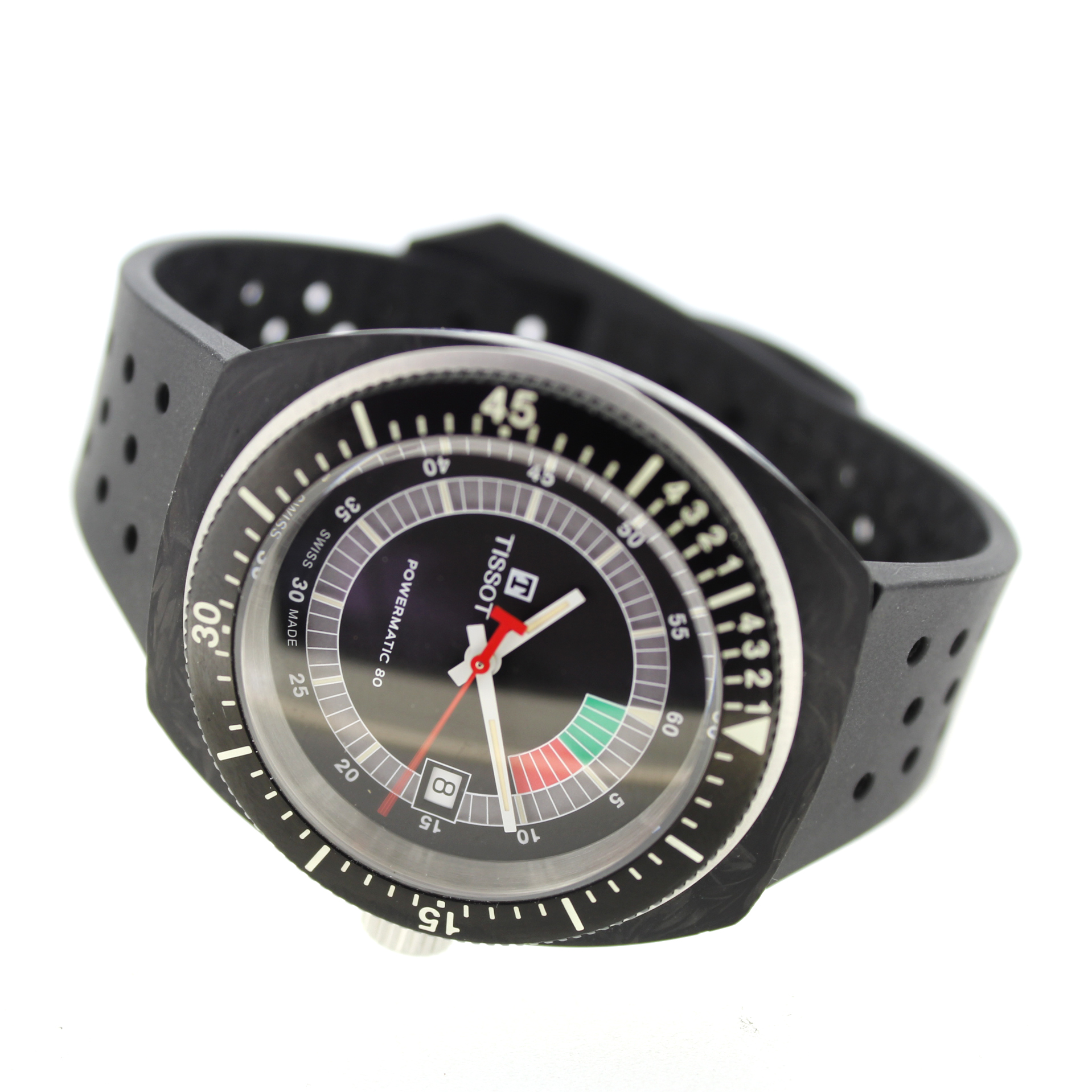 Dit stijlvolle pré-owned Tissot horloge voor heren is een automatisch uurwerk met een diameter van 41 mm. De kast is vervaardigd uit staal met een zwarte carbonlaag, terwijl de zwarte wijzerplaat wordt beschermd door krasbestendig saffierglas. De armband van zwart kunststof maakt het horloge comfortabel en sportief om te dragen.