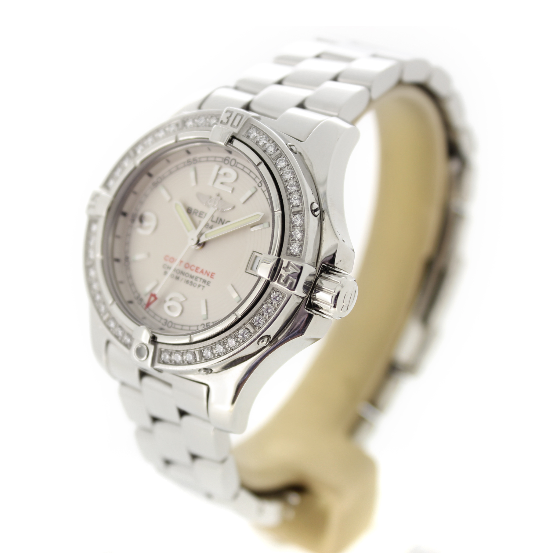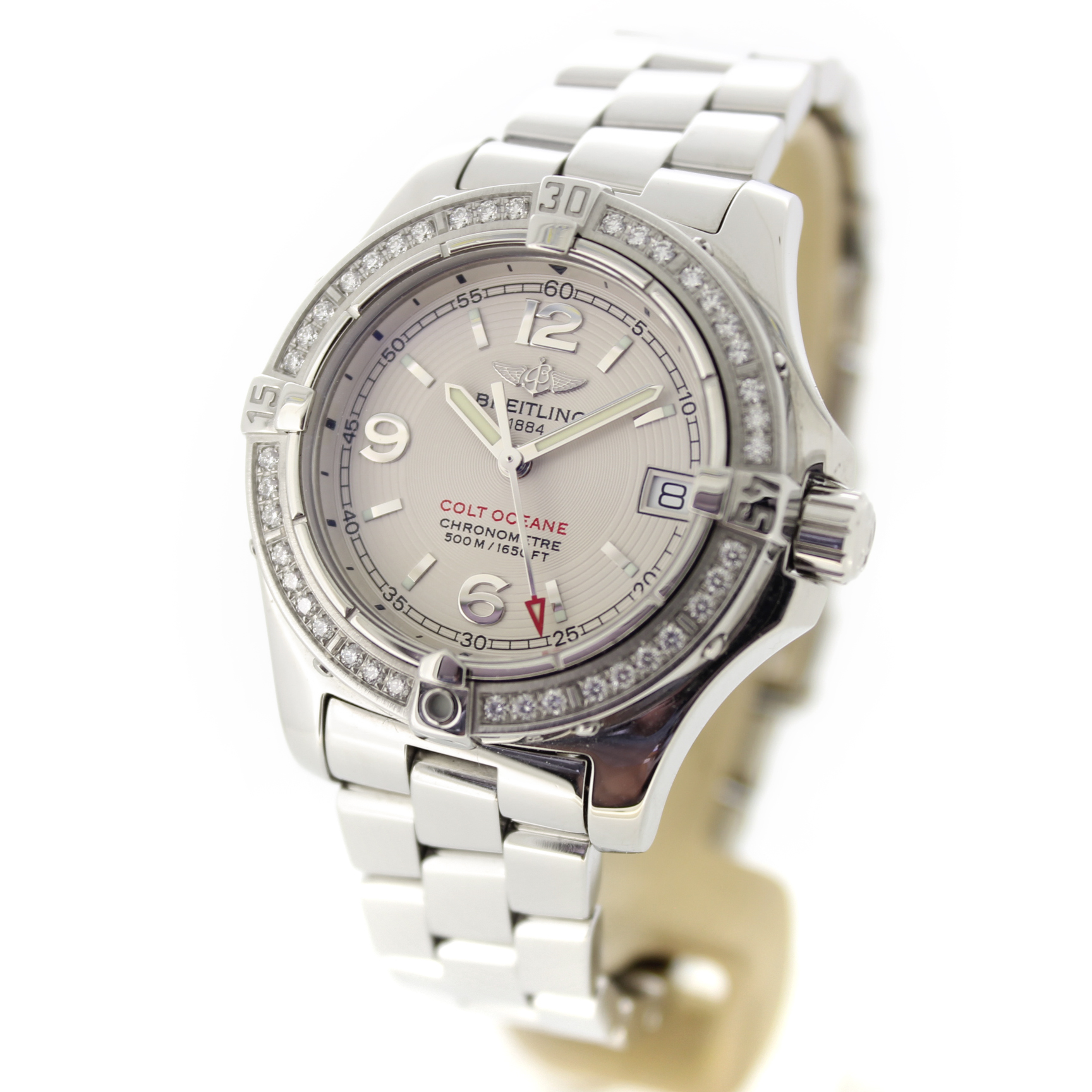 Deze tweedehands Breitling Colt Ocean met referentie A77380 is een elegant quartz horloge in een schitterende conditie. De combinatie van een 33 mm stalen kast bezet met diamanten, een lichte wijzerplaat en een zilverkleurige stalen armband maakt dit horloge een tijdloze en luxueuze keuze.