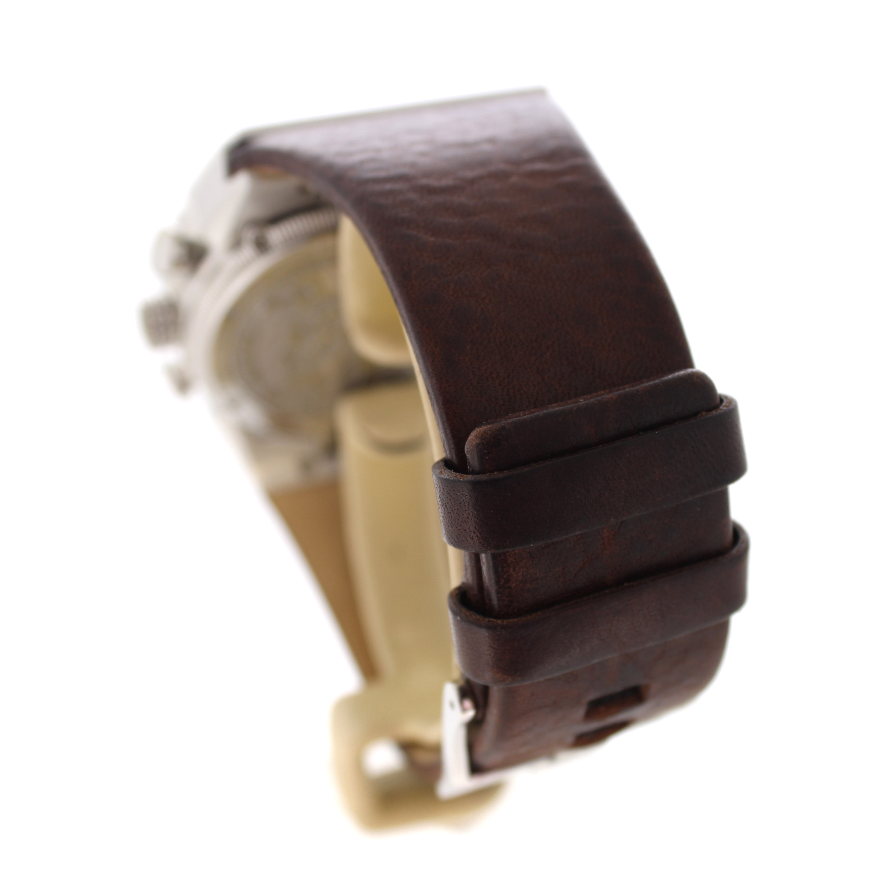 Dit tweedehands Diesel horloge, referentie DZ9053, is uitgevoerd met een robuuste zilverkleurige stalen kast en een stijlvolle bruine leder armband. De bruine wijzerplaat is voorzien van een duidelijke datumaanduiding en chronograaf, wat zorgt voor een harmonieus en functioneel ontwerp.