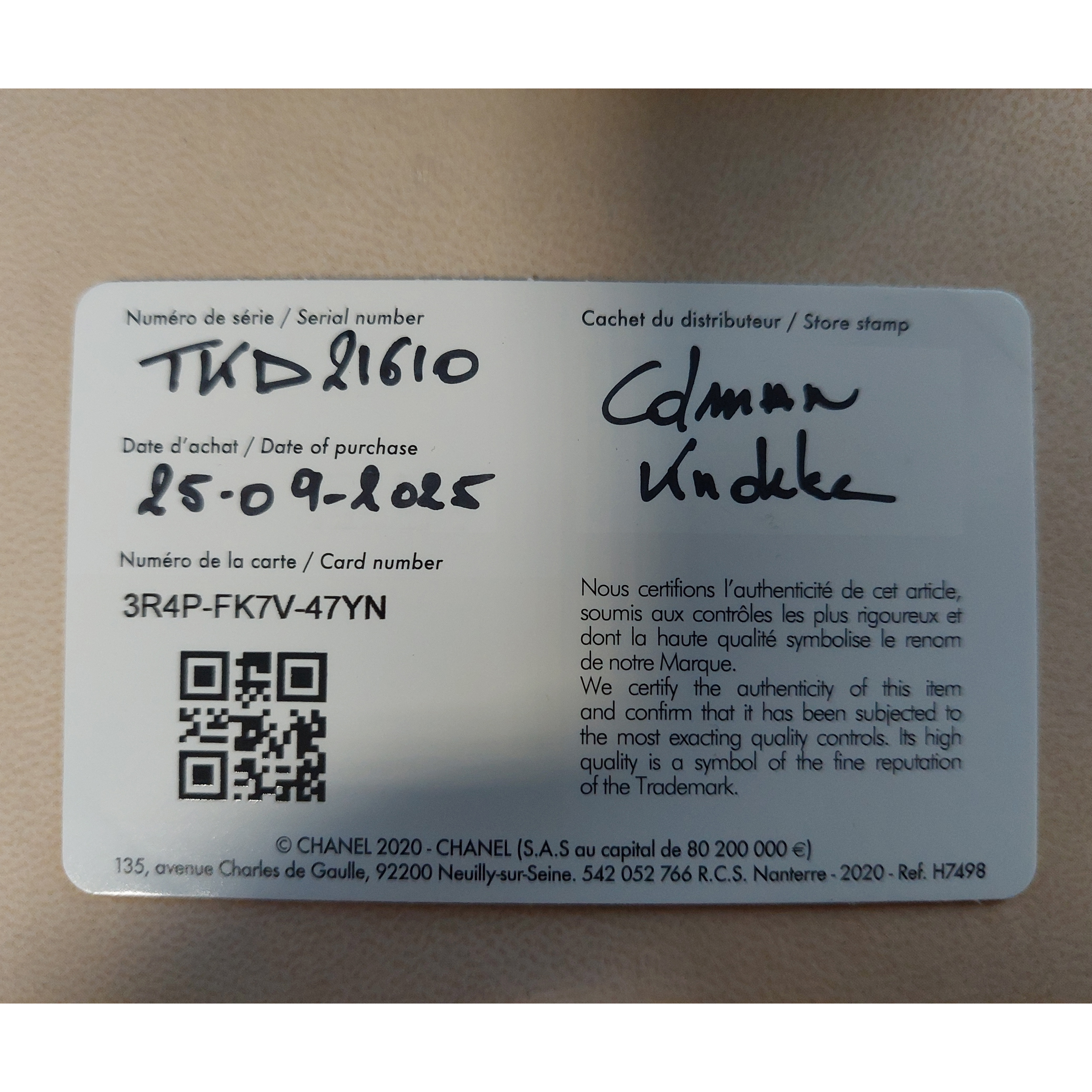 Het horloge is in een perfecte, nooit gedragen conditie en wordt geleverd met de originele Chanel doos en documenten. De aankoopdatum is 25/09/2025.