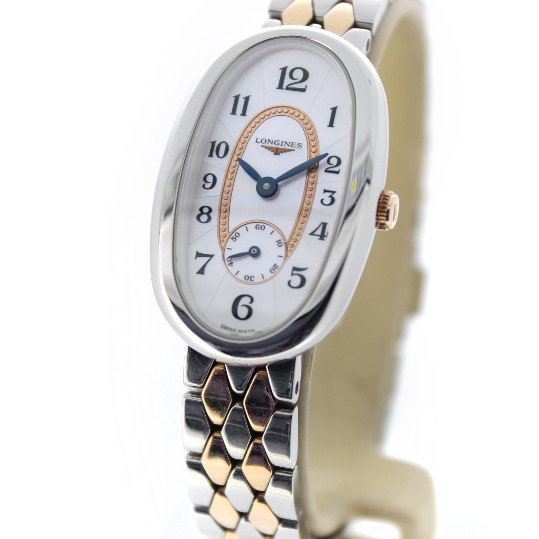 Het tweedehands Longines symphonette L2.306.5.83.7 horloge heeft een 21.9 x 34 mm staal kast en bicolor staal met rosegouden armband. Het horloge heeft een parelmoer wijzerplaat met saffierglas.