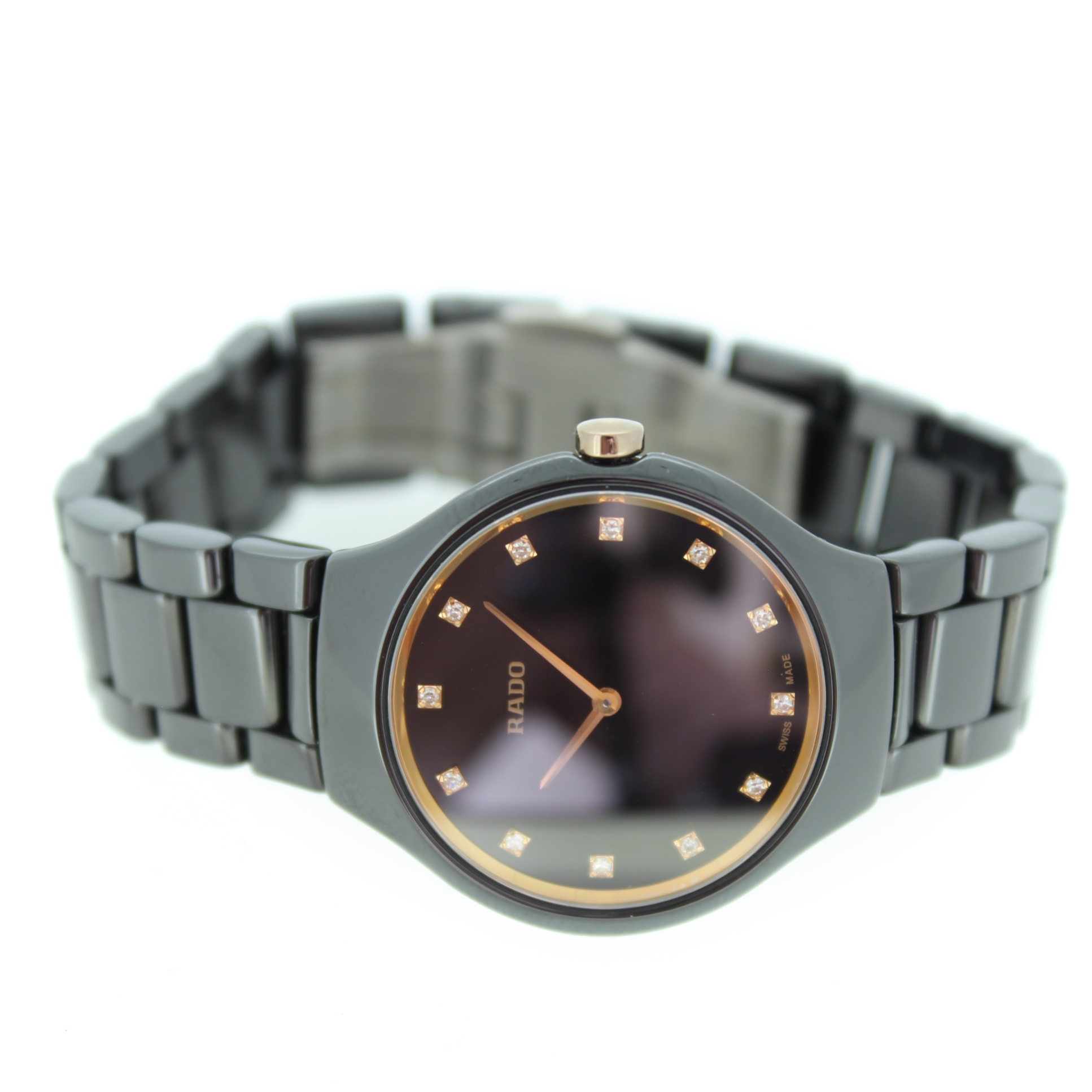 Het tweedehands Rado True Thinline horloge met de referentie R27742722 heeft een zwarte kast en armband uit keramiek. Het horloge heeft een zwarte wijzerplaat met diamanten indexen, deze wordt beschermd door een saffierglas.