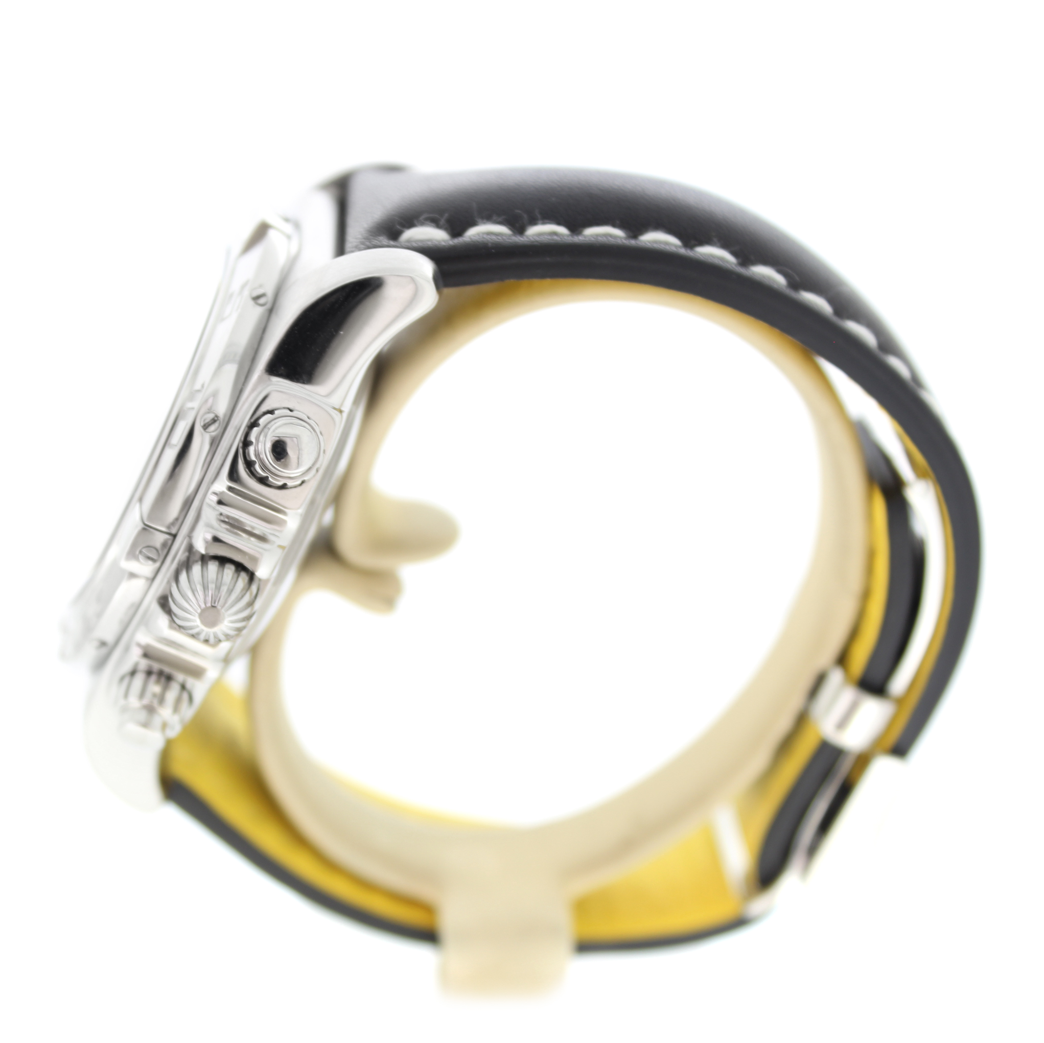 Deze Breitling Chronomat 44 met referentie AB0110is een sportief en robuust automatisch herenhorloge, momenteel tweedehands te koop bij Juwelier Clem Vercammen. Het horloge is uitgerust met een 44 mm roestvrijstalen kast, een zwarte wijzerplaat en een zwarte leder armband. Deze combinatie zorgt voor een krachtige en dynamische uitstraling.