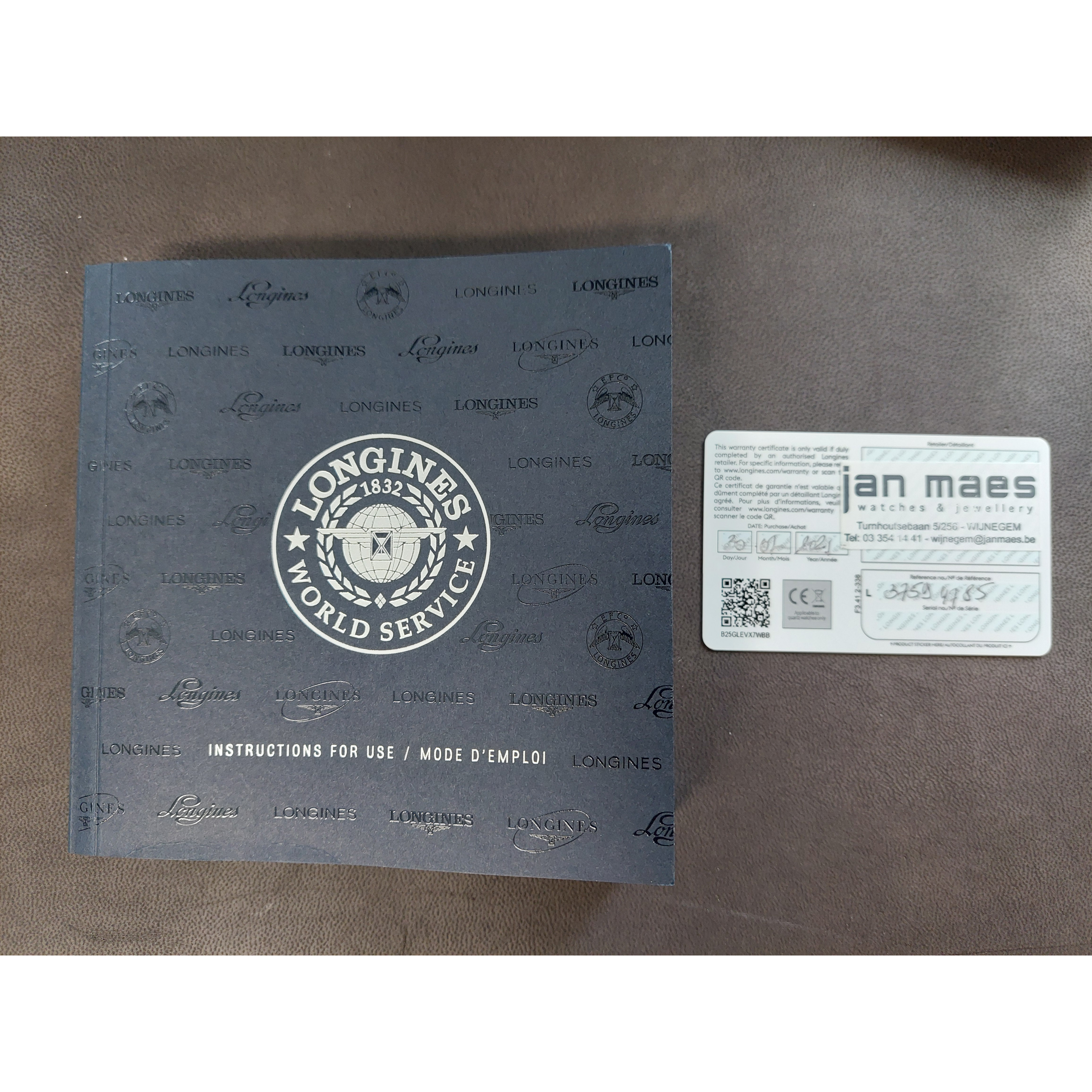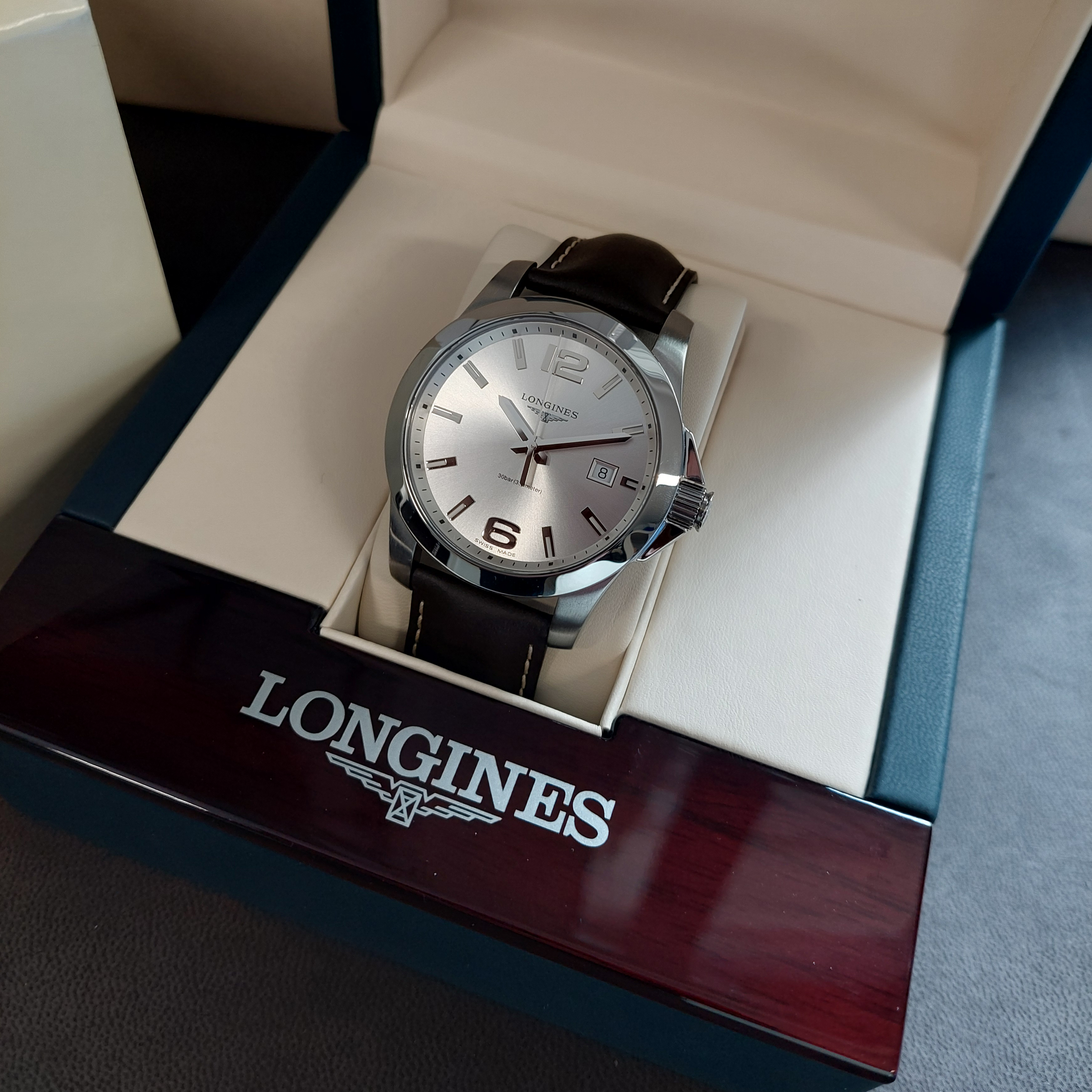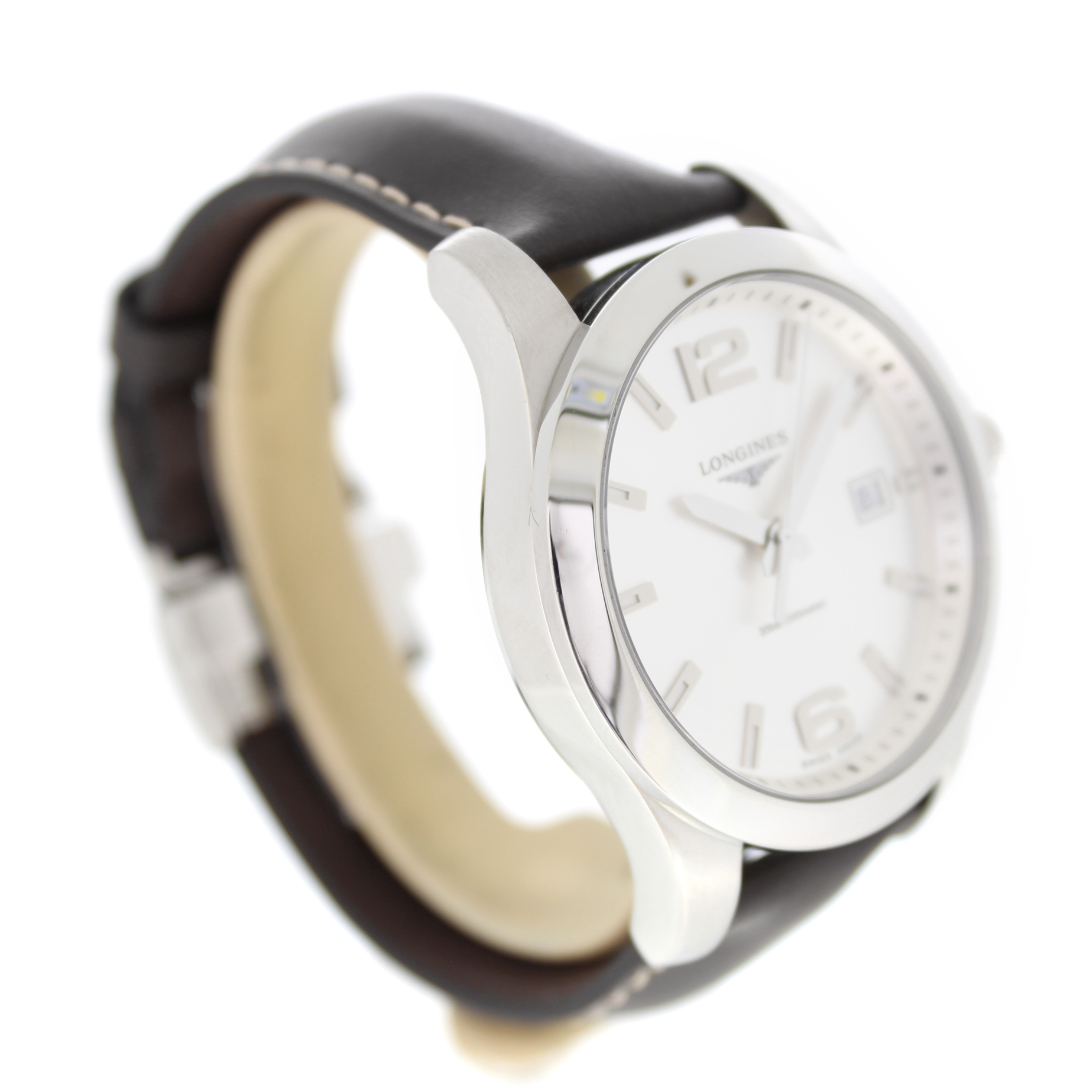 Het tweedehands Longines Conquest L3.759.4.78.5 horloge heeft een 43 mm staal kast en bruin leder armband. Het horloge heeft een zilverkleurige wijzerplaat met een datum aanduiding.