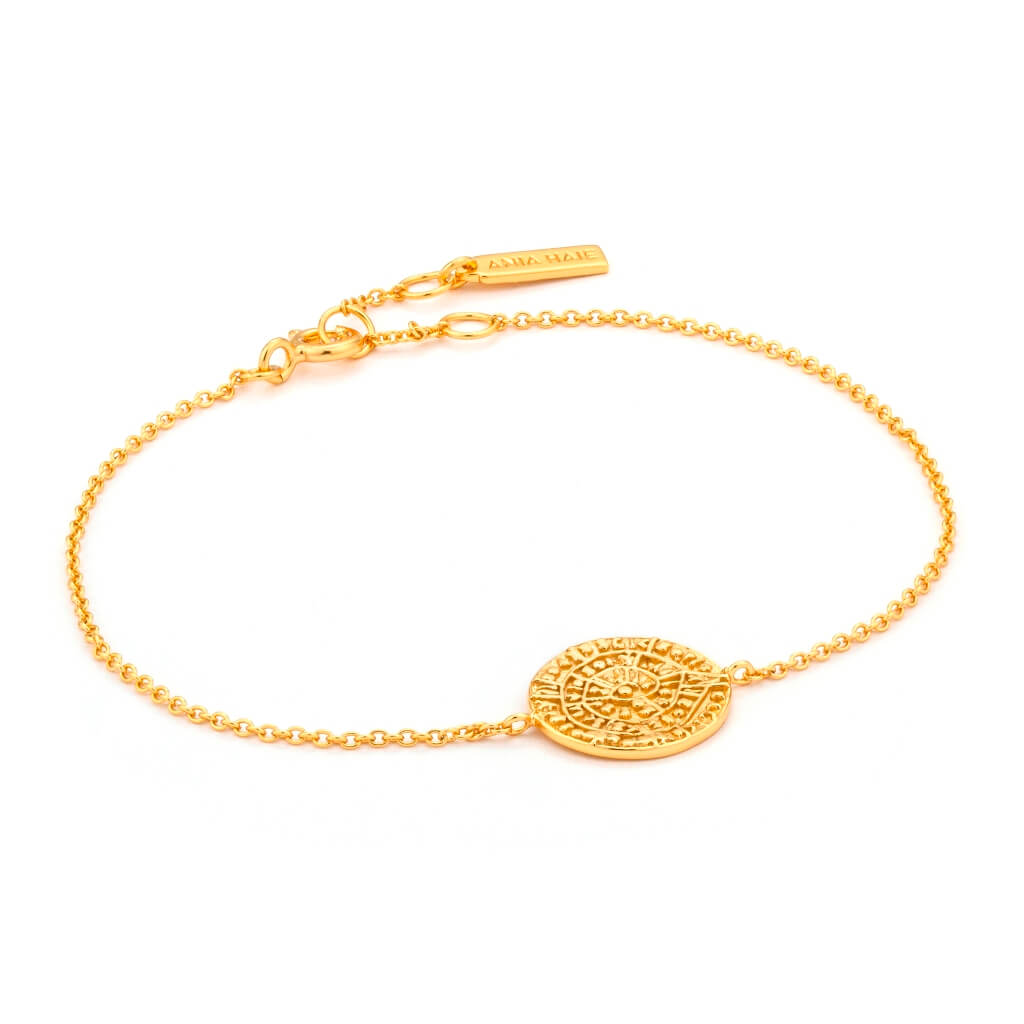 Ania Haie juweel B009-04G is een armband vervaardigd uit zilver 925 belegd met 14K geelgoud. Centraal aan de armband is een muntstuk. De armband heeft een lengte van 16,5cm met 2cm extra speling. U kan ook uitkijken naar een bijpassend juweeltje.