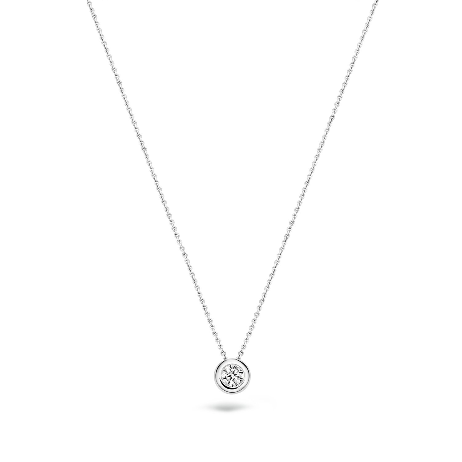 De 14 karaats witgouden collier van Blush 3052WZI heeft een rond vormgegeven hanger die bestaat uit een briljant geslepen witte Zirkonia met een diameter van 5 millimeter, geplaatst in een 14 karaats witgouden gladzetting. Dit 42 centimeter Blush collier sluit met karabijnsluiting.