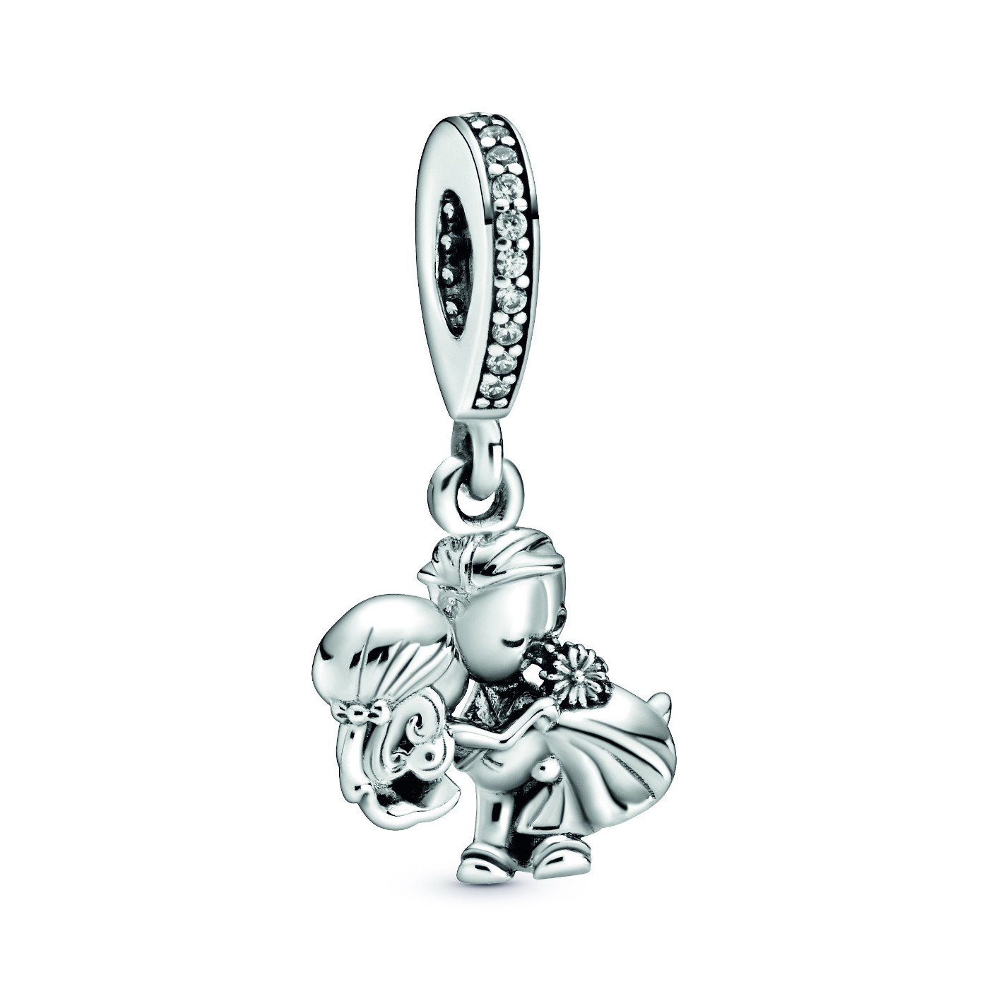 Deze Pandora bedel met referentie 798896C01 maakt deel uit van de Pandora People collectie. De romantiek van je 'I do' leeft voort in deze emotionele bedel met kussend pasgetrouwd stel. De bruidegom houdt zijn bruid teder vast, zij heeft bloemen in haar handen en het bovendeel van de bedel is bezet met heldere zirkonia. Deze Charm is vervaardigd uit zilver 925.