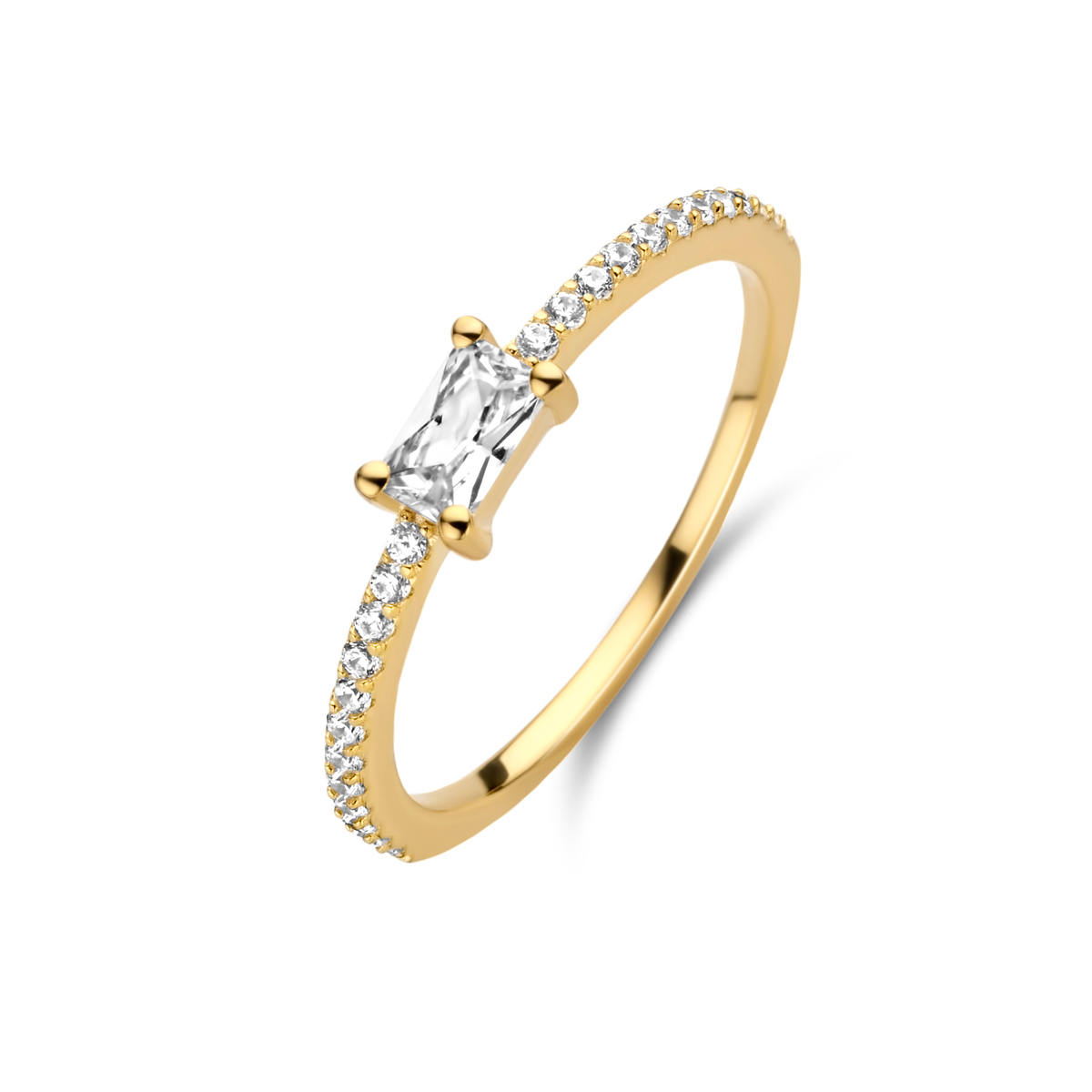Dit Naiomy Moments juweel B0O07 is een geelgoud verguld zilveren ring gezet met een baguette zirconium steen en extra, kleine steentjes op de boord. U kan ook uitkijken naar een bijpassend juweeltje.
