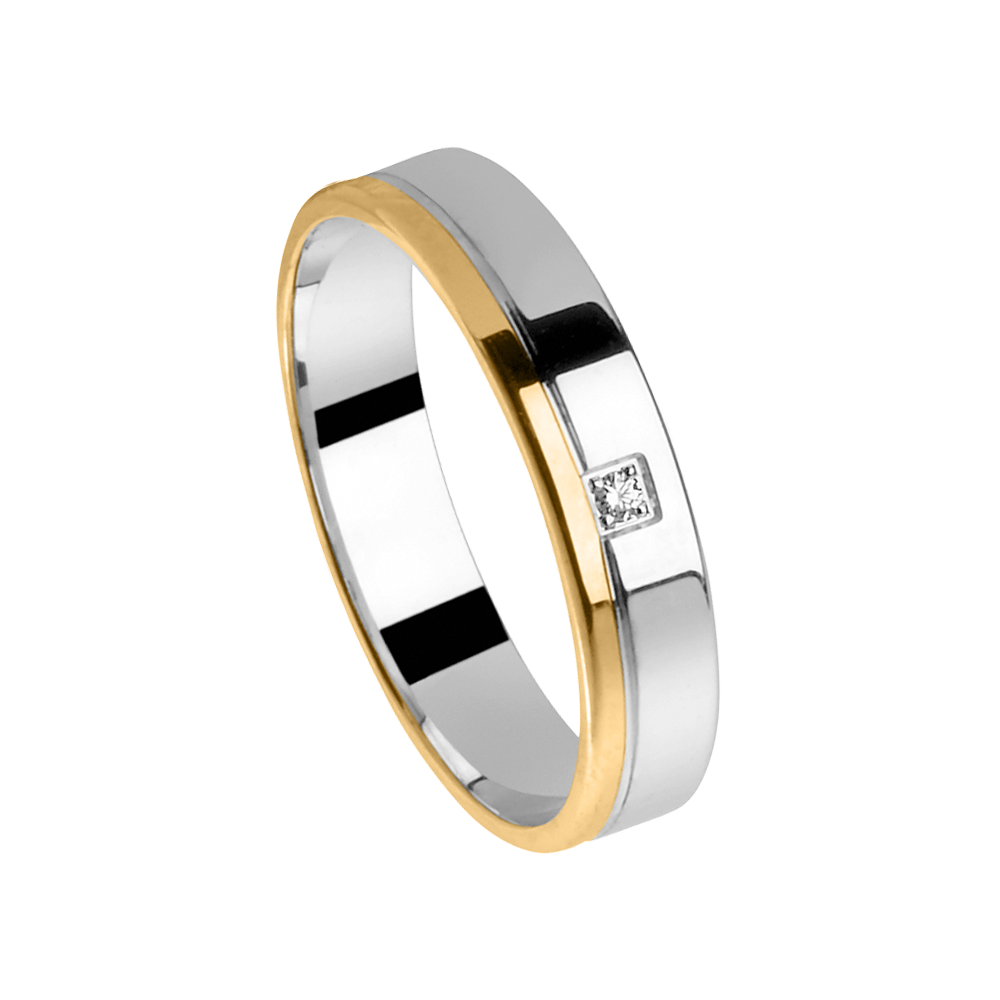 Deze trouwring of vriendschapsring 5729-B/40 uit de Amici collectie is een bicolor gouden 18 karaat trouwring in hoogglans afwerking gezet met een 0.01ct briljant (VS/Si -- G/H) in 4 griffen zetting. De ring heeft een boord van 4 mm diameter.