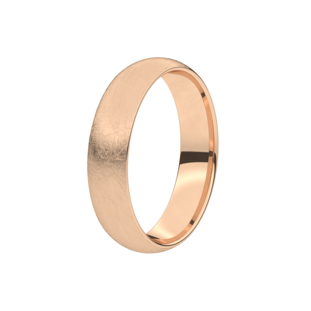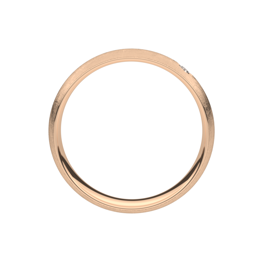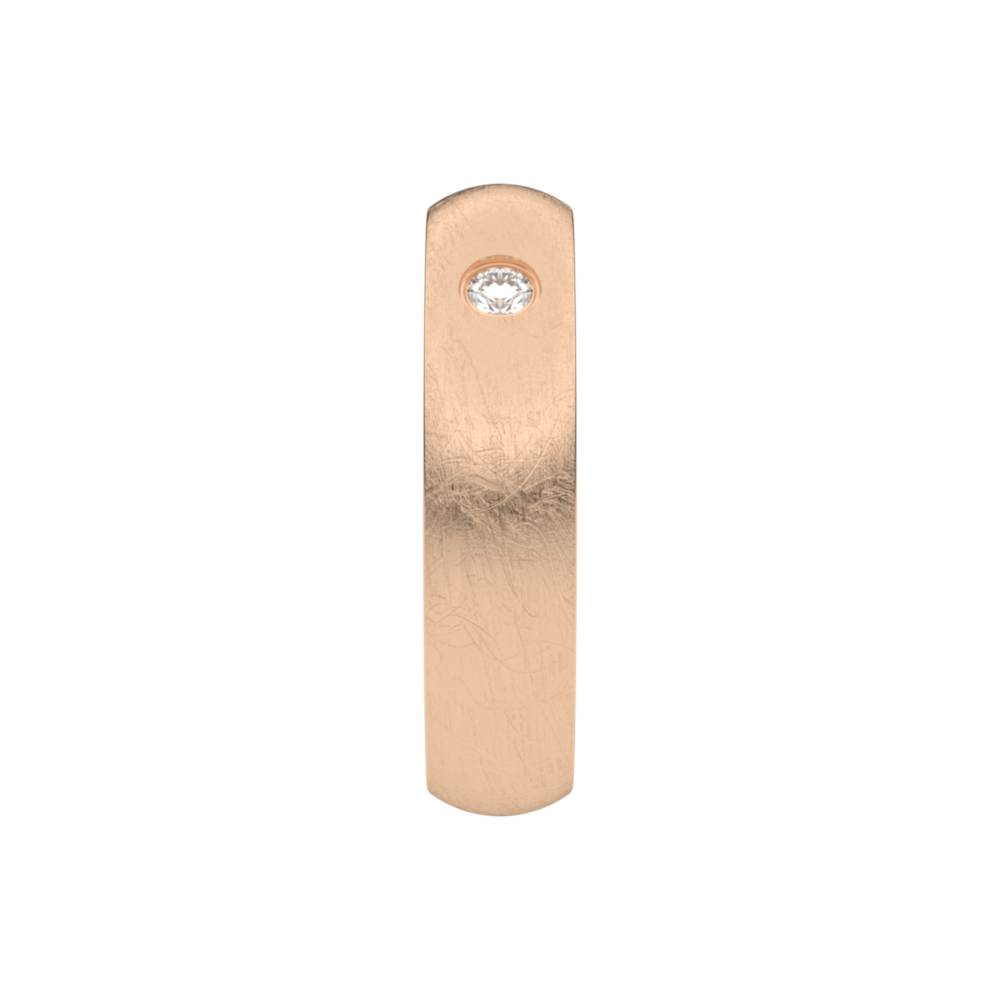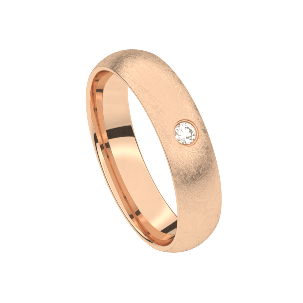 Deze trouwring 5T166BR/50 uit de Traditions collectie is een rosegouden ijsmat trouwring in 18 karaat goud (maar ook verkrijgbaar in 9 en 14 karaat goud) en heeft een ronde boord van 5mm breedte en 1.6mm dikte en is gezet met één briljant 0.05ct per diamant (zetting B - overklopt). De ring is zacht bol.
