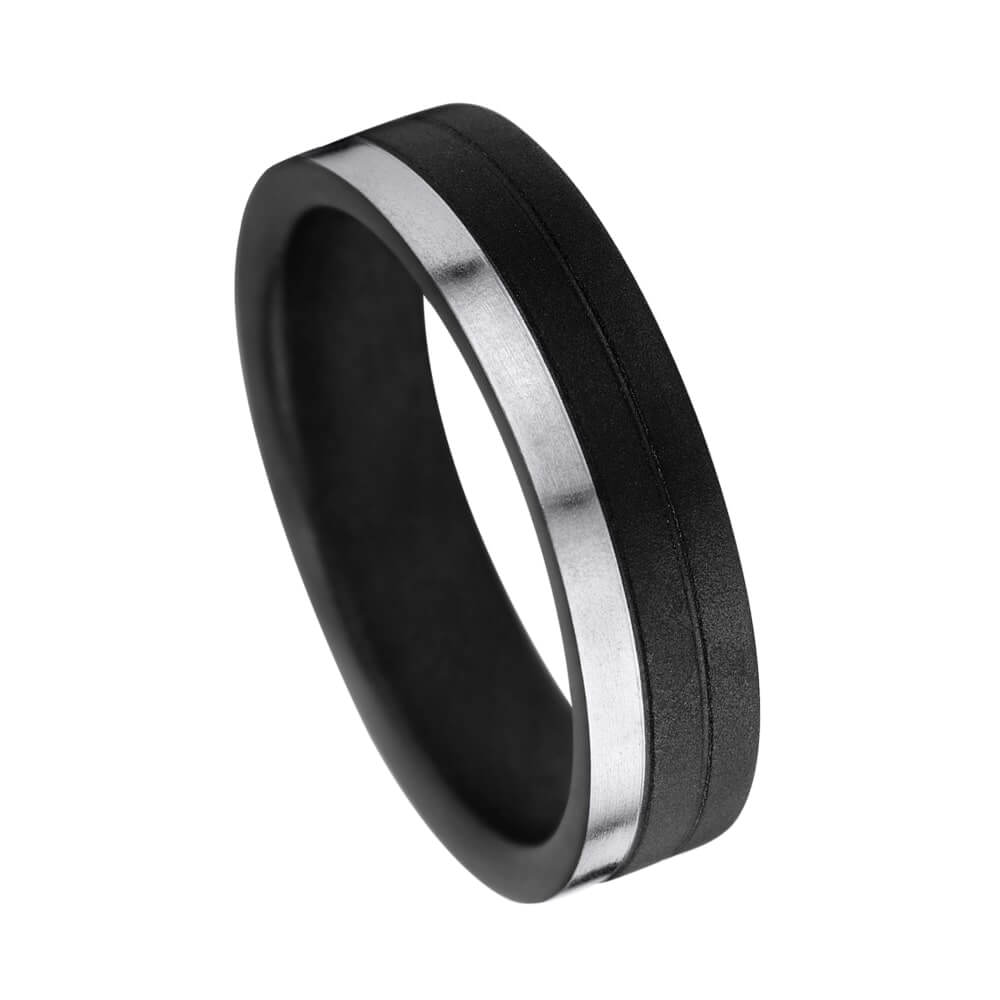 Deze trouwring of vriendschapsring 5621-XS/60 uit de Amici collectie is een parelmat gemateerd black steel en langsmat gematteerd stainless steel trouwring. Deze ring heeft een boord van 6mm diameter.